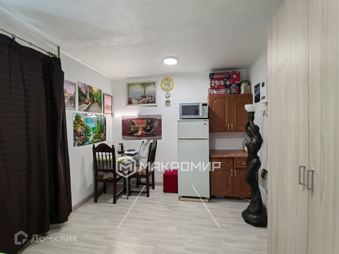 Хорошее состояние: окно пластиковое, линолеум на полу, белые обои под покраску, на потолке плитка. Шкаф и холодильник оставляем в ПОДАРОК.