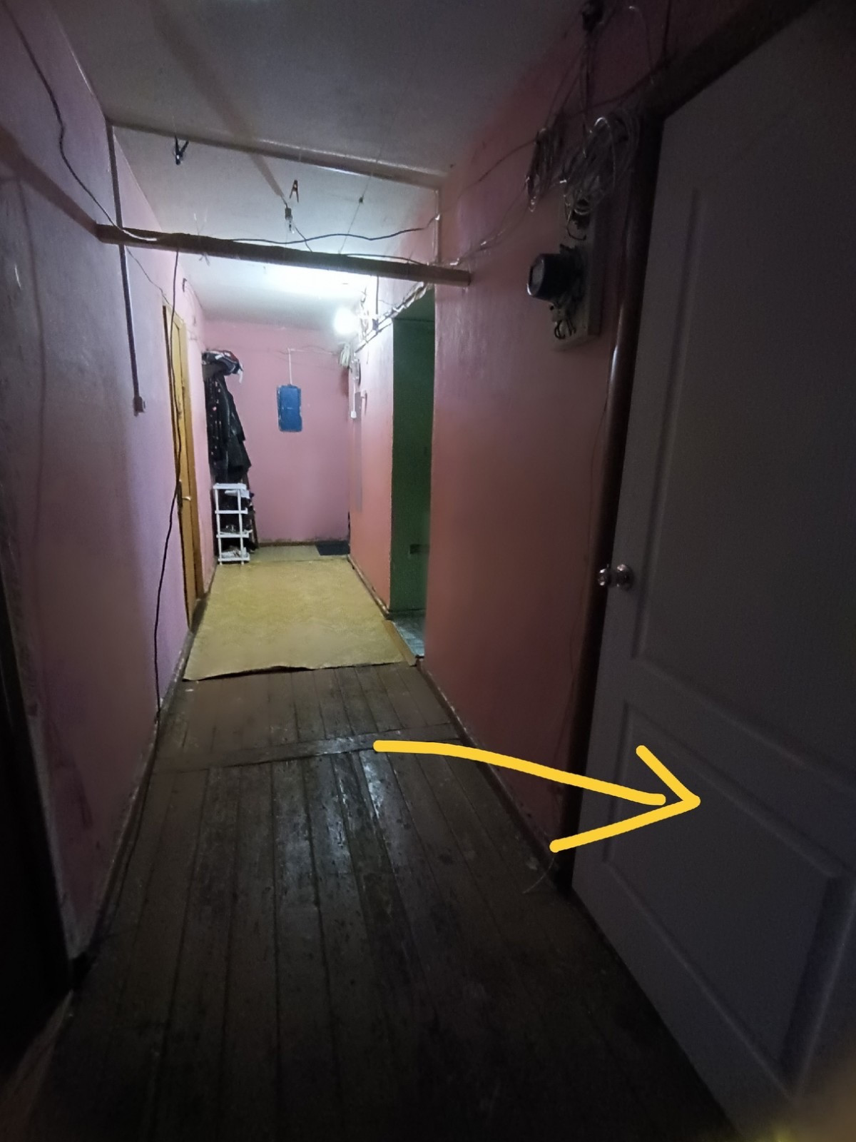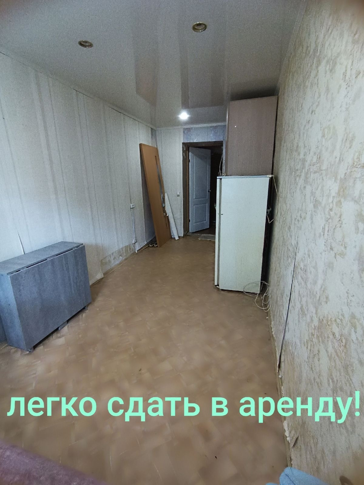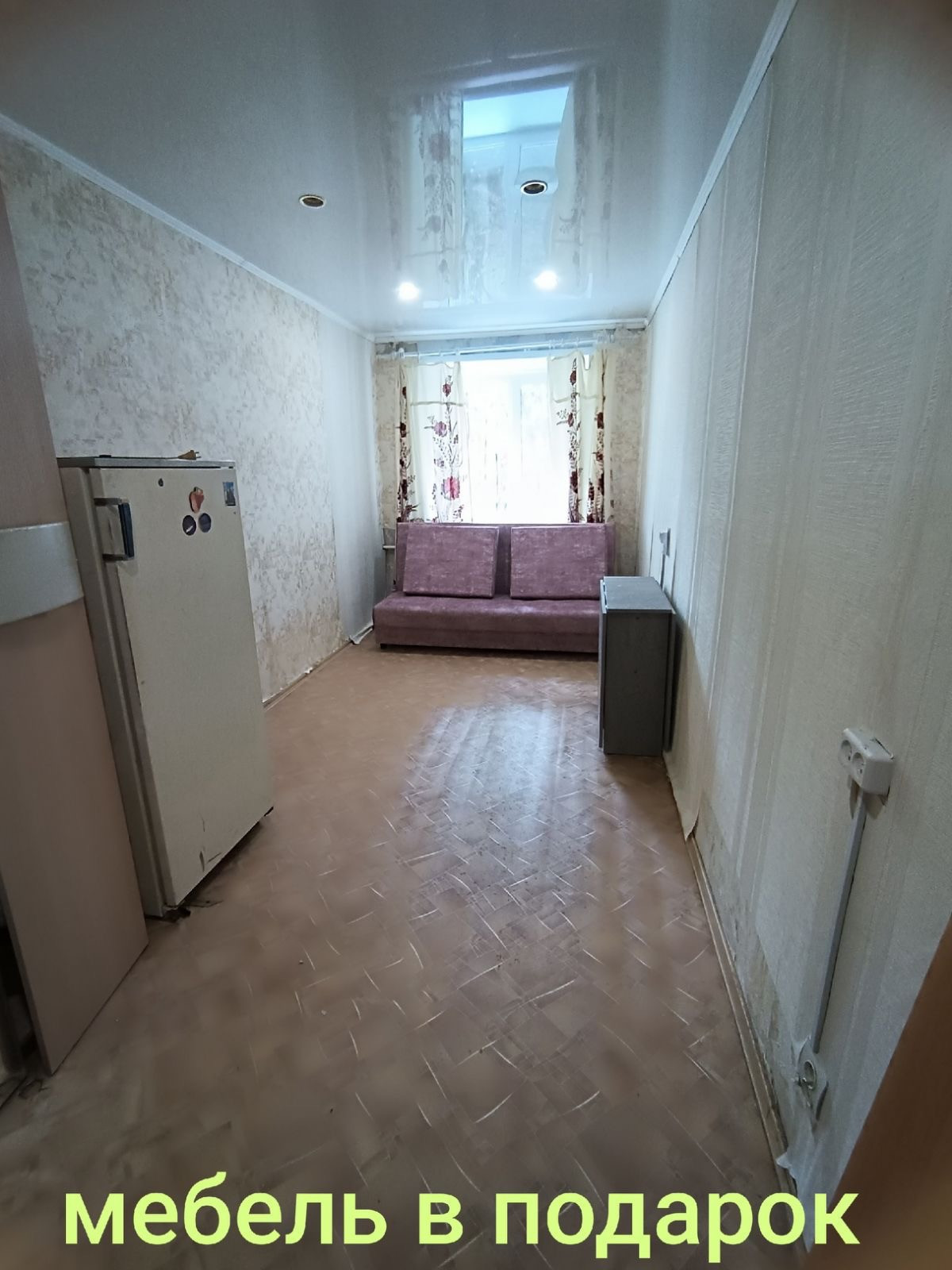 В комнате остается новый диван, новый стол раскладной, большой шкаф, холодильник старого образца.
