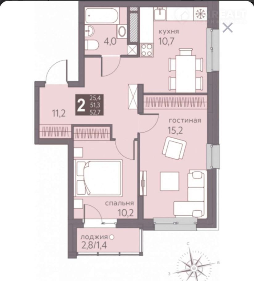 Общая площадь 52.7 м2