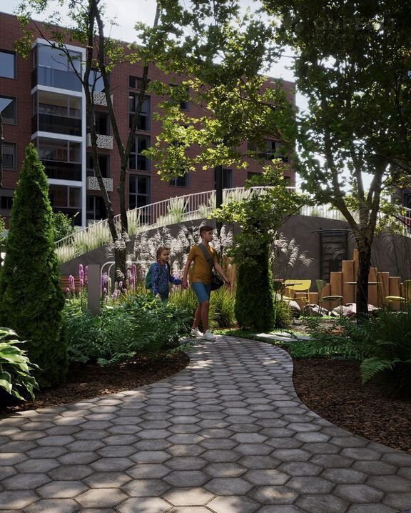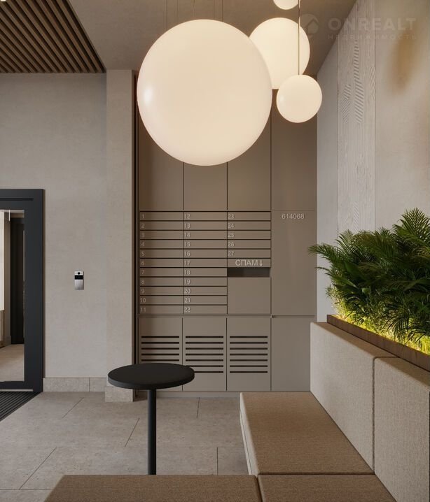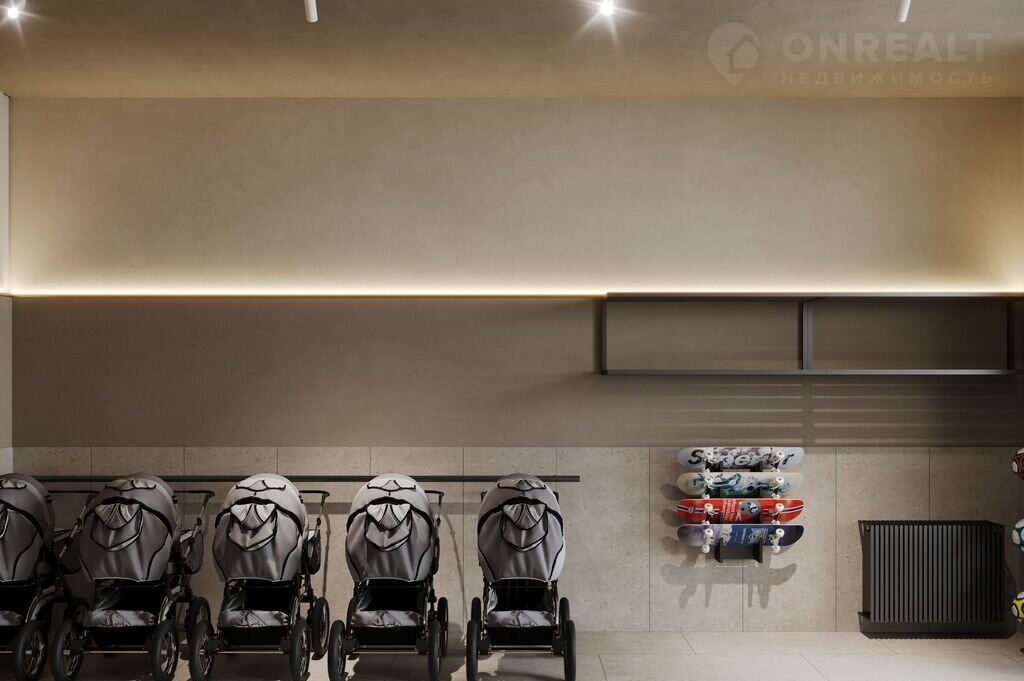 Концепция проекта продолжается интерьером лобби. Здесь преобладают естественные оттенки и текстуры, а мебель выполнена из экологичных материалов. Для удобства жителей созданы собственные колясочные и велосипедные, а для заботы о домашних любимцах предусмотрена лапомойка.