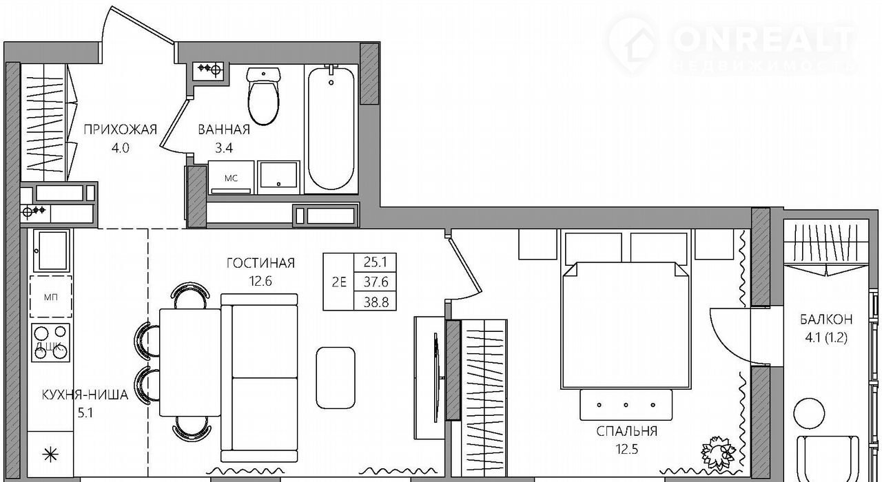 Общая площадь 38.8 м2