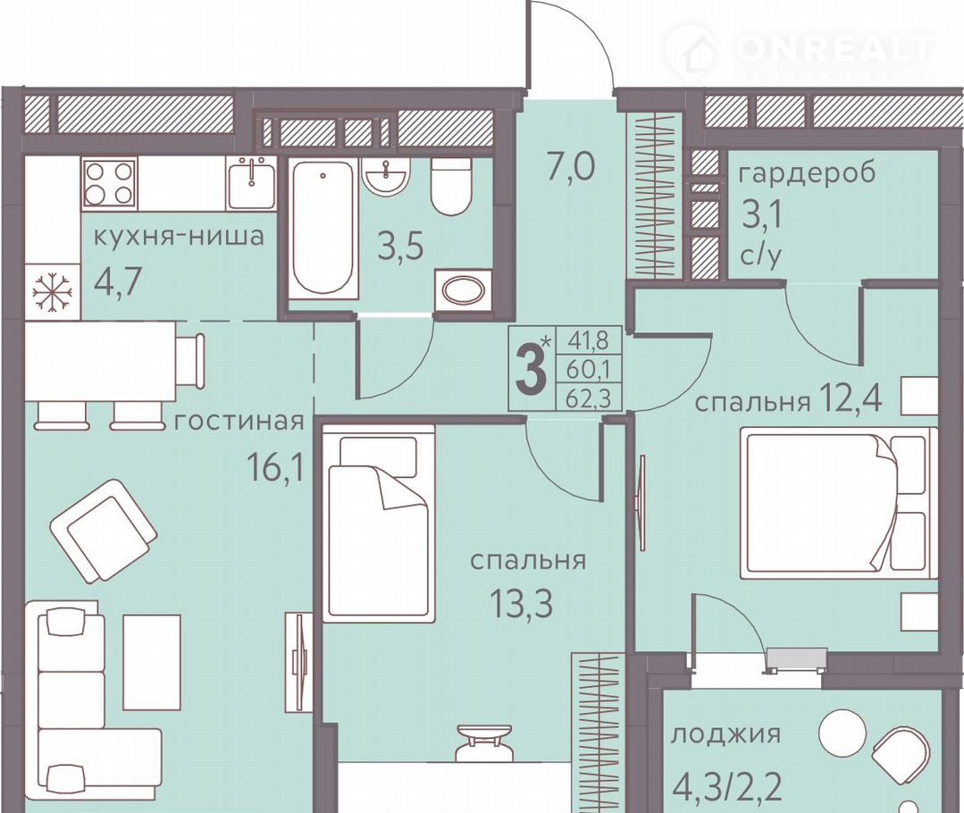 Общая площадь 62.3 м2