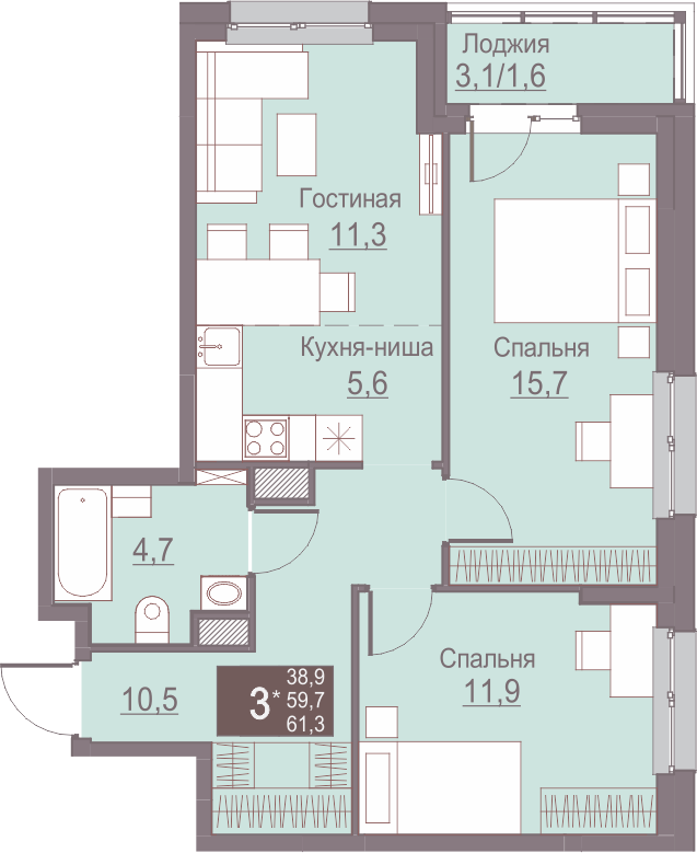 Общая площадь 61.3 м2