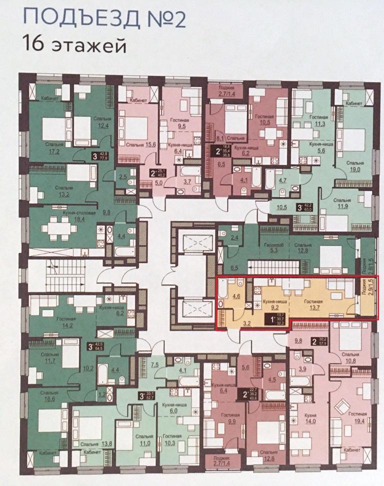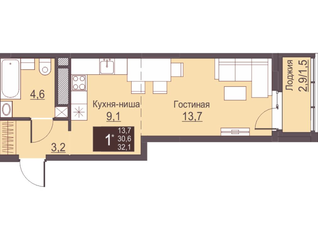 Площадь квартиры без лоджии 30,60 кв.м. Планировка смежная: кухня-ниша – 9,1 кв.м., гостиная- 13,7 кв.м., санузел совмещенный. Лоджия застеклена. Качественная отделка от застройщика!