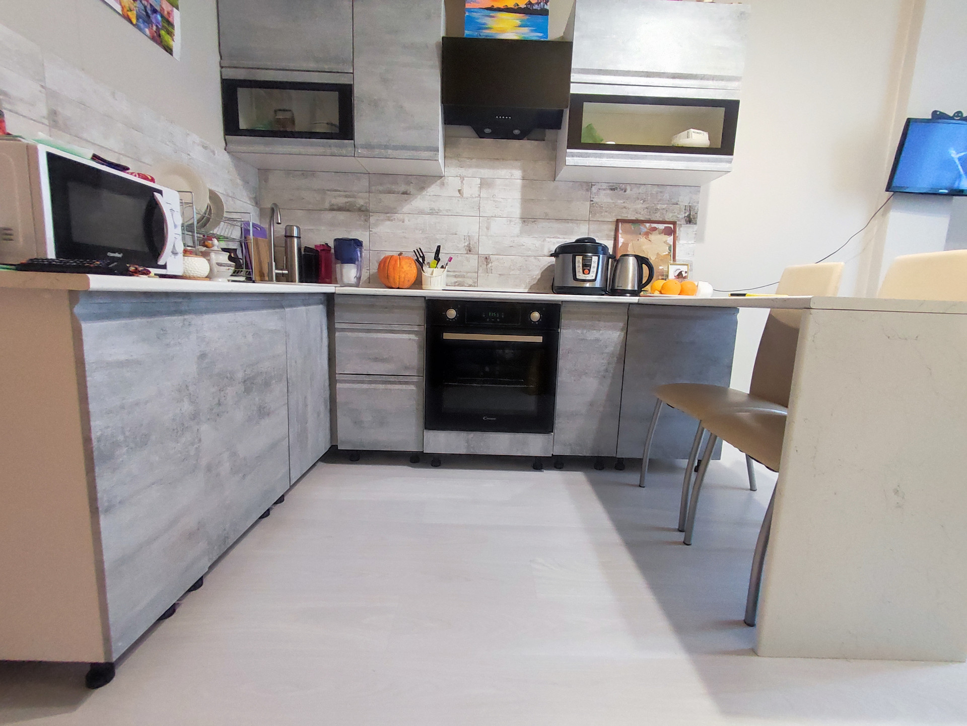 Просторная кухня-гостиная укомплектована современным встроенным гарнитуром с бытовой техникой, варочная поверхность, духовой шкаф, вытяжка.