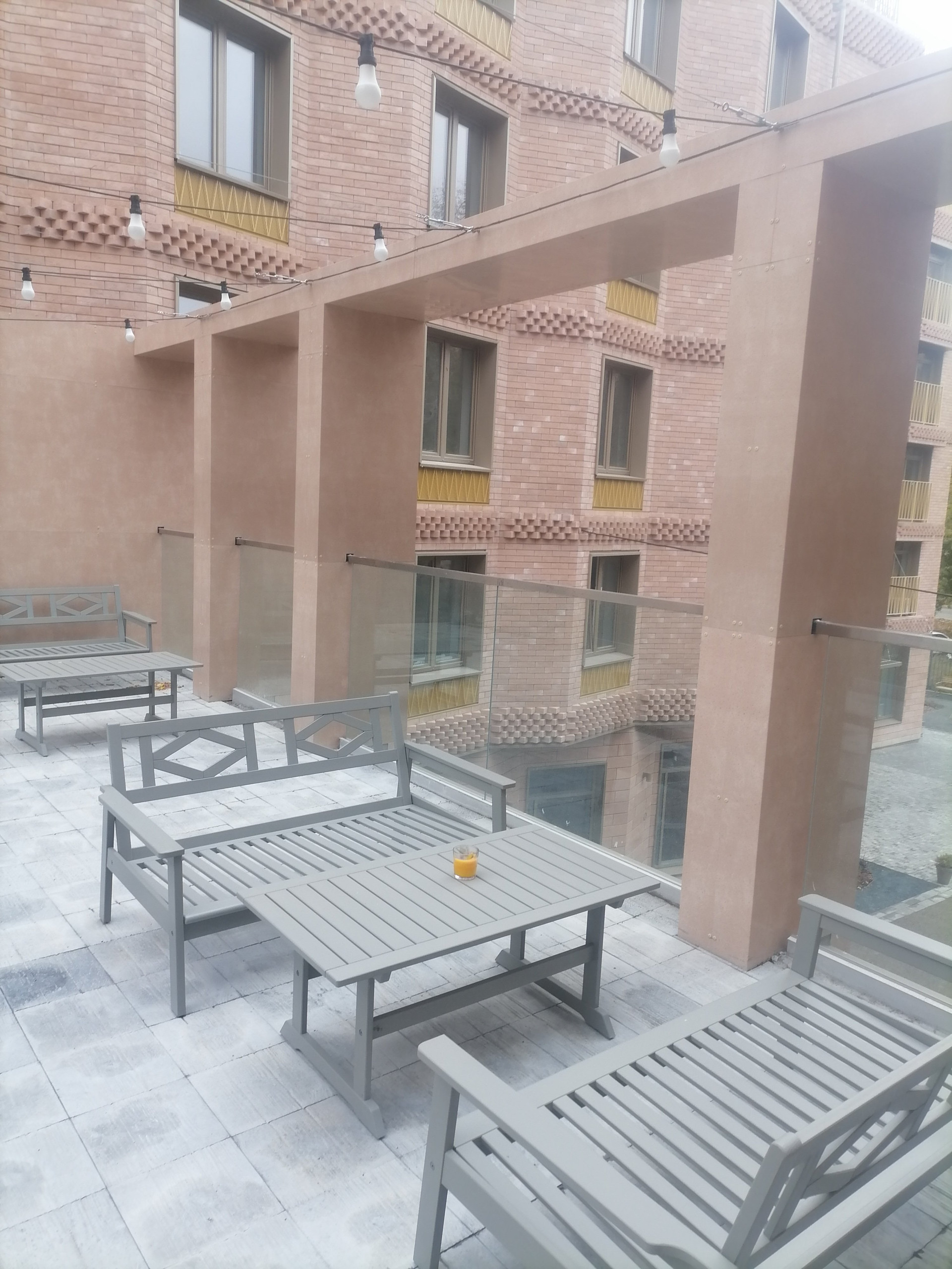 В стеклянном лобби, соединяющем две секции, расположена терраса, на которой можно будет устраивать обеды под открытым небом или просто посидеть с книжкой или ноутбуком на свежем воздухе.