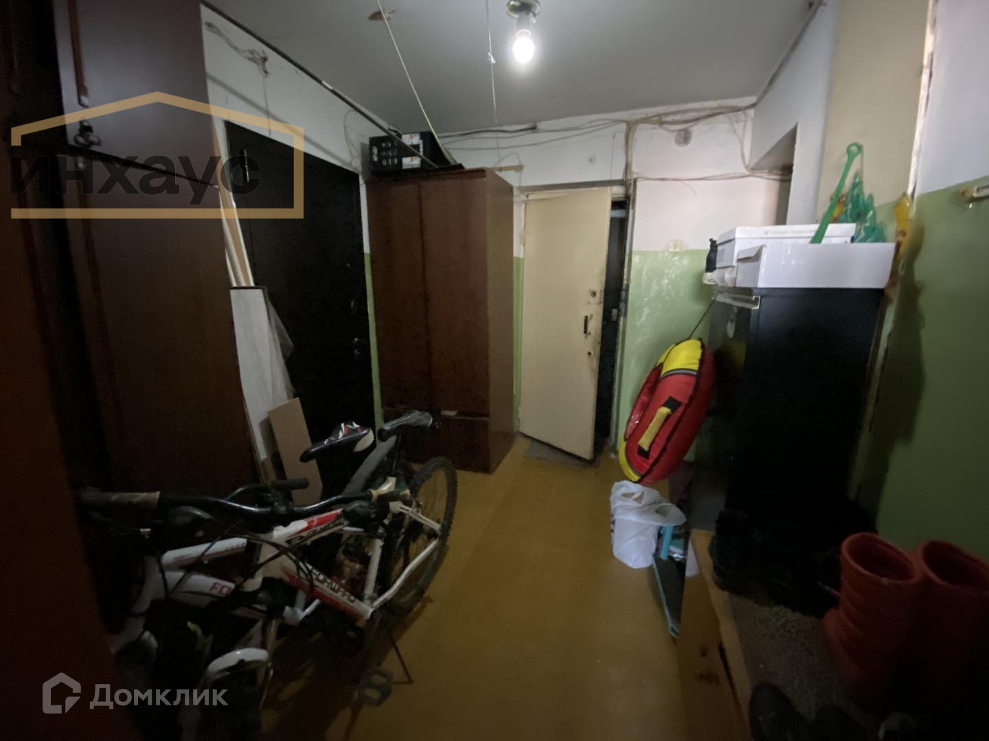Есть общая кухня на три квартиры. В общей прихожей есть шкаф для хранения.