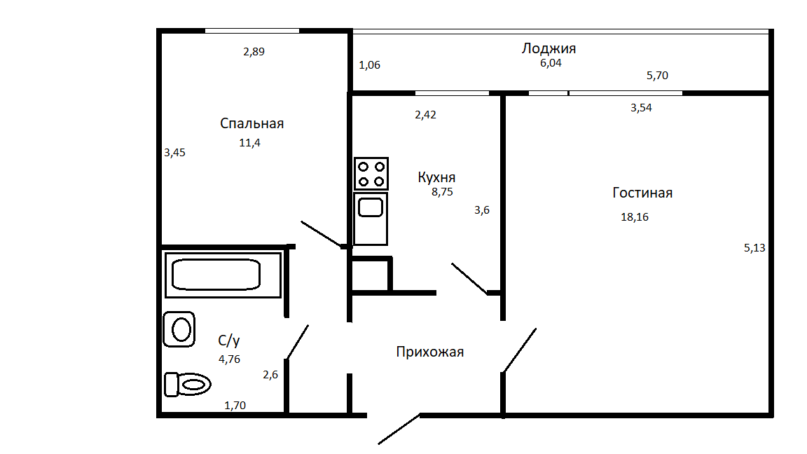 - Просторная лоджия 5,7 м х 1,06 м, которую можно застеклить, утеплить и использовать как дополнительное пространство
