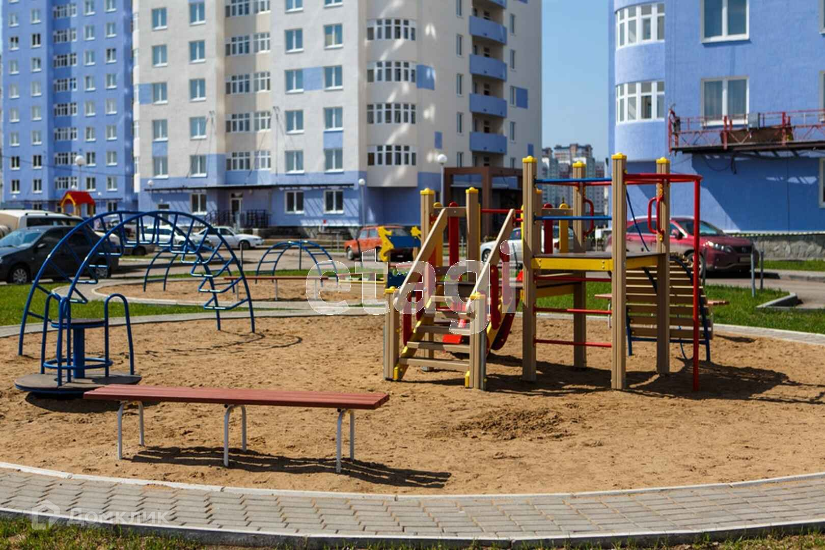 Во дворе детская площадка, парковка для автомобилей.
