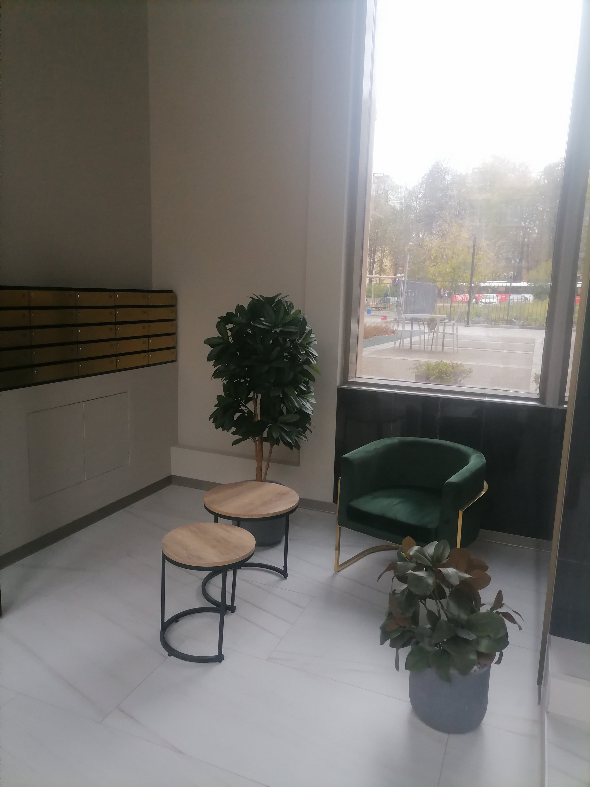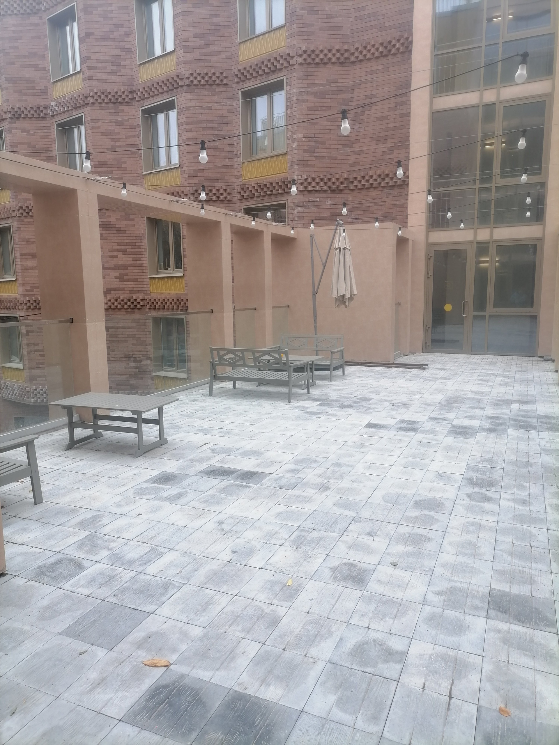 В стеклянном лобби, соединяющем две секции, расположена терраса, на которой можно будет устраивать обеды под открытым небом или просто посидеть с книжкой или ноутбуком на свежем воздухе.