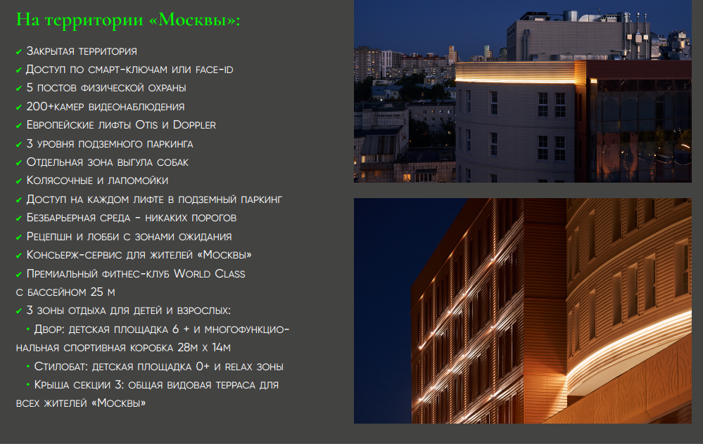 - ресторан, конференц-зал, фитнес клуб world class, spa-центр, бассейн, офис, торговая галерея, магазины, 3 уровня подземного паркинга не выходя за пределы комплекса