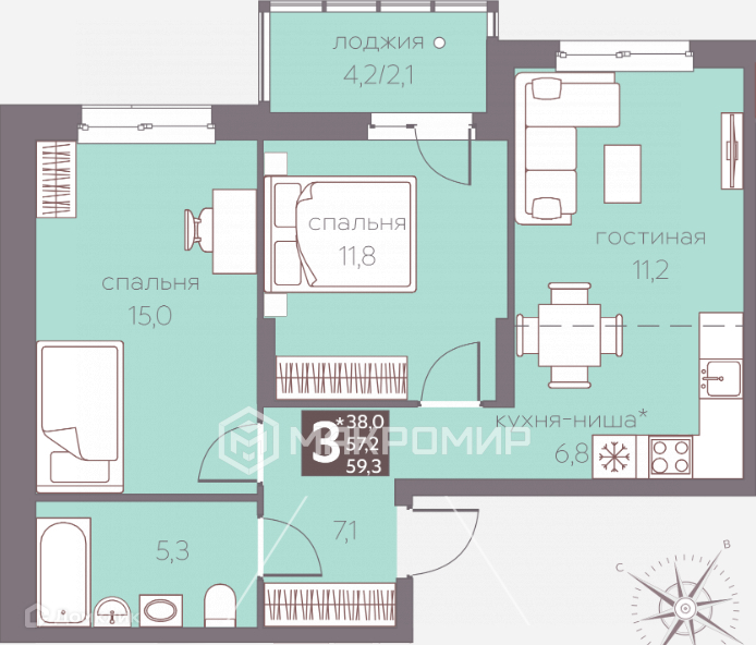 Общая площадь 59.3 м2