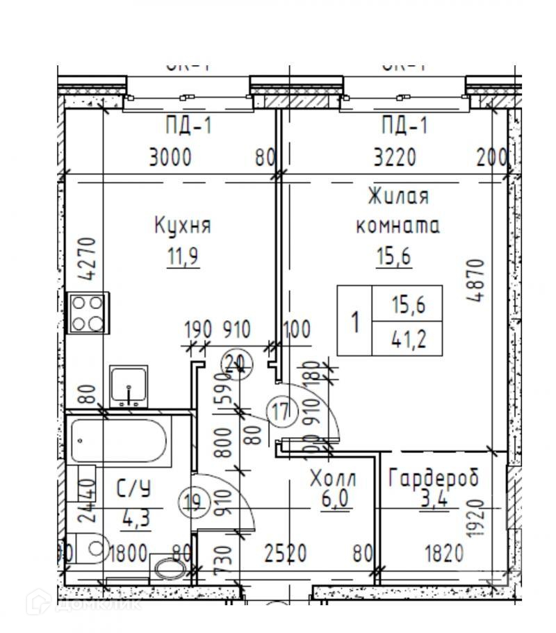 Общая площадь квартиры 41.2 м2, кухня 12м2, жилая комната 15.6м2, гардеробная 3.4м2