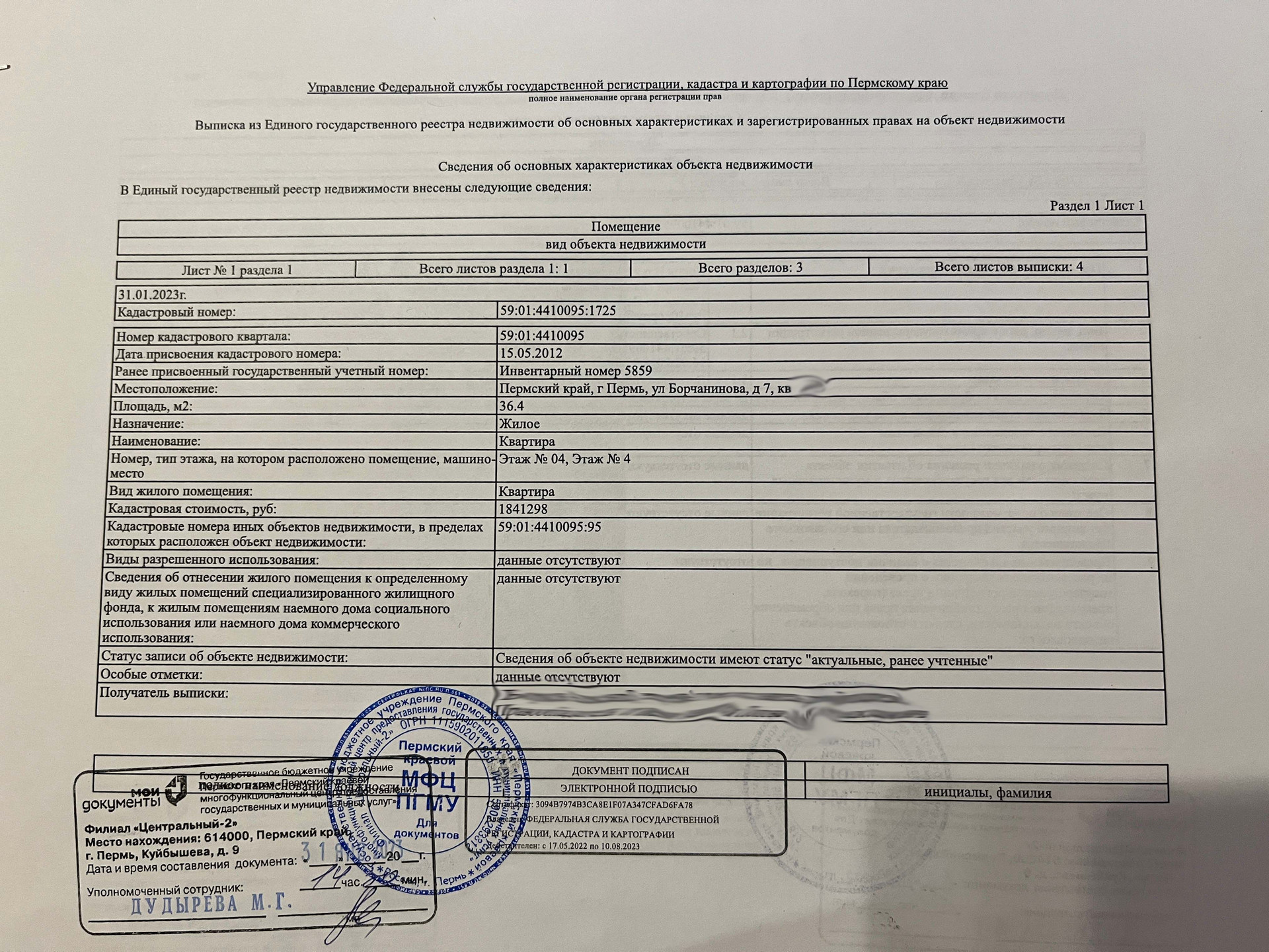 1-комнатная квартира, 36.4 м2, этаж 4 / 5, на продажу в Перми, улица Борчанинова, 7