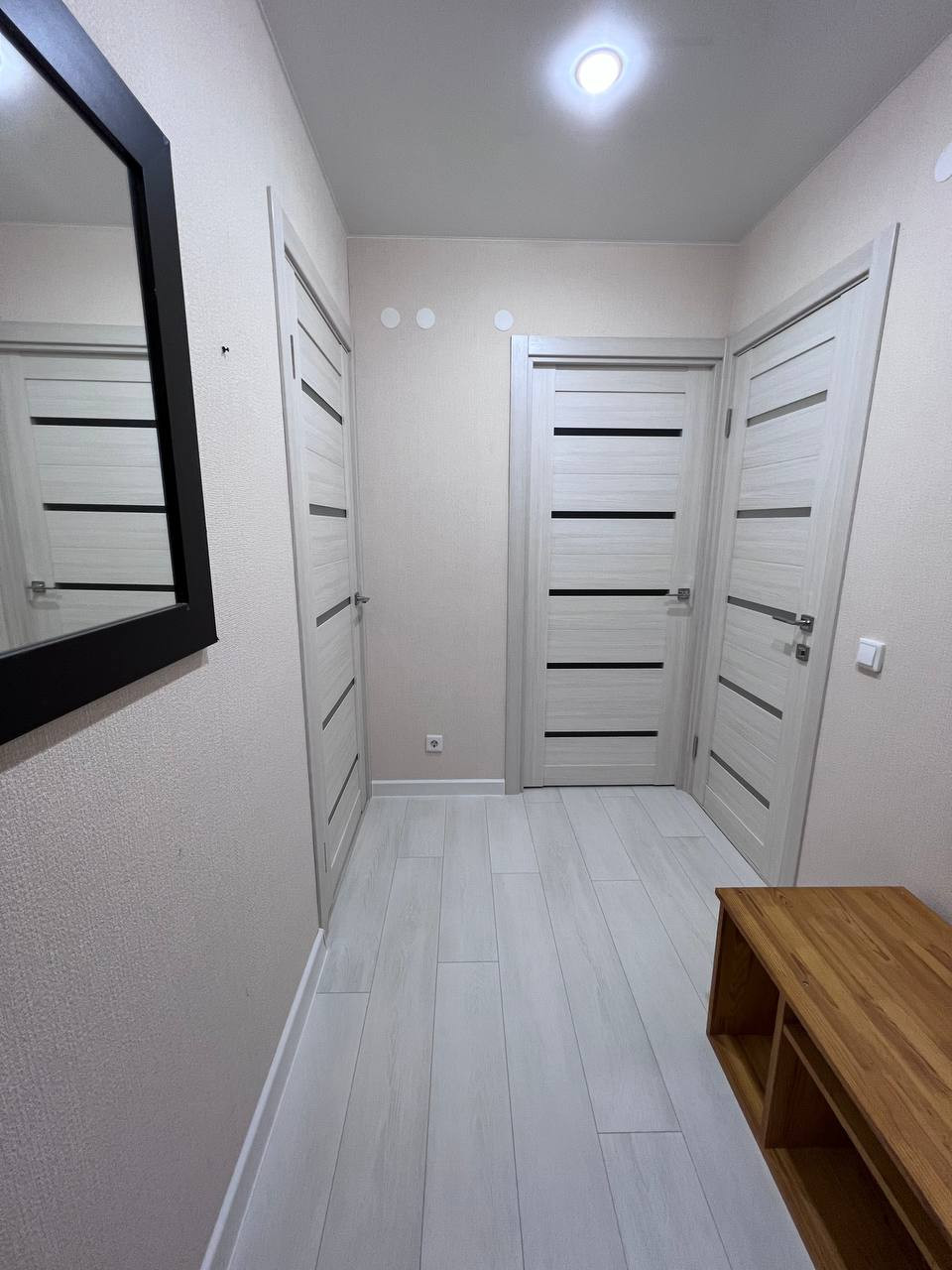 Фото соответствуют. В квартире заменены межкомнатные двери. На полу ламинат. Натяжной потолок. Кухонный гарнитур остаётся..