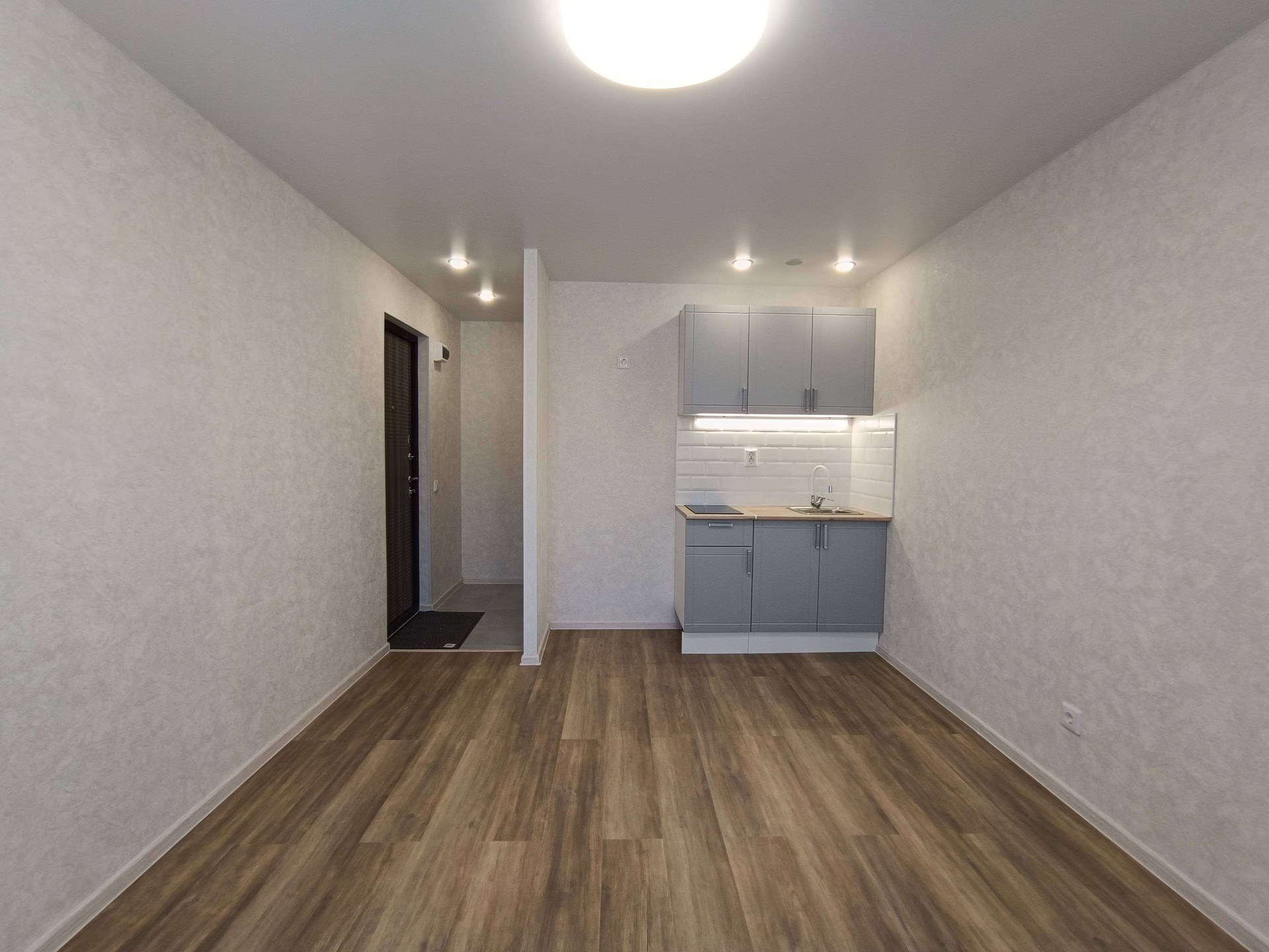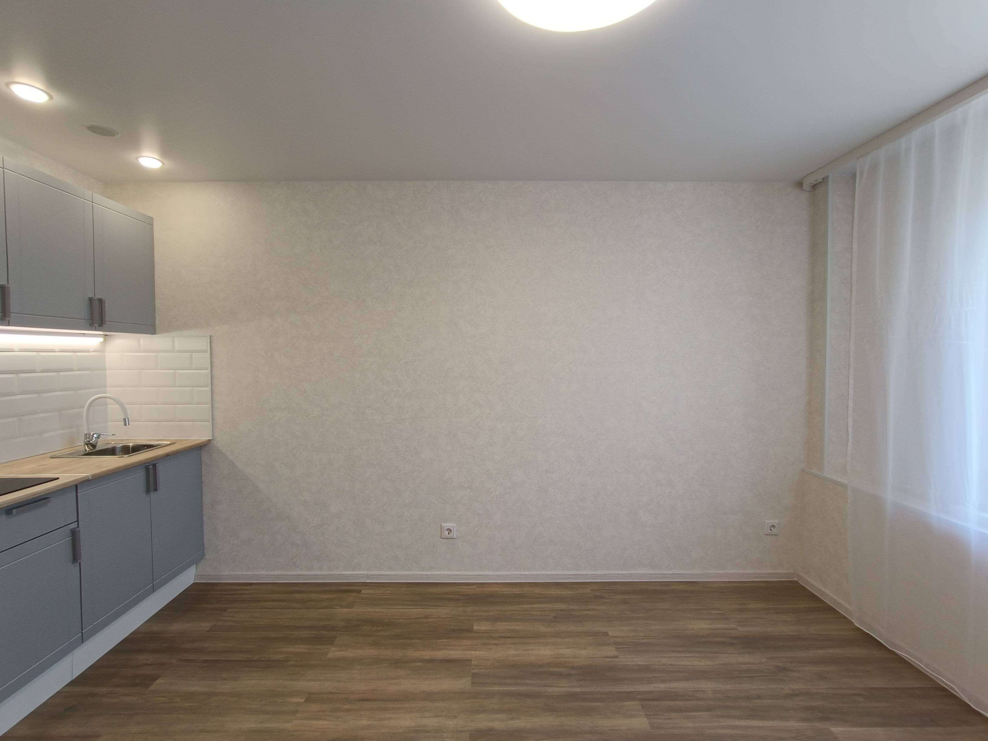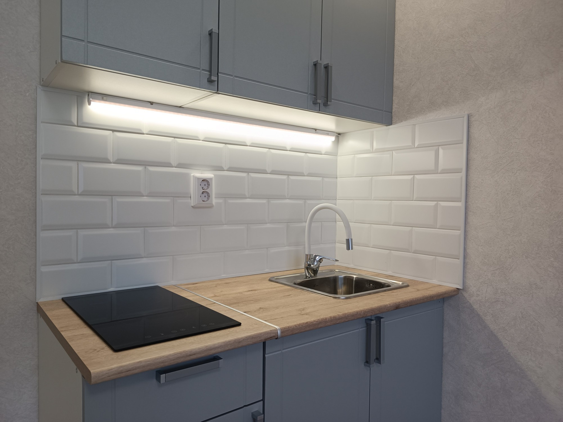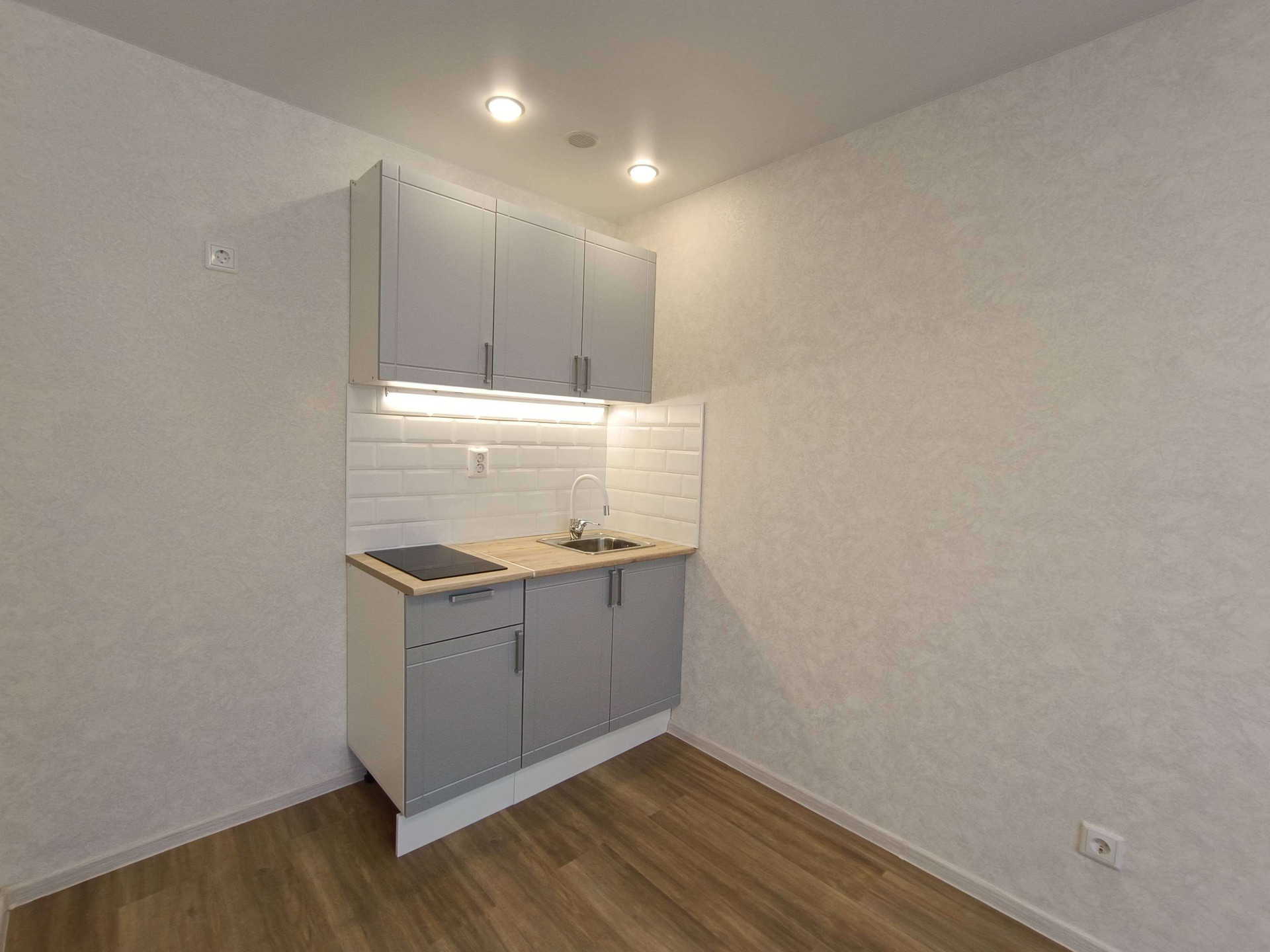 Выделена кухонная зона, куда установлен новый, встроенный кухонный гарнитур с варочной поверхностью и подсветкой.