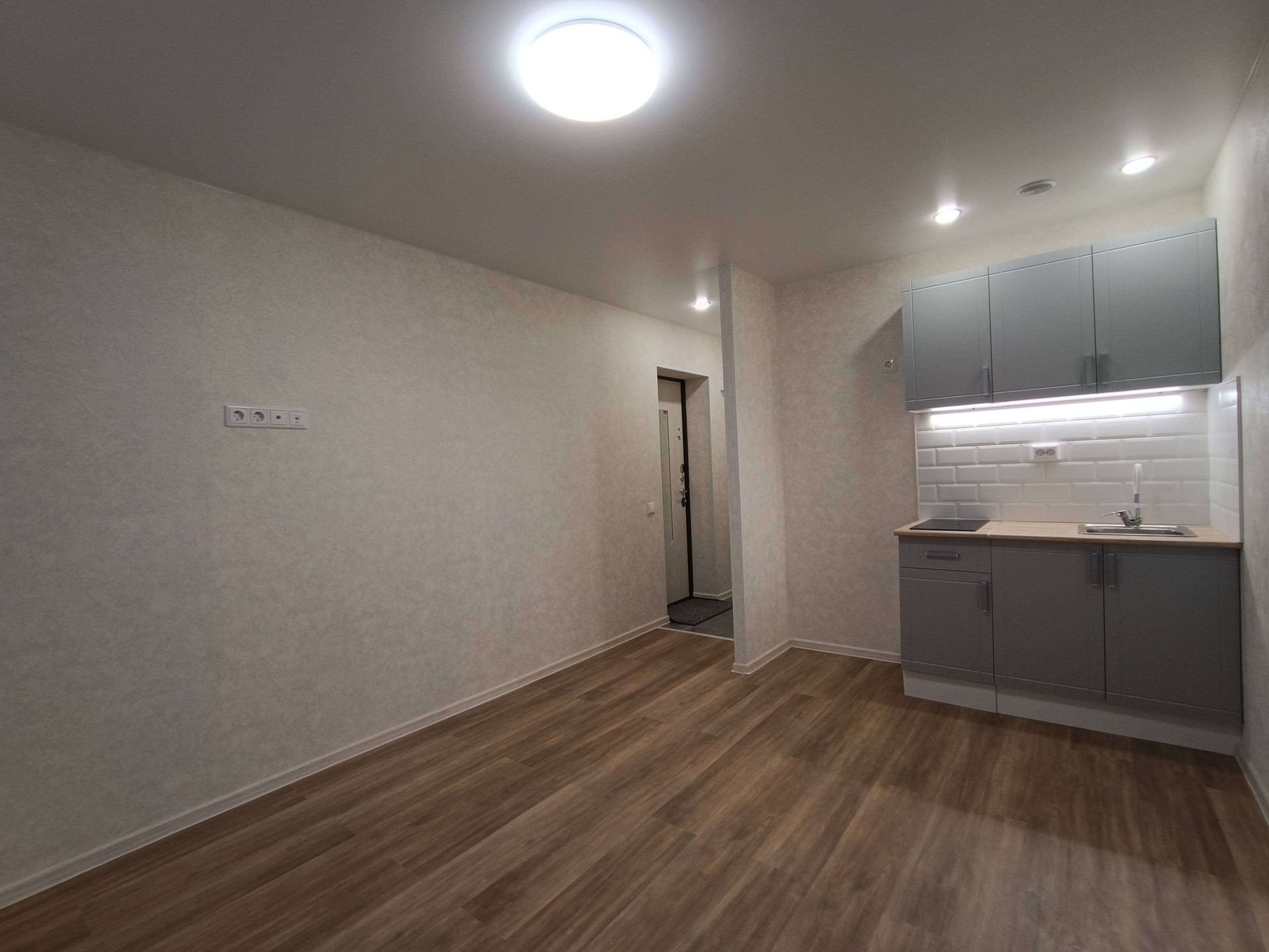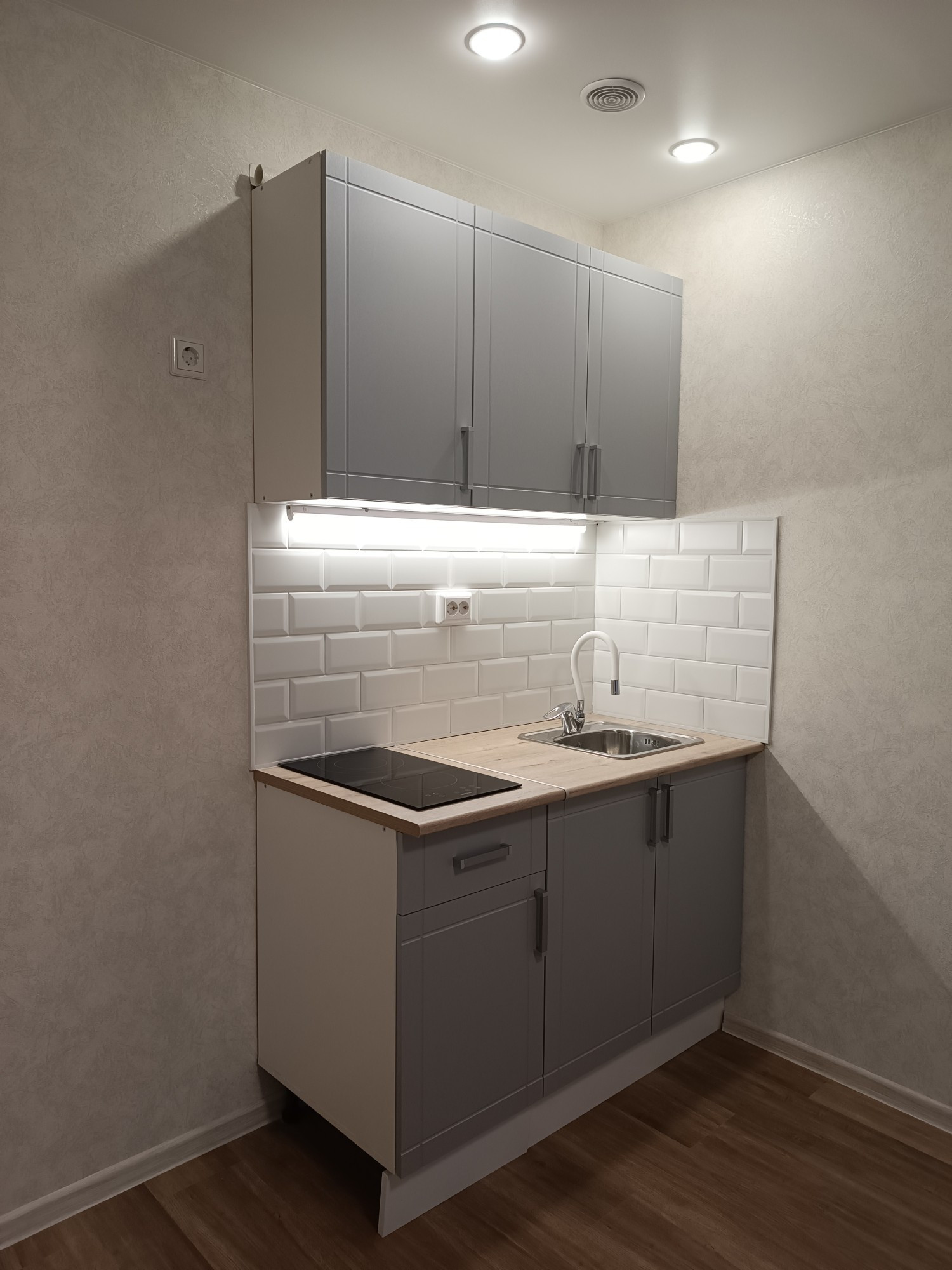Выделена кухонная зона, куда установлен новый, встроенный кухонный гарнитур с варочной поверхностью и подсветкой.
