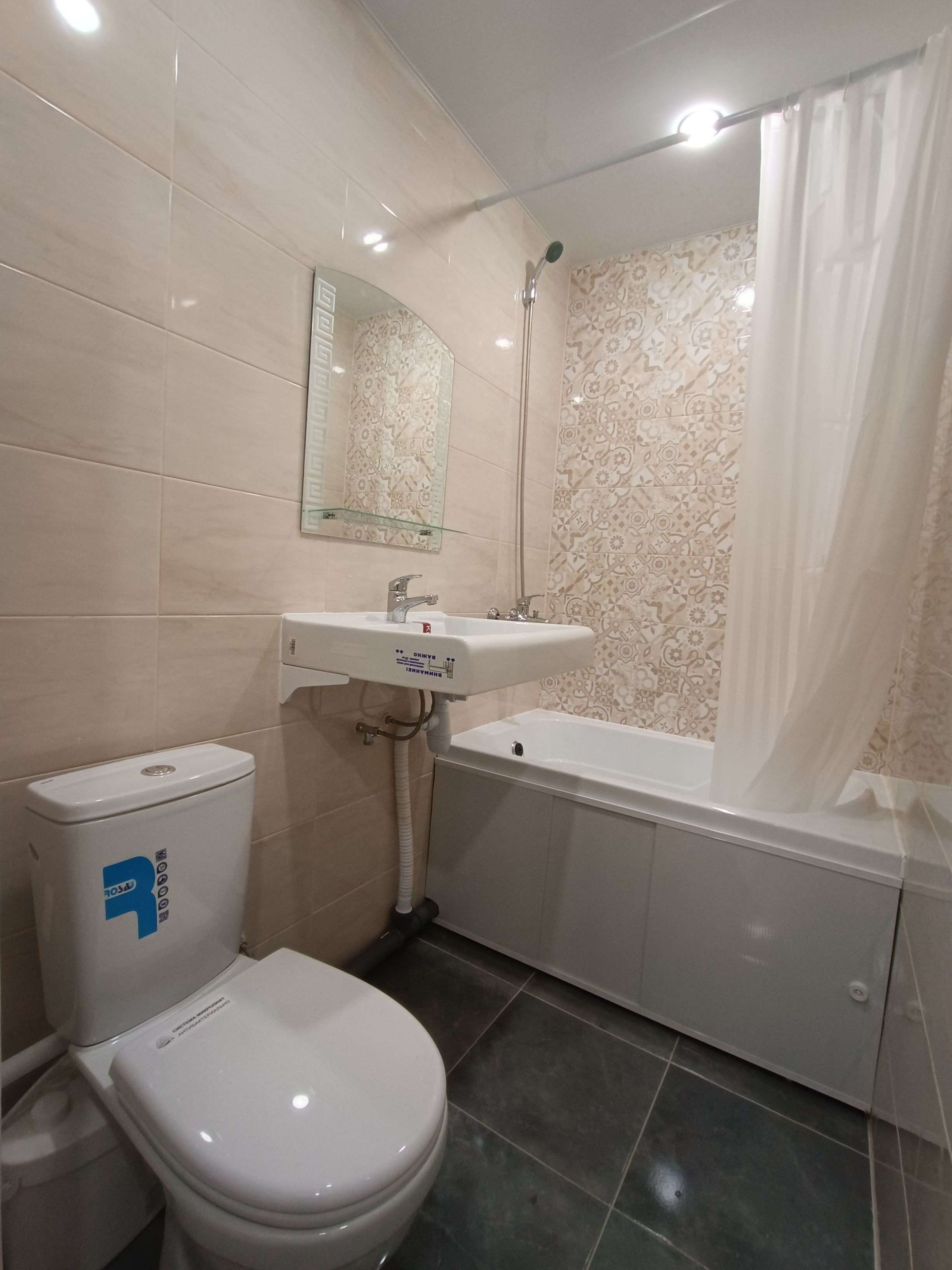 Санузел отделан кафелем, под раковиной оборудовано место под стиральную машину.