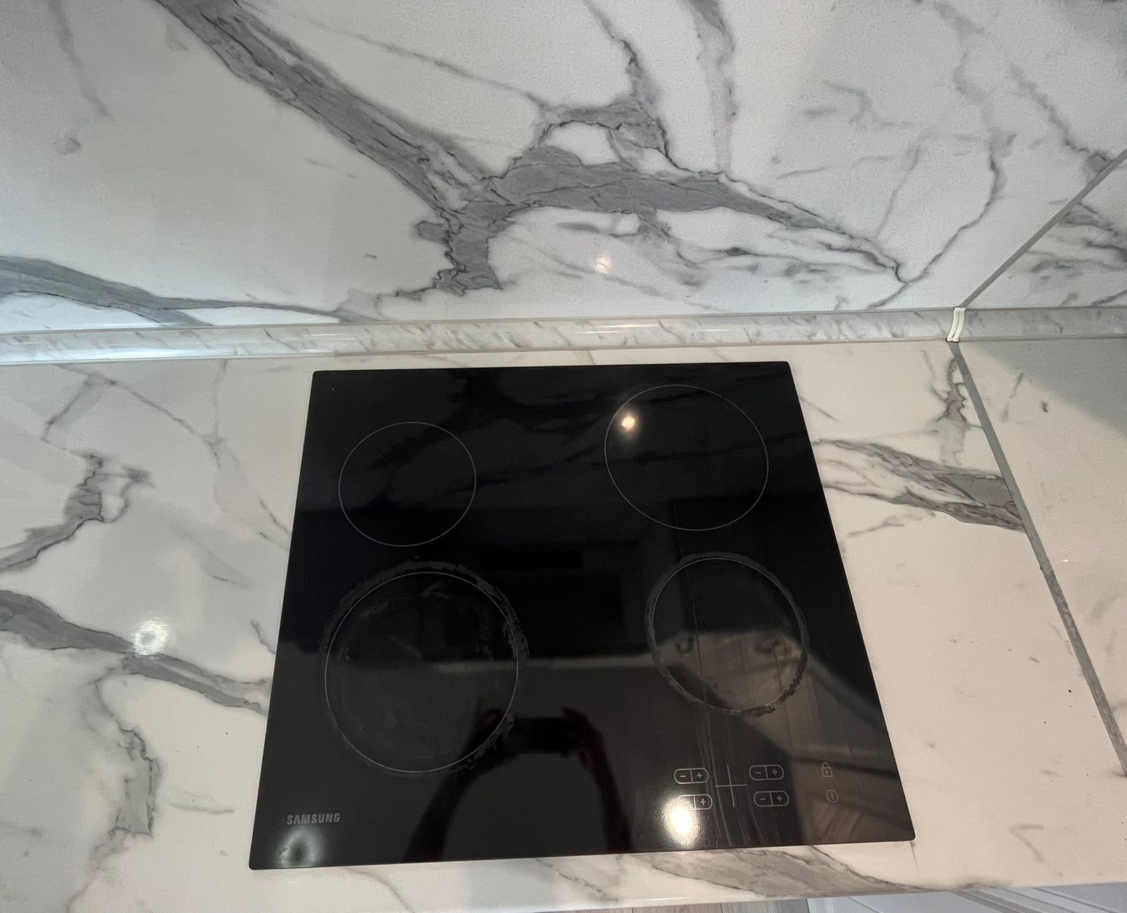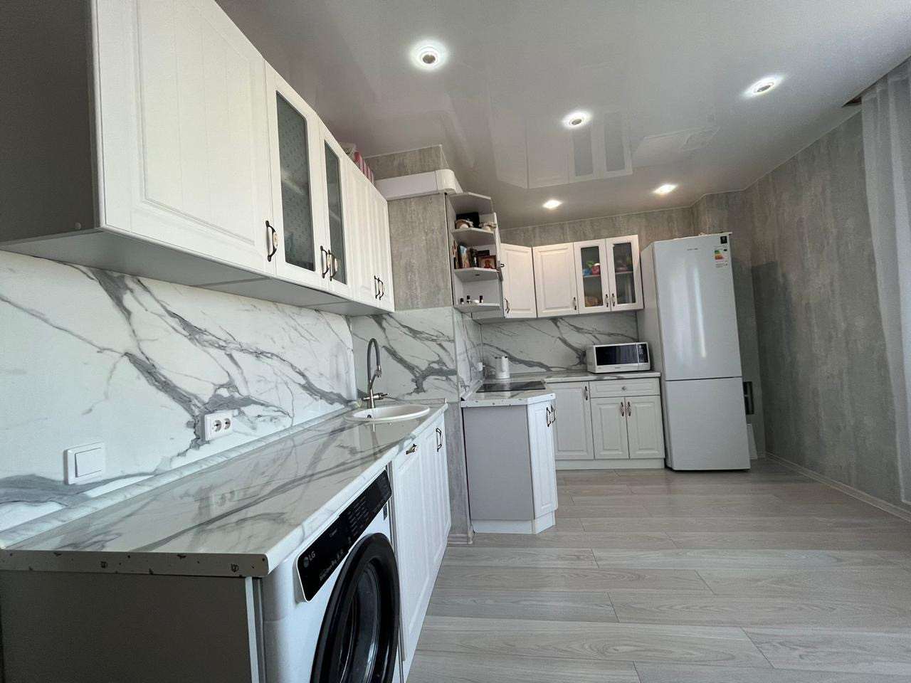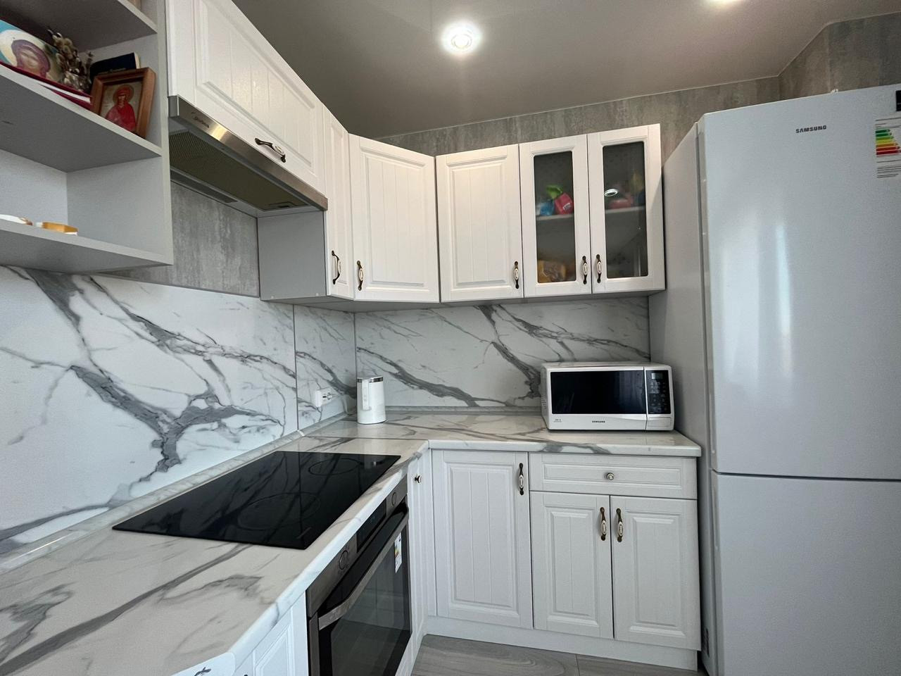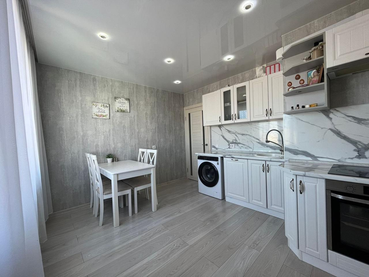 Остаётся встроенный кухонный гарнитур с вытяжкой, посудомоечной машиной, варочной поверхностью