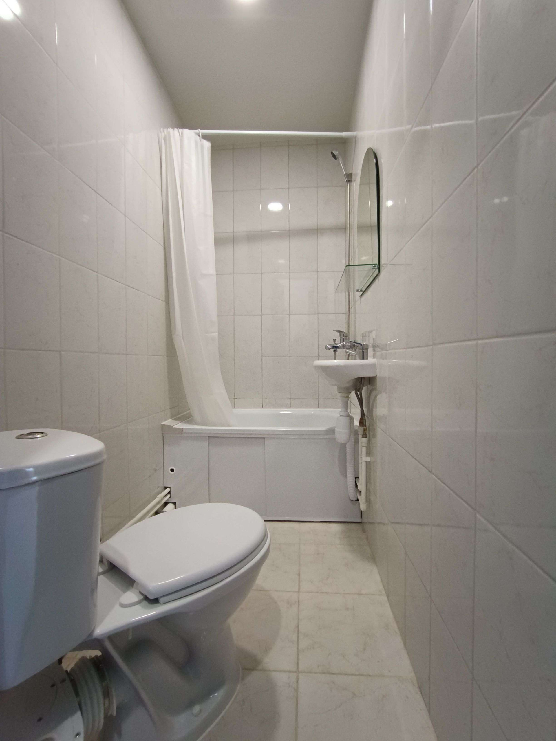 Санузел отделан кафелем, оборудовано место под стиральную машину со сливом и подачей воды.