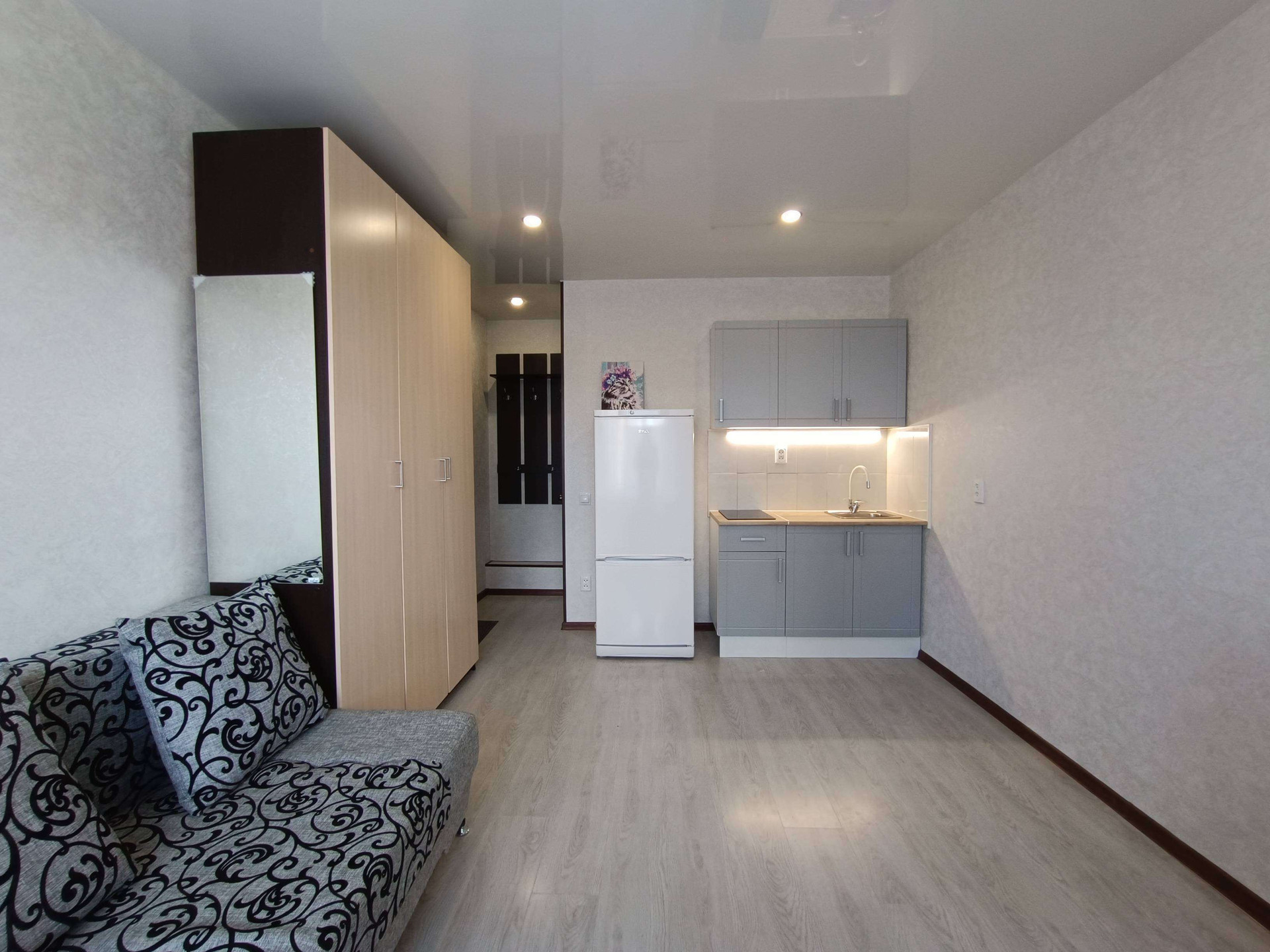 В квартире натяжной потолок, на полу ламинат, поклеяны хорошие обои, установлена металлическая входная дверь.