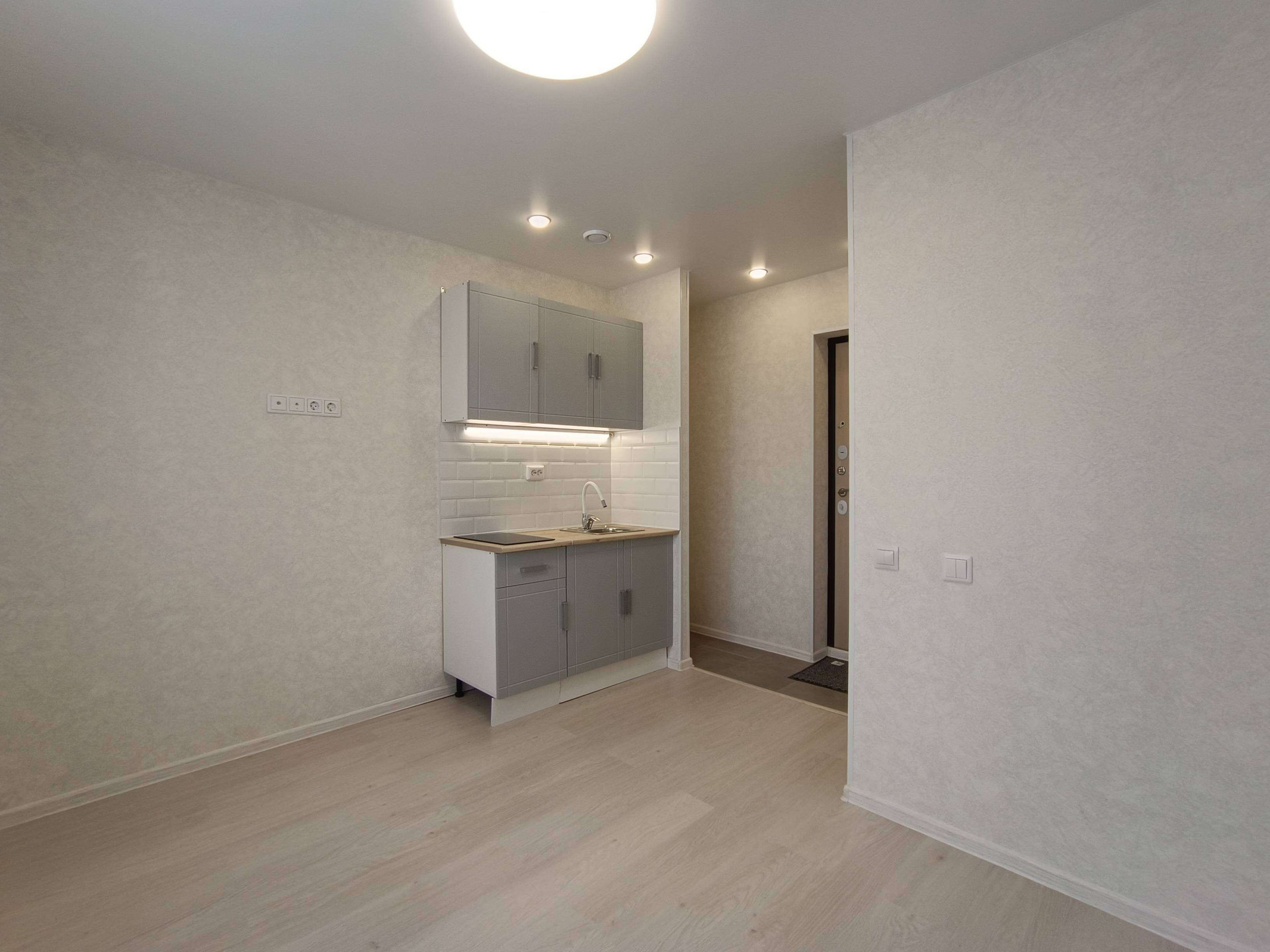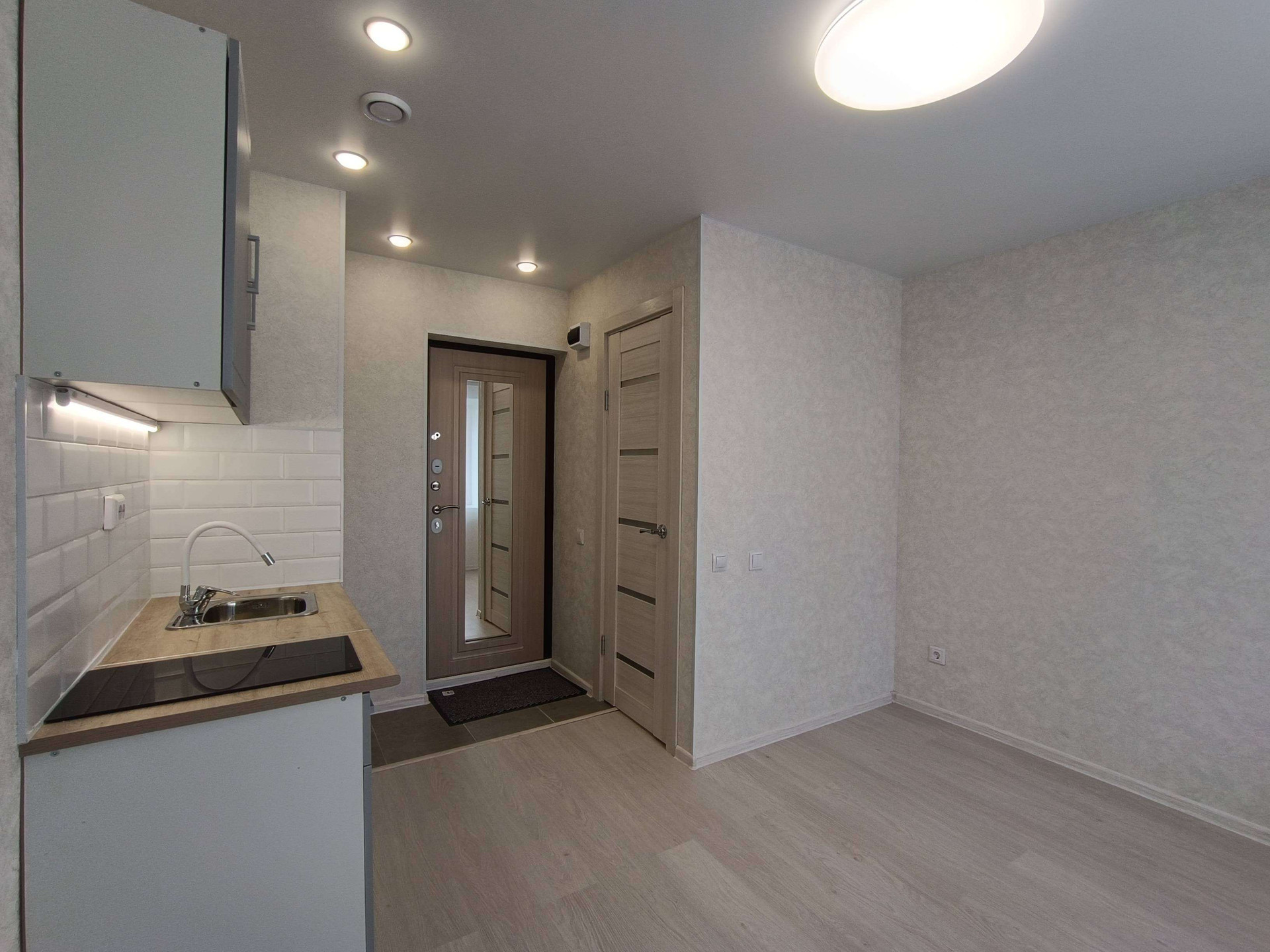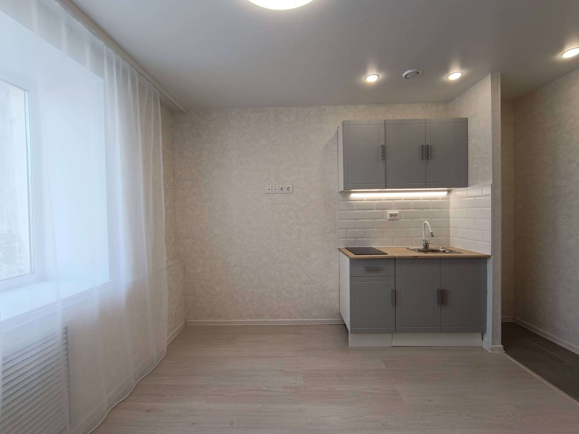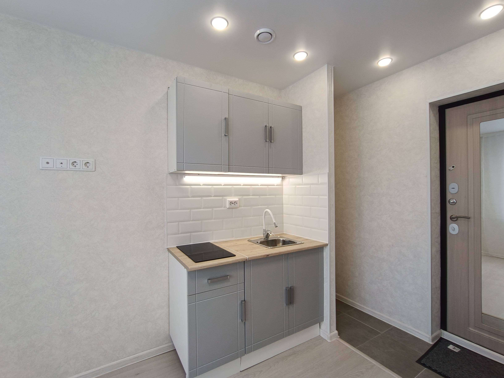Выделена кухонная зона, куда установлен новый, встроенный кухонный гарнитур с варочной поверхностью и подсветкой.
