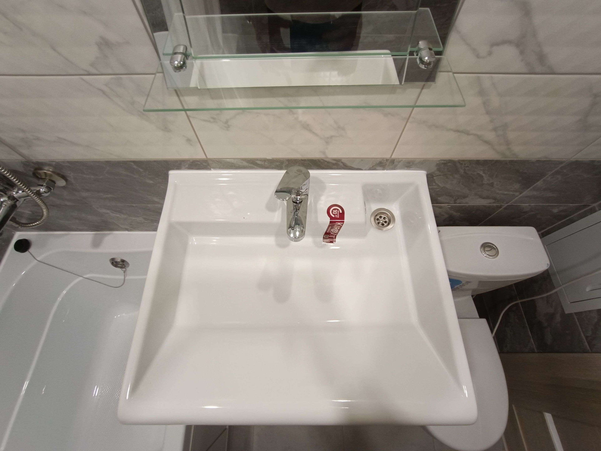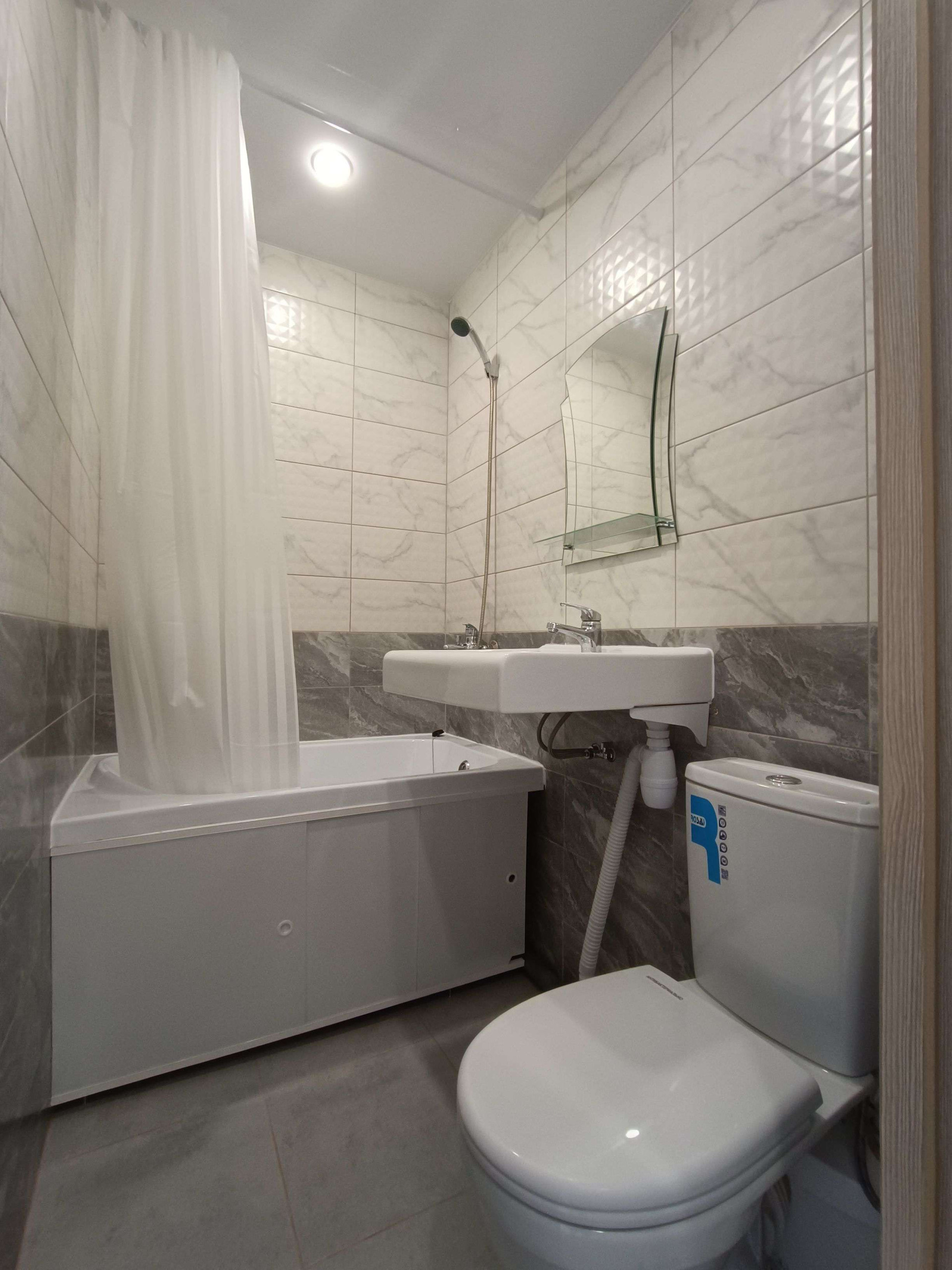 Санузел отделан кафелем, под раковиной оборудовано место под стиральную машину с подачей воды и сливом.
