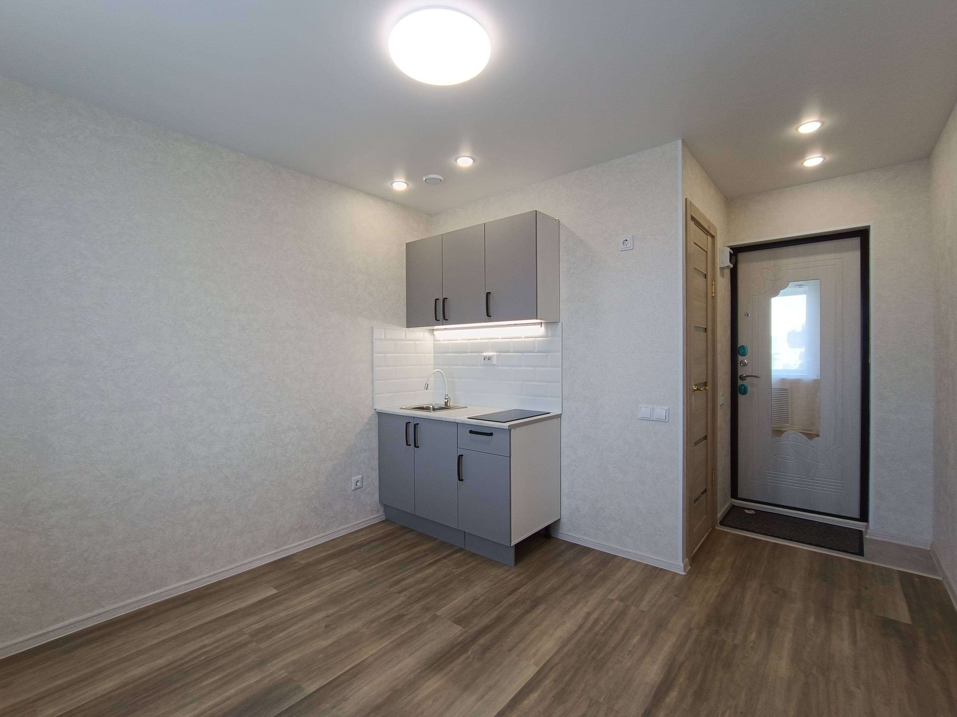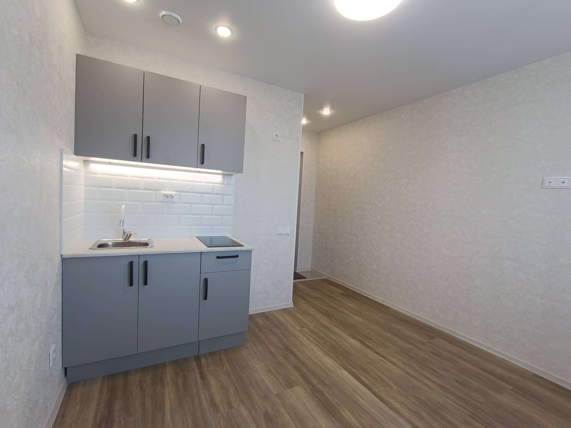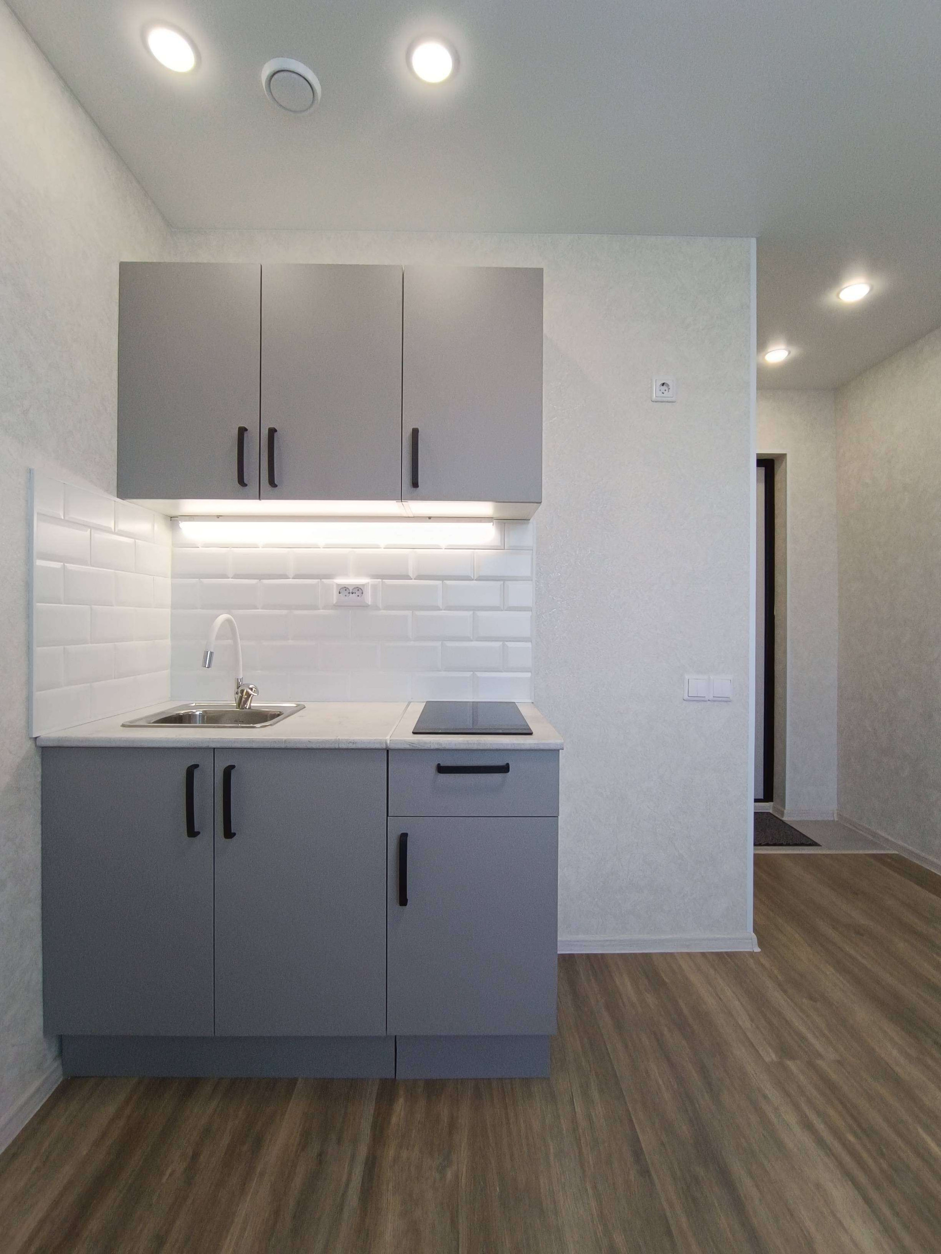 Выделена кухонная зона, куда установлен новый, встроенный кухонный гарнитур с варочной поверхностью и подсветкой, а справа оборудованоьметчо под холодильник.