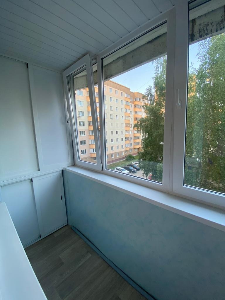 На балконе установлены стеклопакеты и системы хранения.