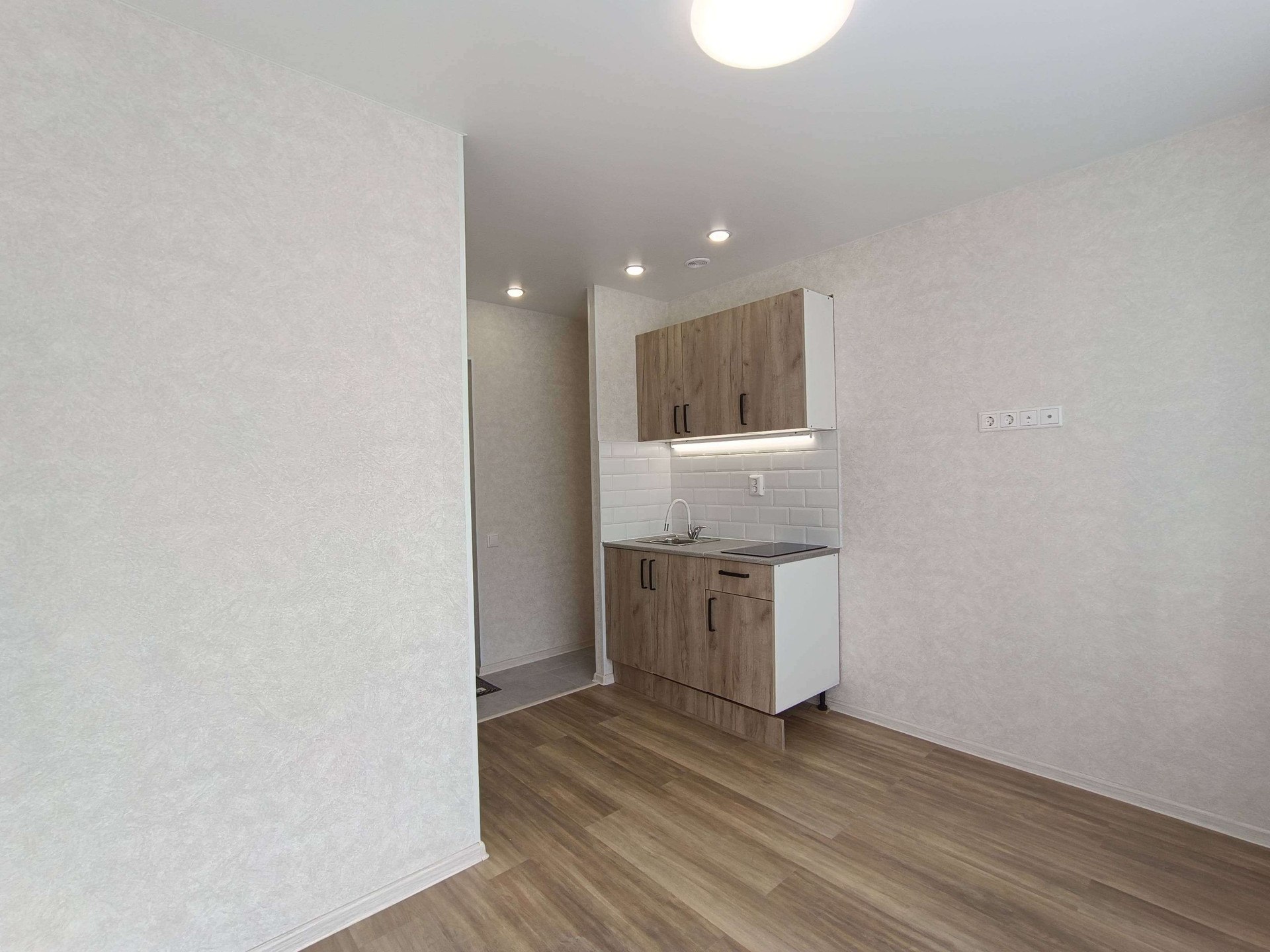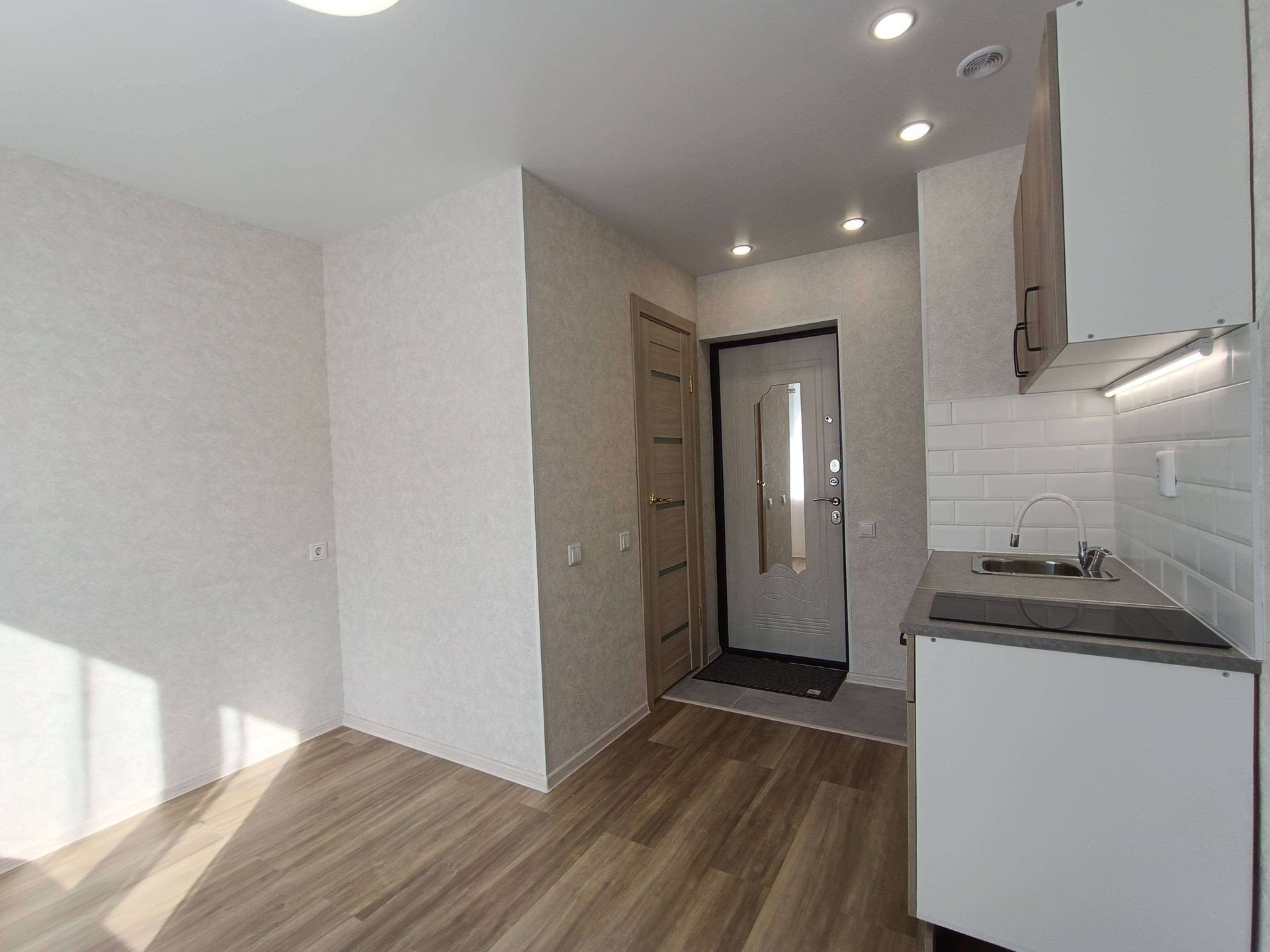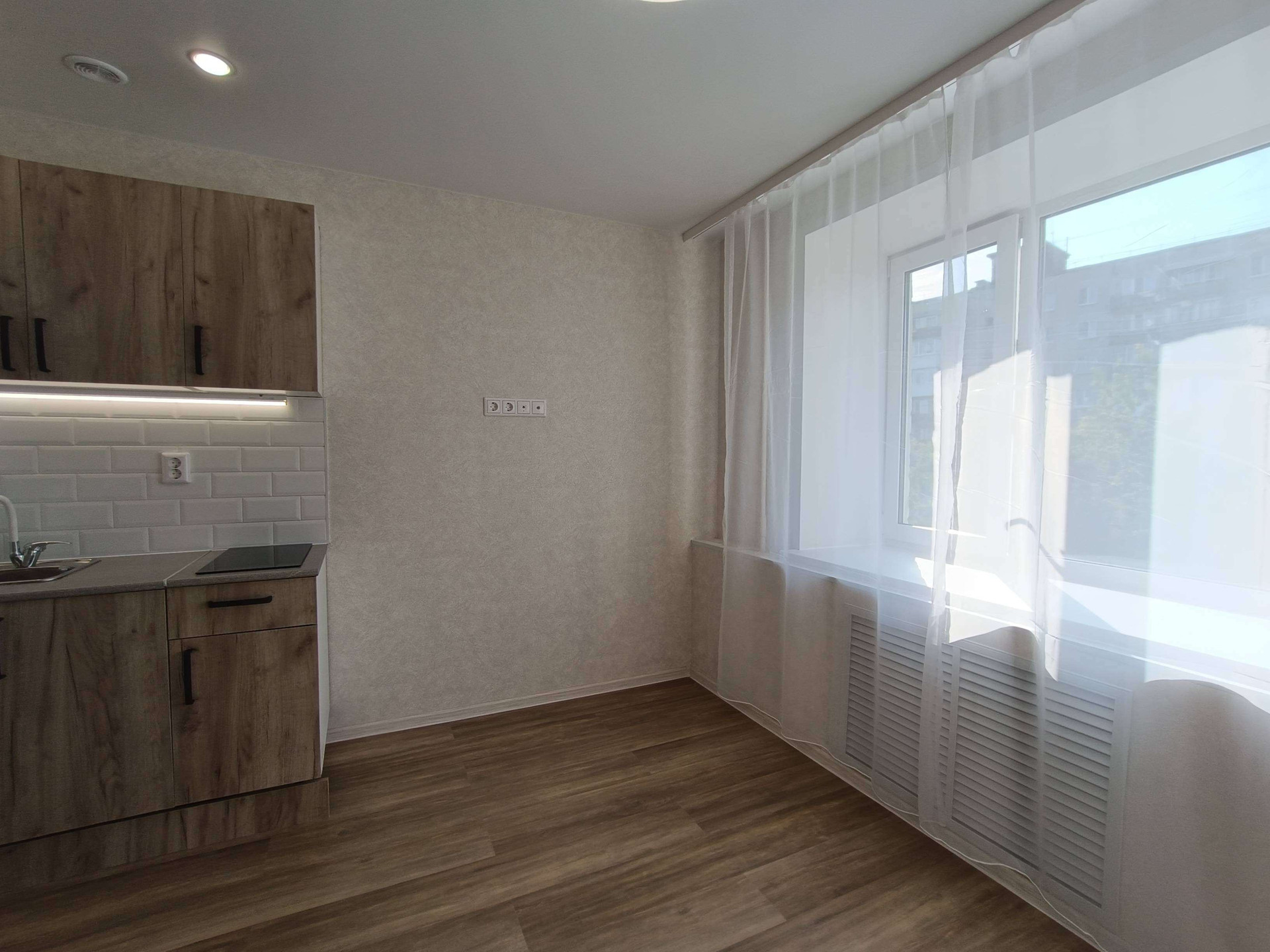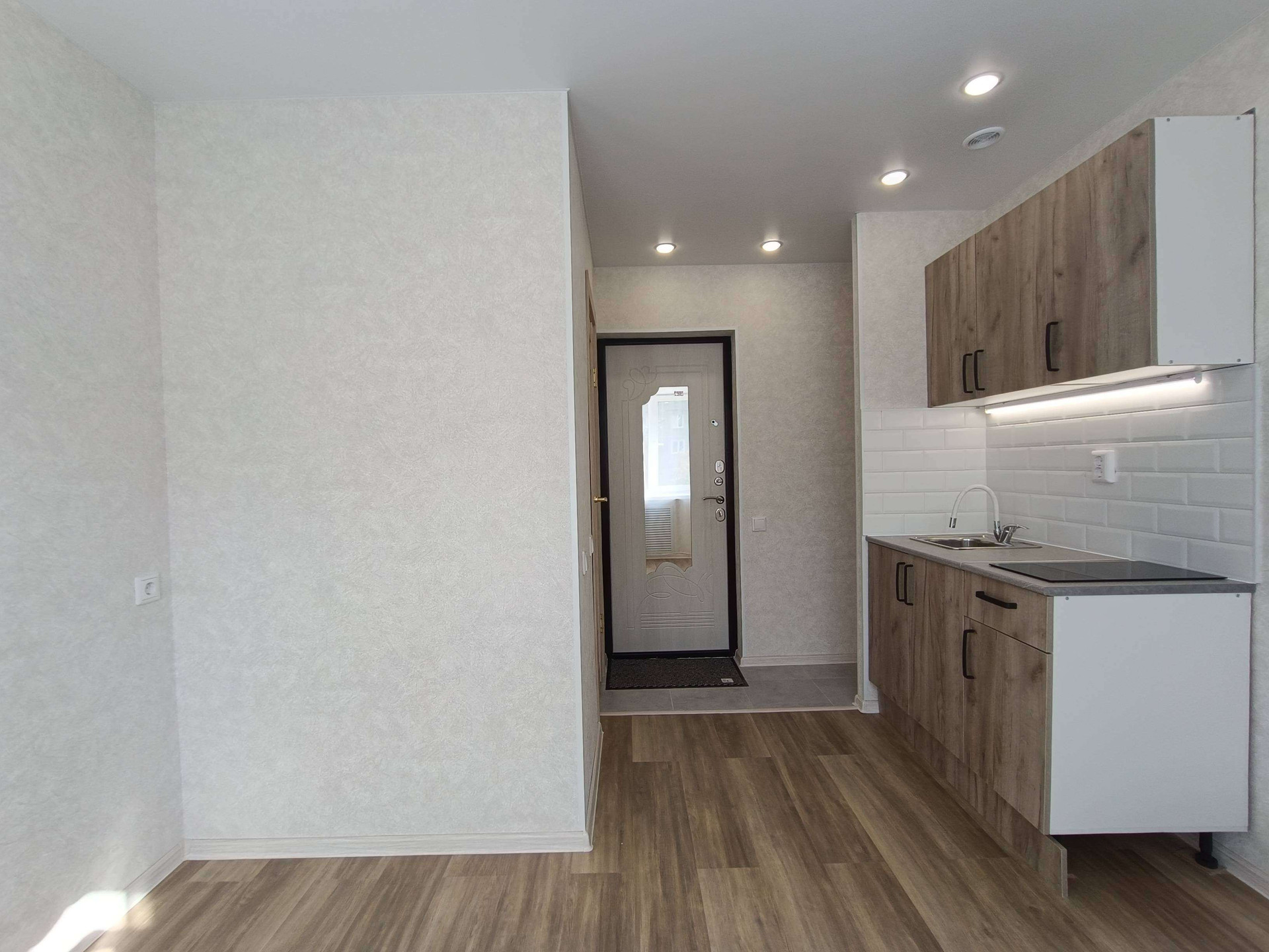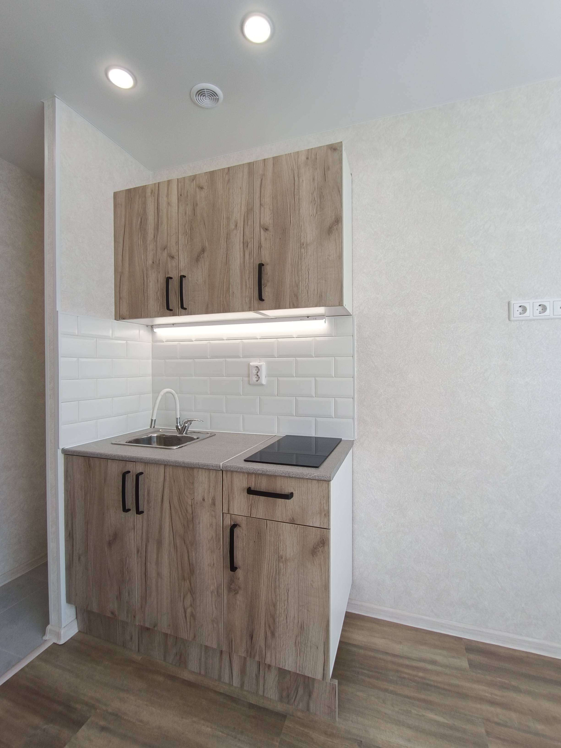 Выделена кухонная зона, куда установлен новый, встроенный кухонный гарнитур с варочной поверхностью и подсветкой.