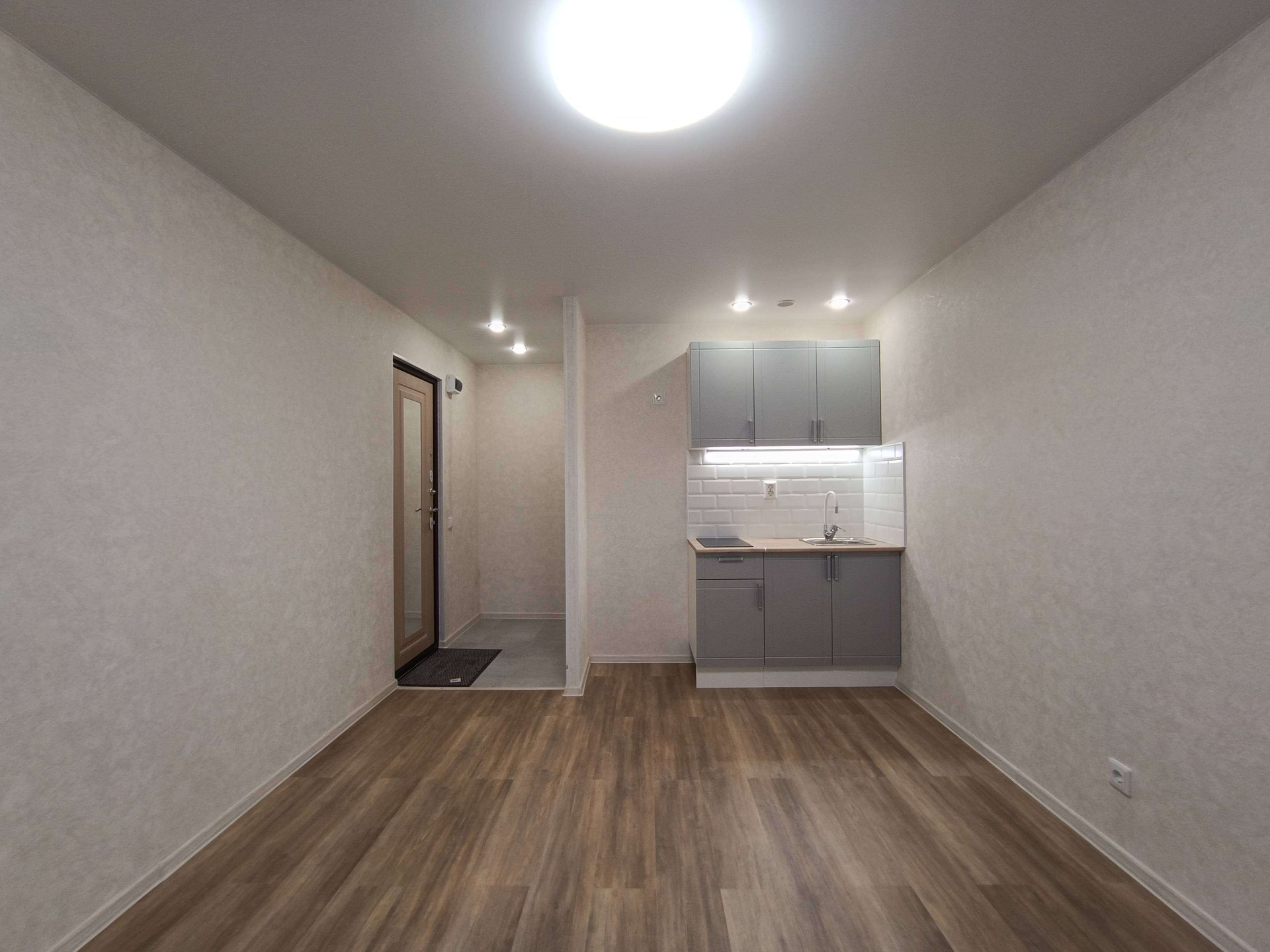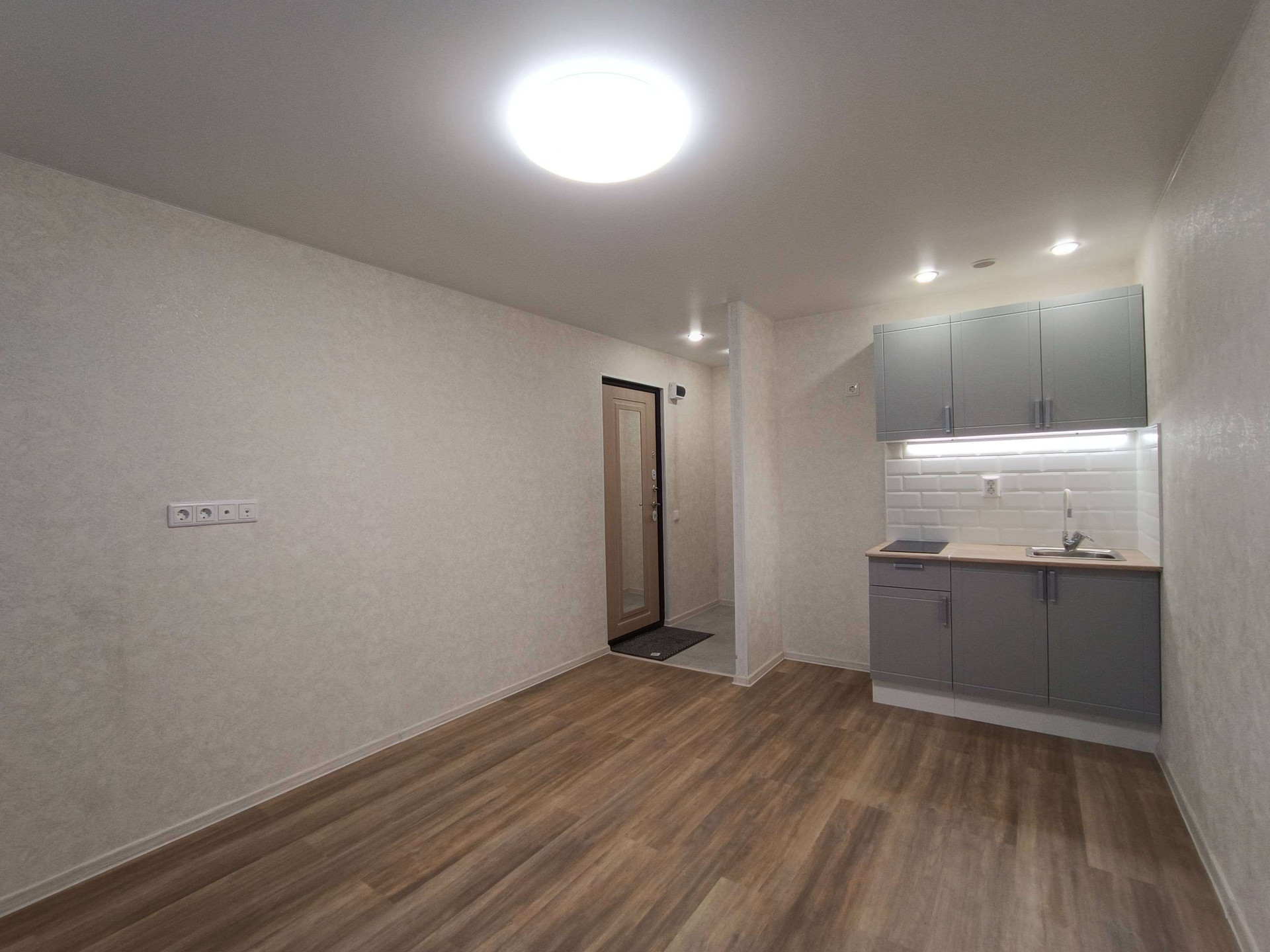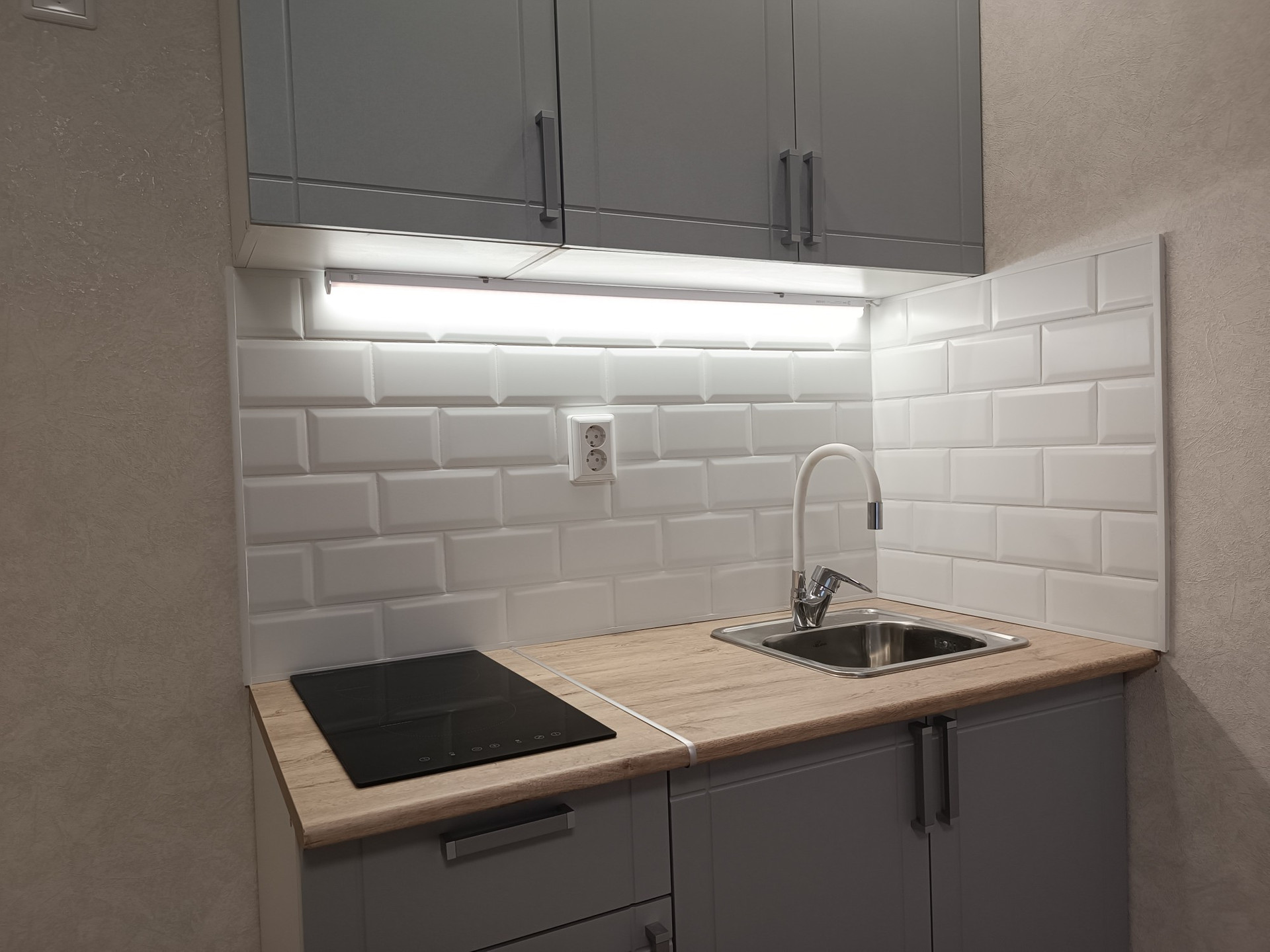 Выделена кухонная зона, куда установлен новый, встроенный кухонный гарнитур с варочной поверхностью и подсветкой, а слева от него оборудована ниша под холодильник.
