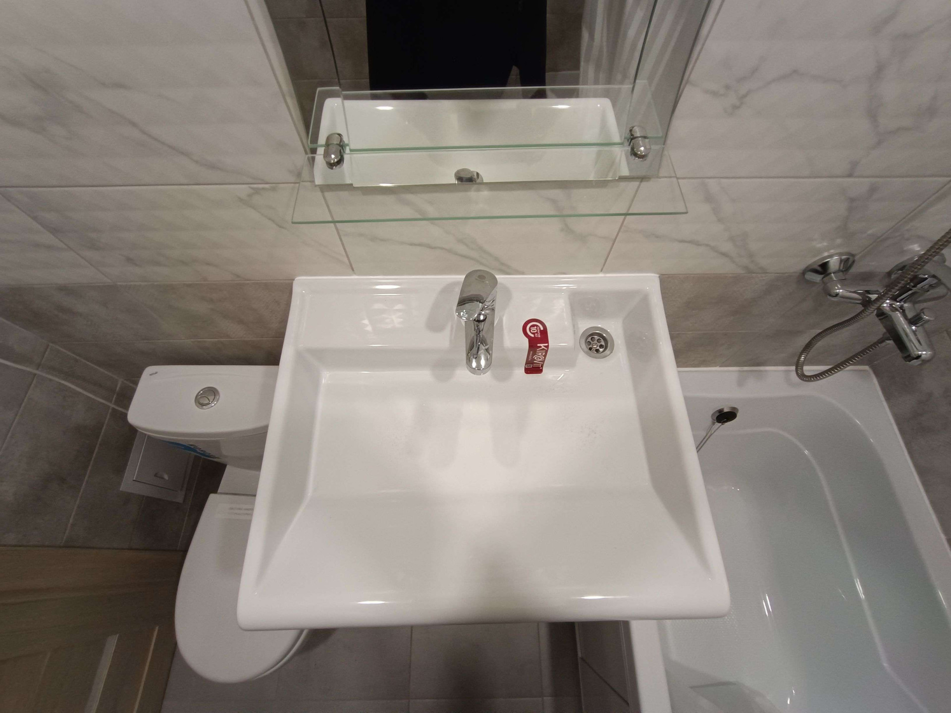 Санузел отделан кафелем, под раковиной оборудовано место под стиральную машину.
