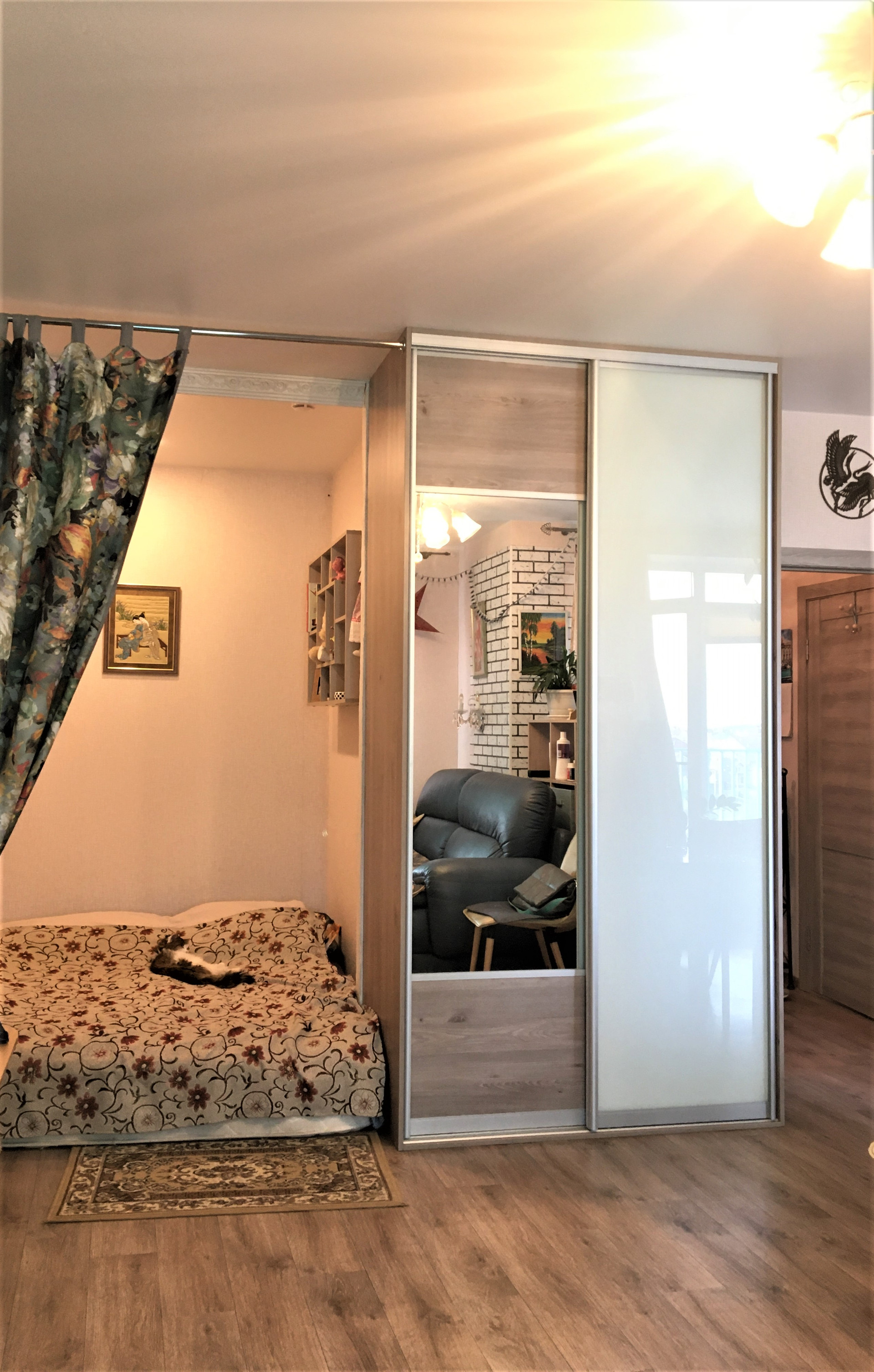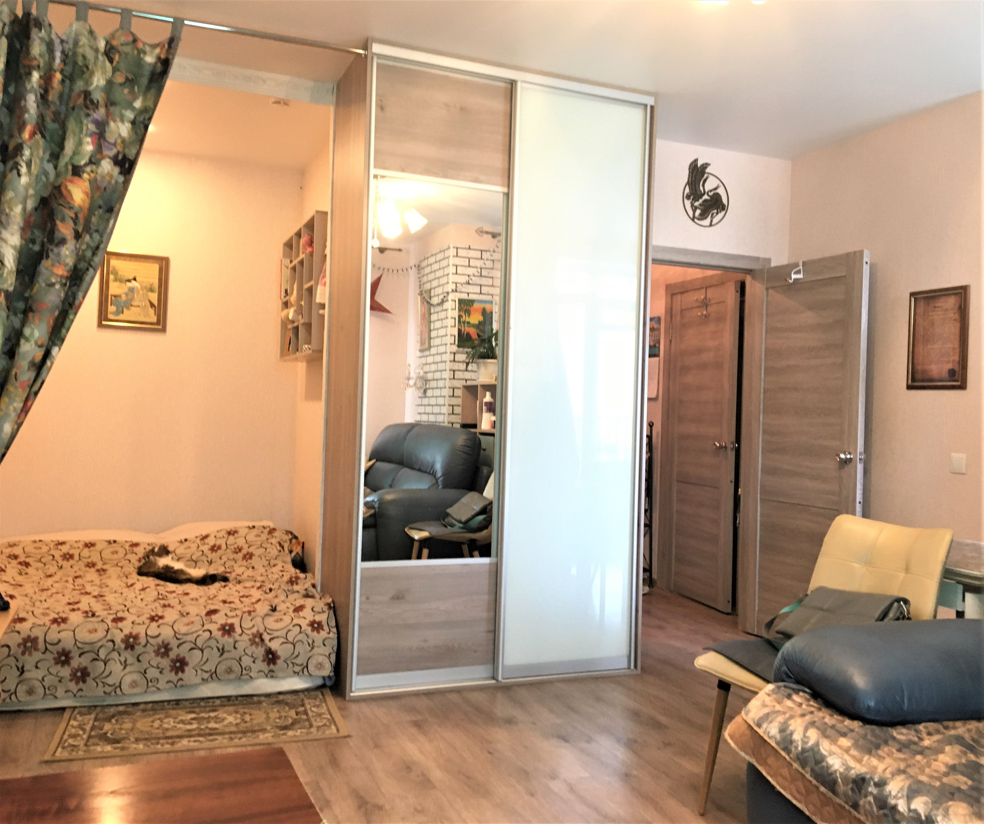 Очень продуманная  и удобная планировка квартиры-студии. Выделена просторная зона кухни с красивым современным кухонным гарнитуром, а также зона гостиной, спальное место размещено в нише, установлены два вместительных шкафа-купе. Санузел совмещенный.