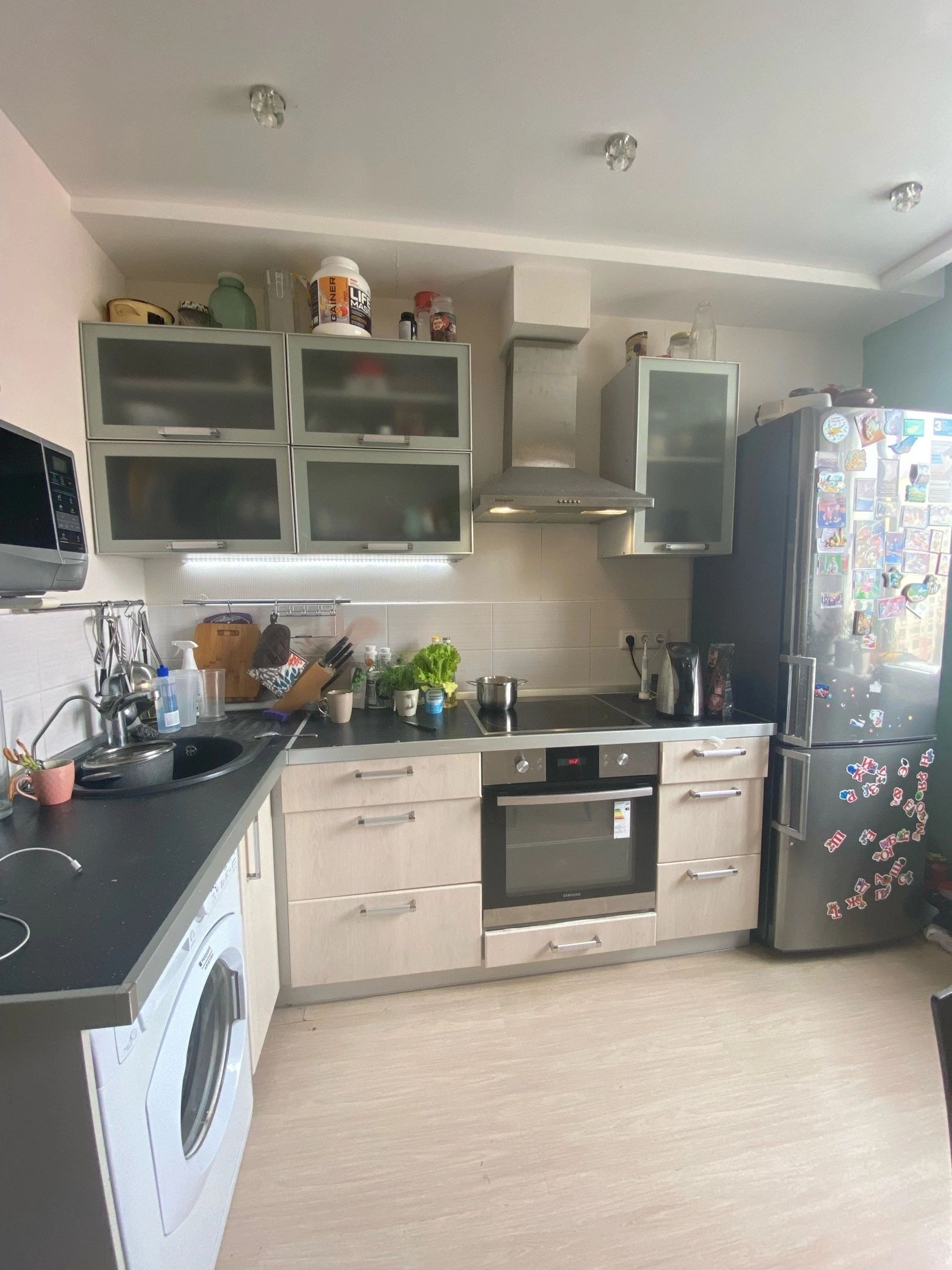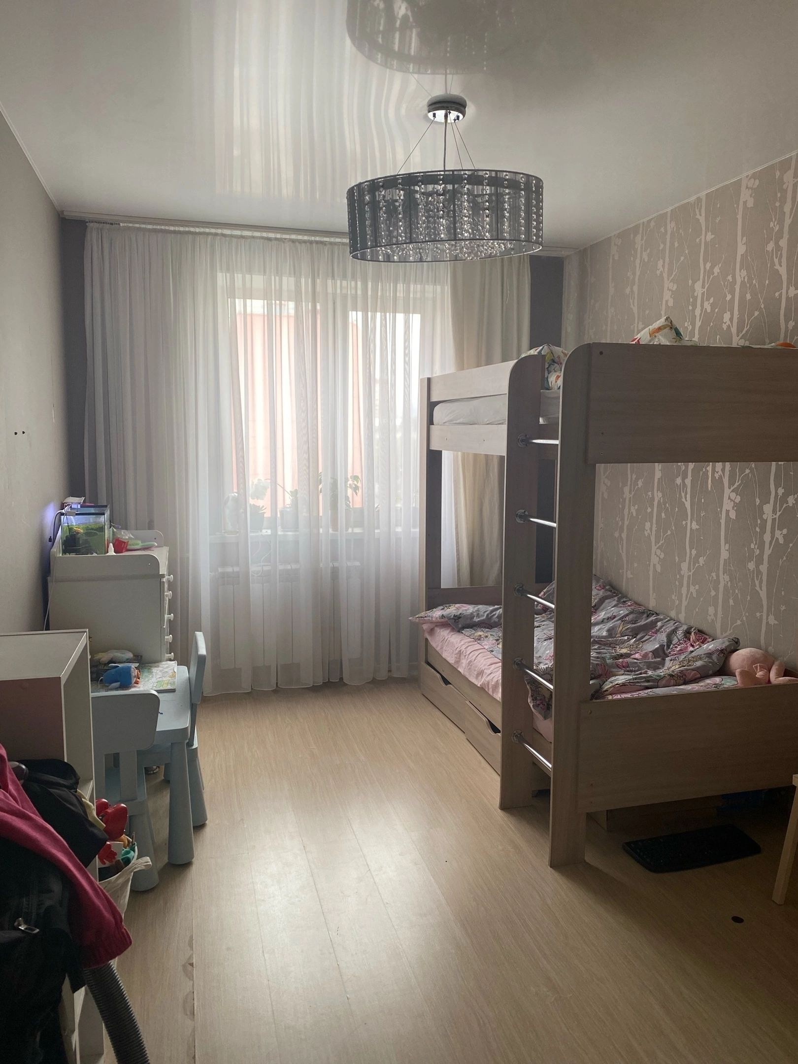 Остаётся: кухонный гарнитур, варочная панель, вытяжка, духовой шкаф, люстры, кухонный стол и 4 стула, двухъярусная кровать с матрасами , комод, стеллажи, встроенный большой шкаф купе, кровать 180*200, матрас ортопедический, 2 тумбочки прикроватные, длинный стол- комод, зеркало, прихожая, шкаф встроенный в коридоре. В ванной комнате акриловая ванна, раковина, тумба, зеркало и унитаз в идеальном состоянии. Бонусом оставлю пароварку многоуровневую, ложки, вилки, тарелки ( набор), контейнера, поварешки, кружки. Остаются шторы все, тюль, компьютерный стул.