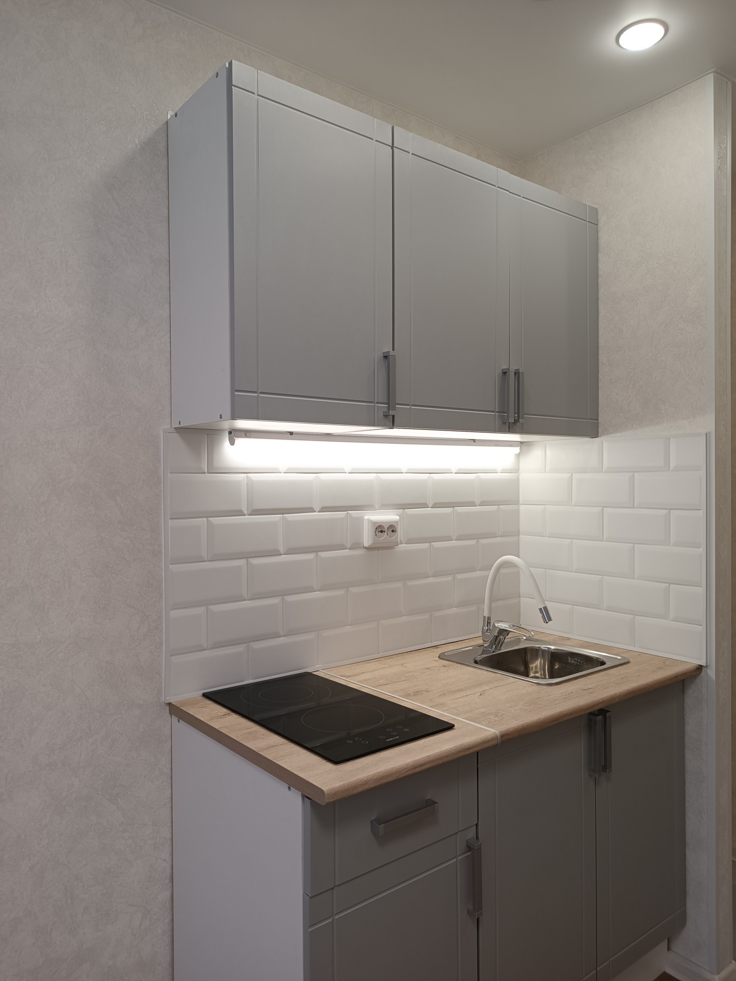 Выделена кухонная зона, куда установлен новый, встроенный кухонный гарнитур с варочной поверхностью и подсветкой.