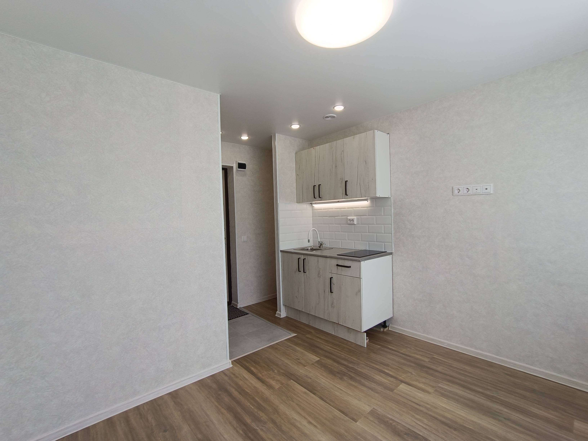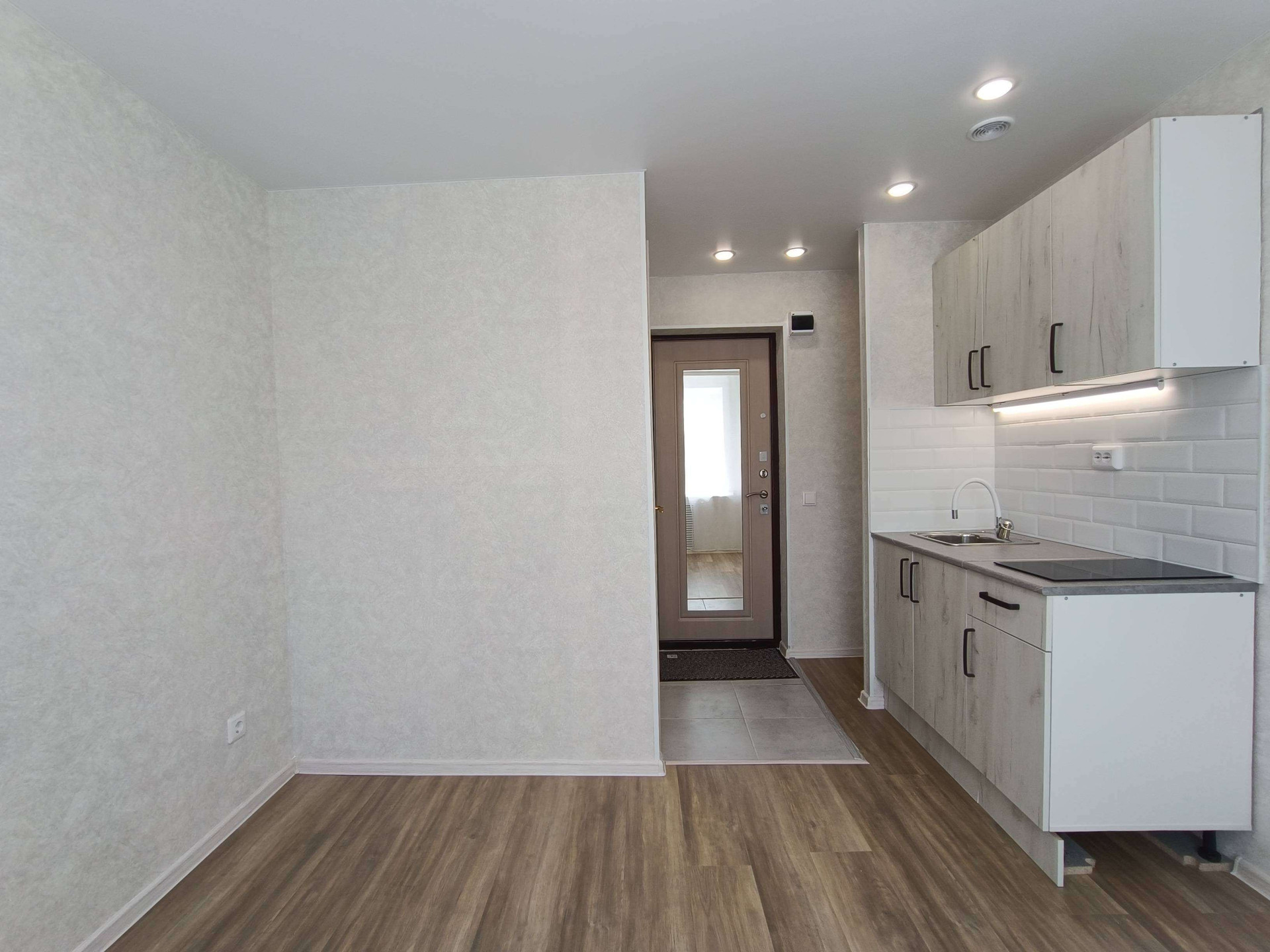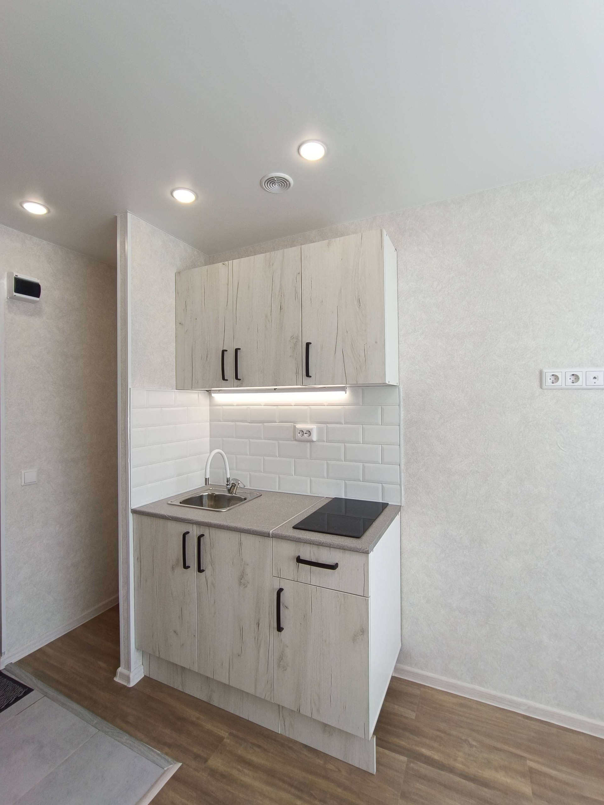 Выделена кухонная зона, куда установлен новый, встроенный кухонный гарнитур с варочной поверхностью и подстветкой.