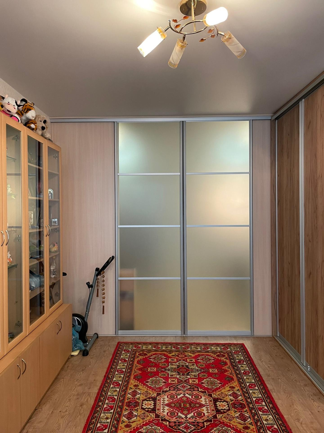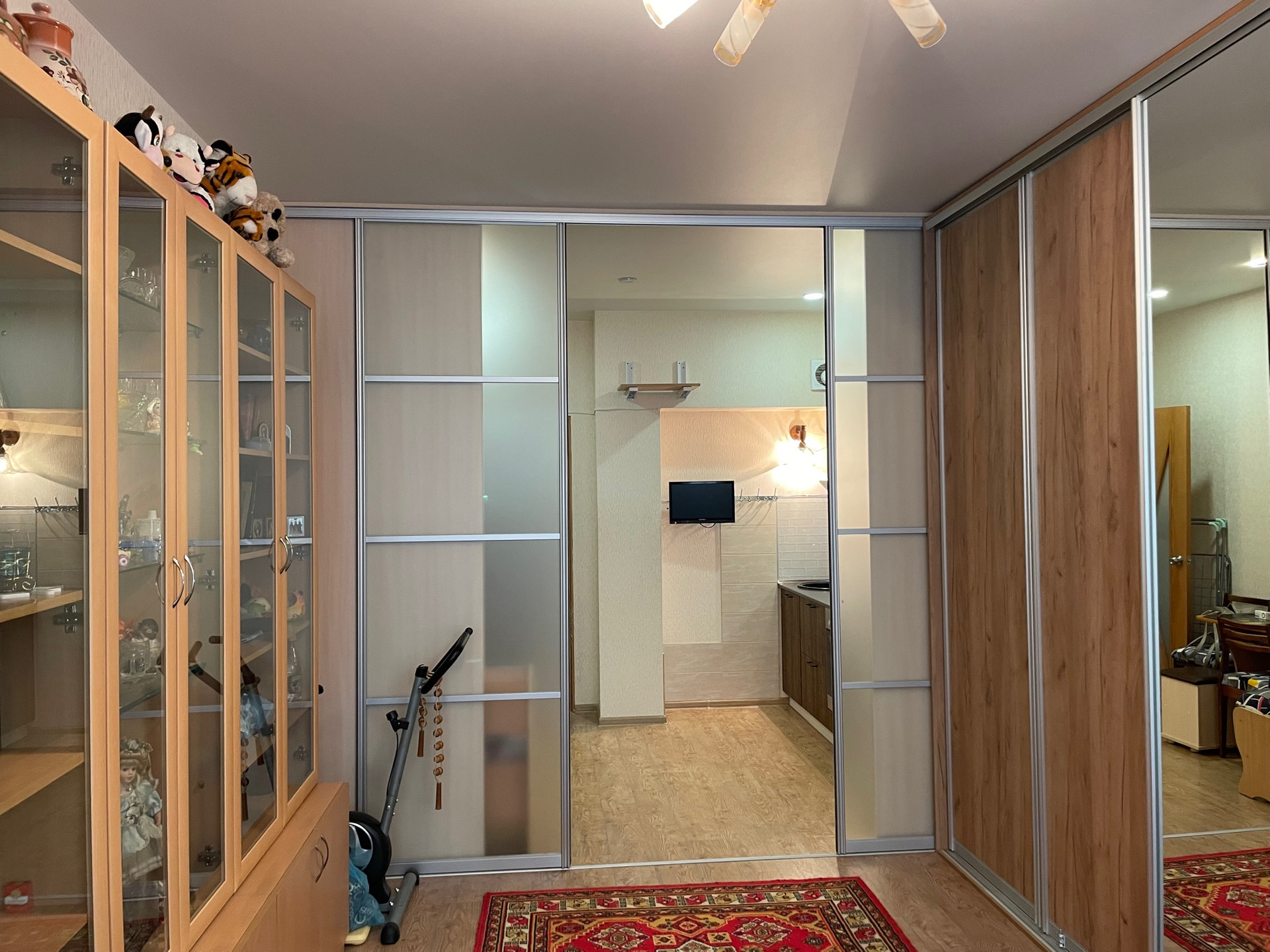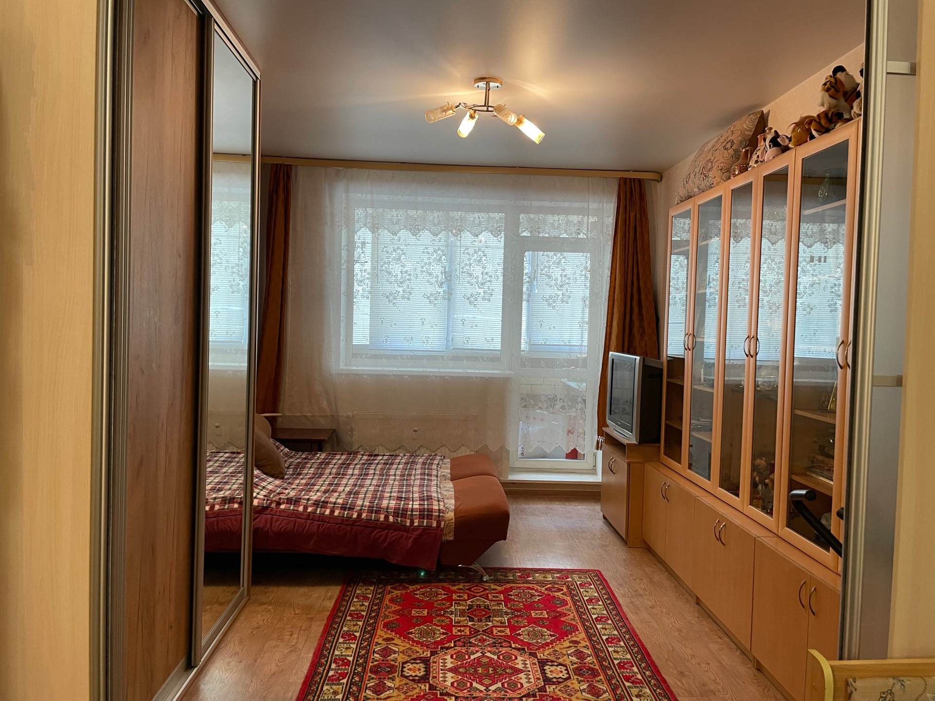 В квартире сделан ремонт: ленолеум на полах, натяжные потолки, виниловые обои, раздвижные двери типа КОМАНДОР между залом и кухней, в санузле кафель на полу и стенах, на балконе и в квартире установлены стеклопакеты, жалюзи на окнах, на балконе сделан пол из дерева, батареи с регулятором тепла.