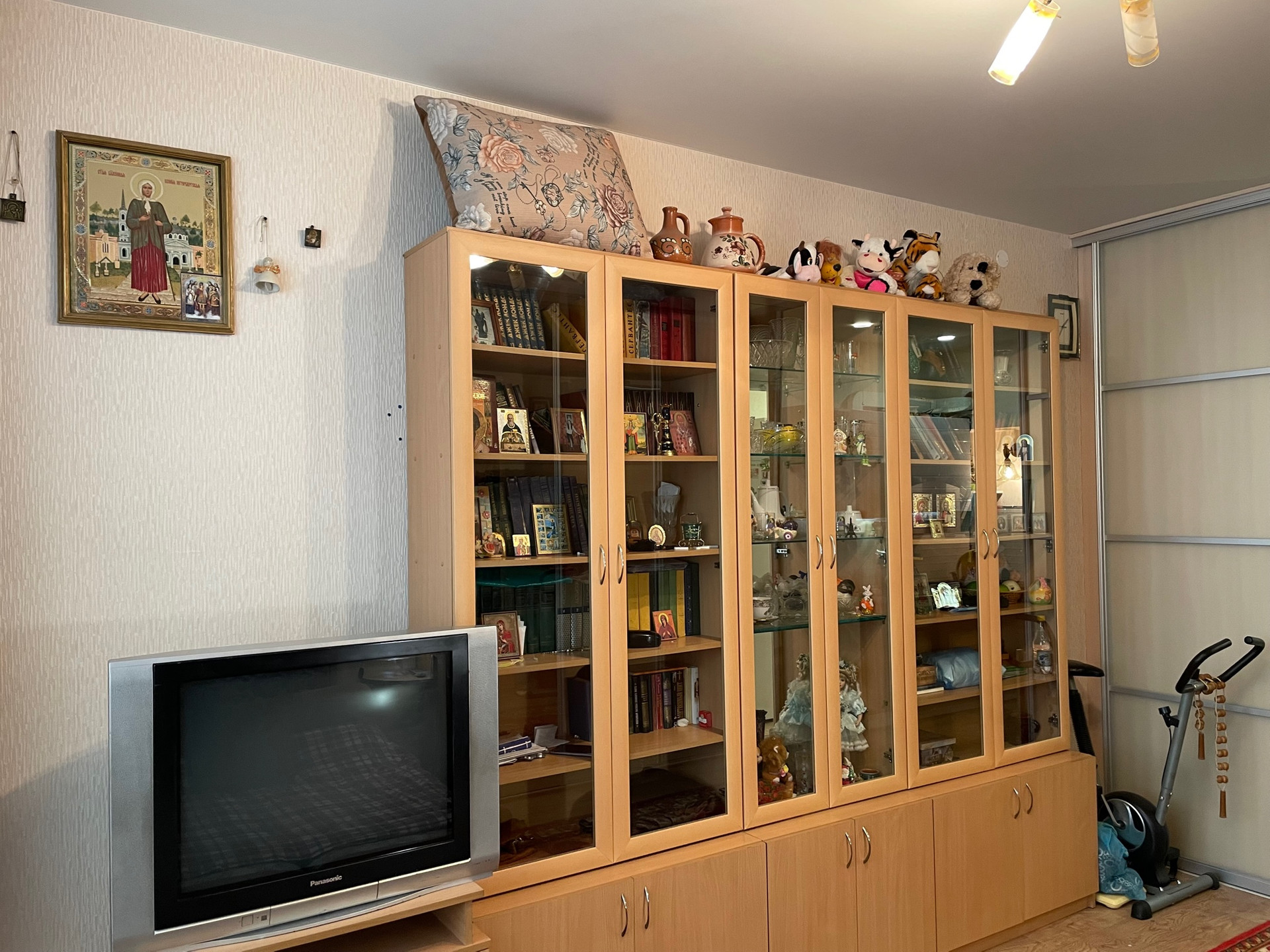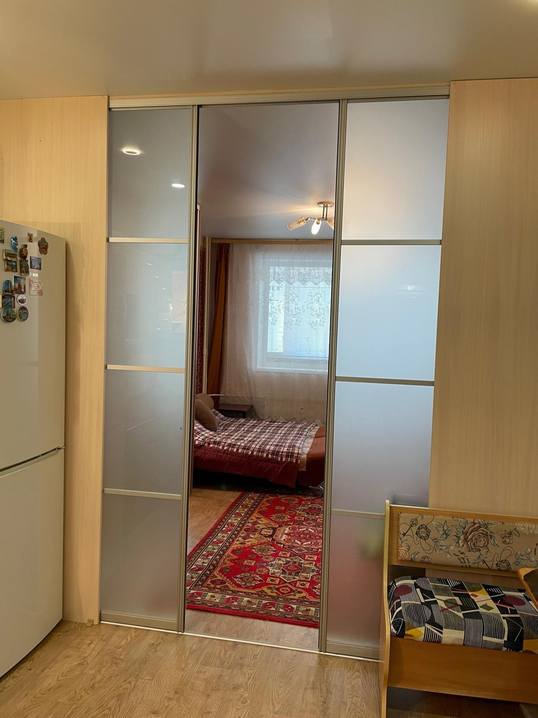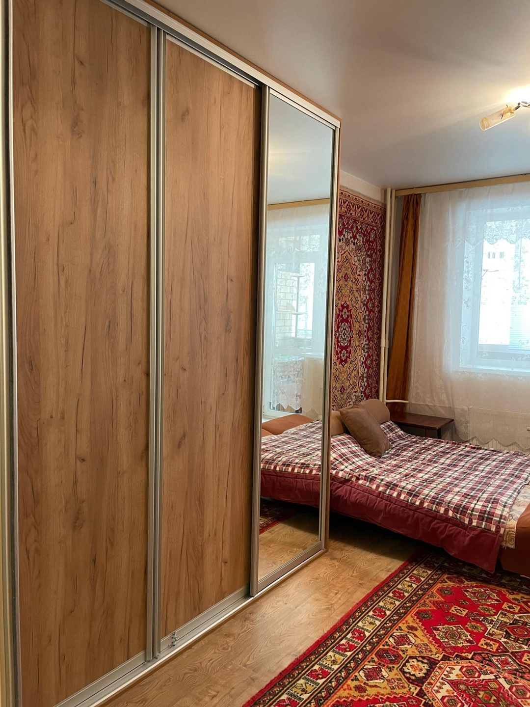 В квартире сделан ремонт: ленолеум на полах, натяжные потолки, виниловые обои, раздвижные двери типа КОМАНДОР между залом и кухней, в санузле кафель на полу и стенах, на балконе и в квартире установлены стеклопакеты, жалюзи на окнах, на балконе сделан пол из дерева, батареи с регулятором тепла.