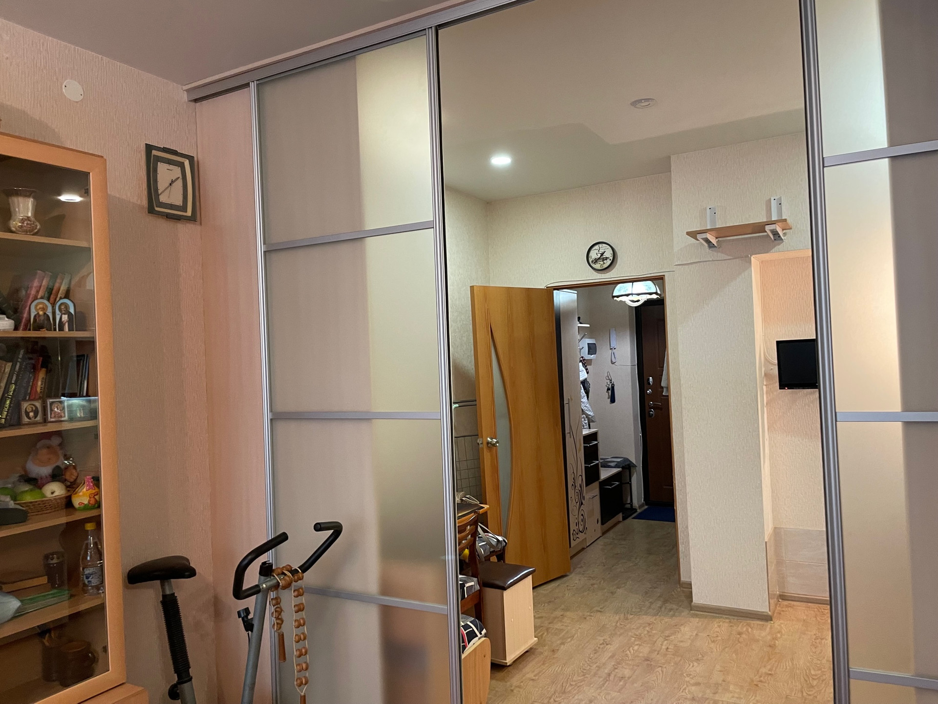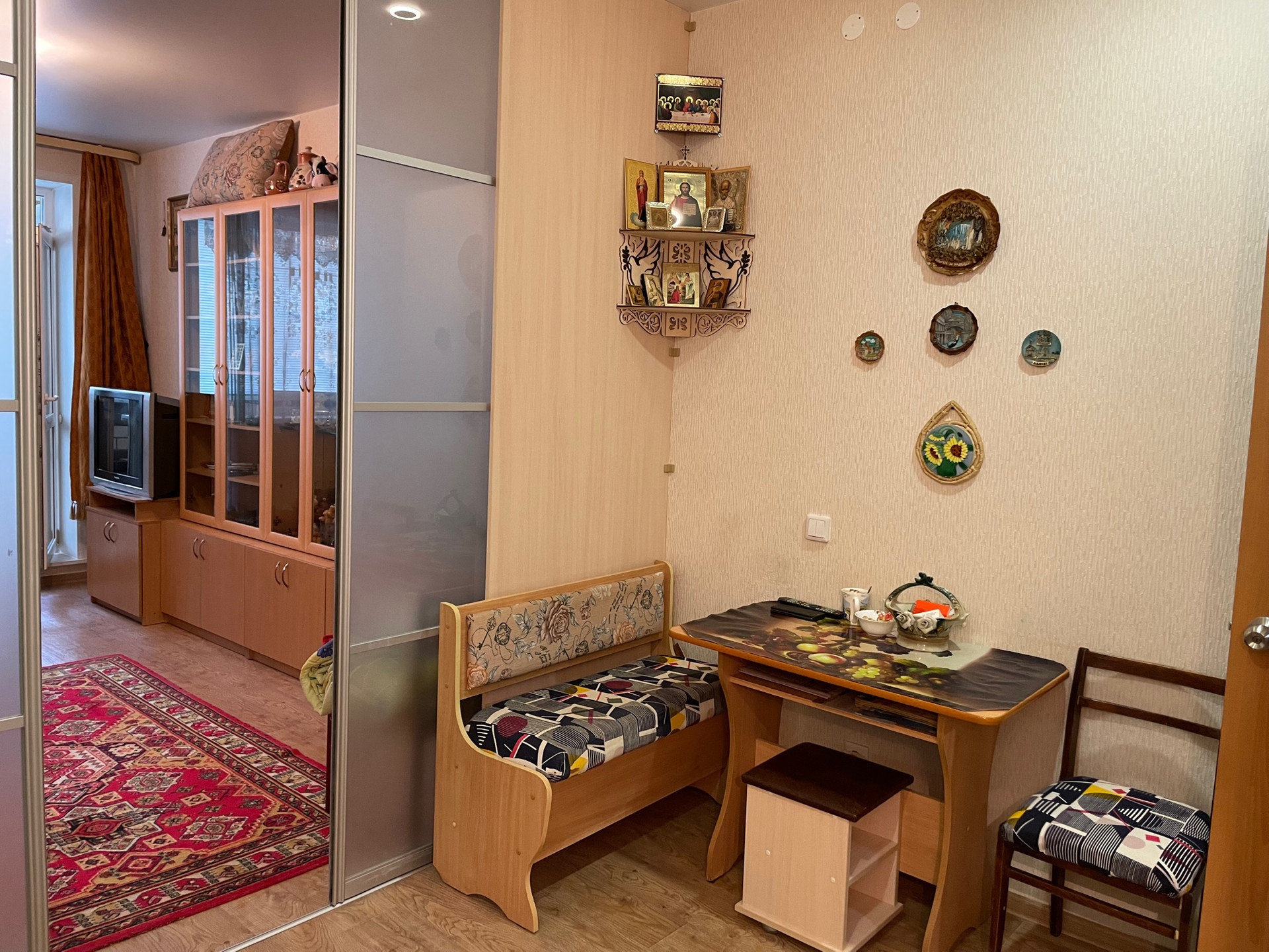 При продаже в квартире остается мебель и техника: шкаф-купе трехстворчатый с зеркалом и с боковыми полочками, нижние столы кухонного гарнитура с электрической варочной поверхностью и с раковиной из искуственного камня со смесителем.