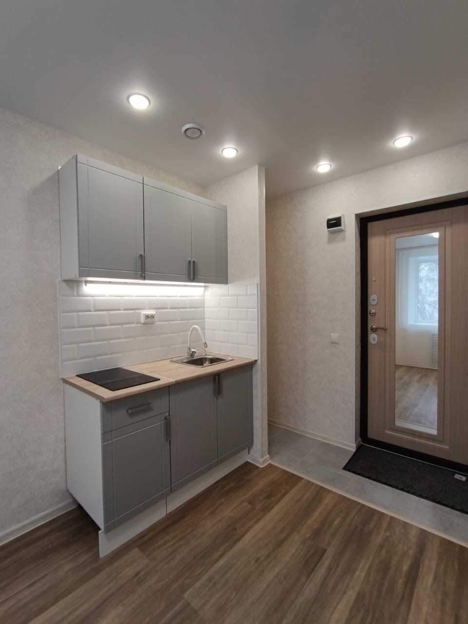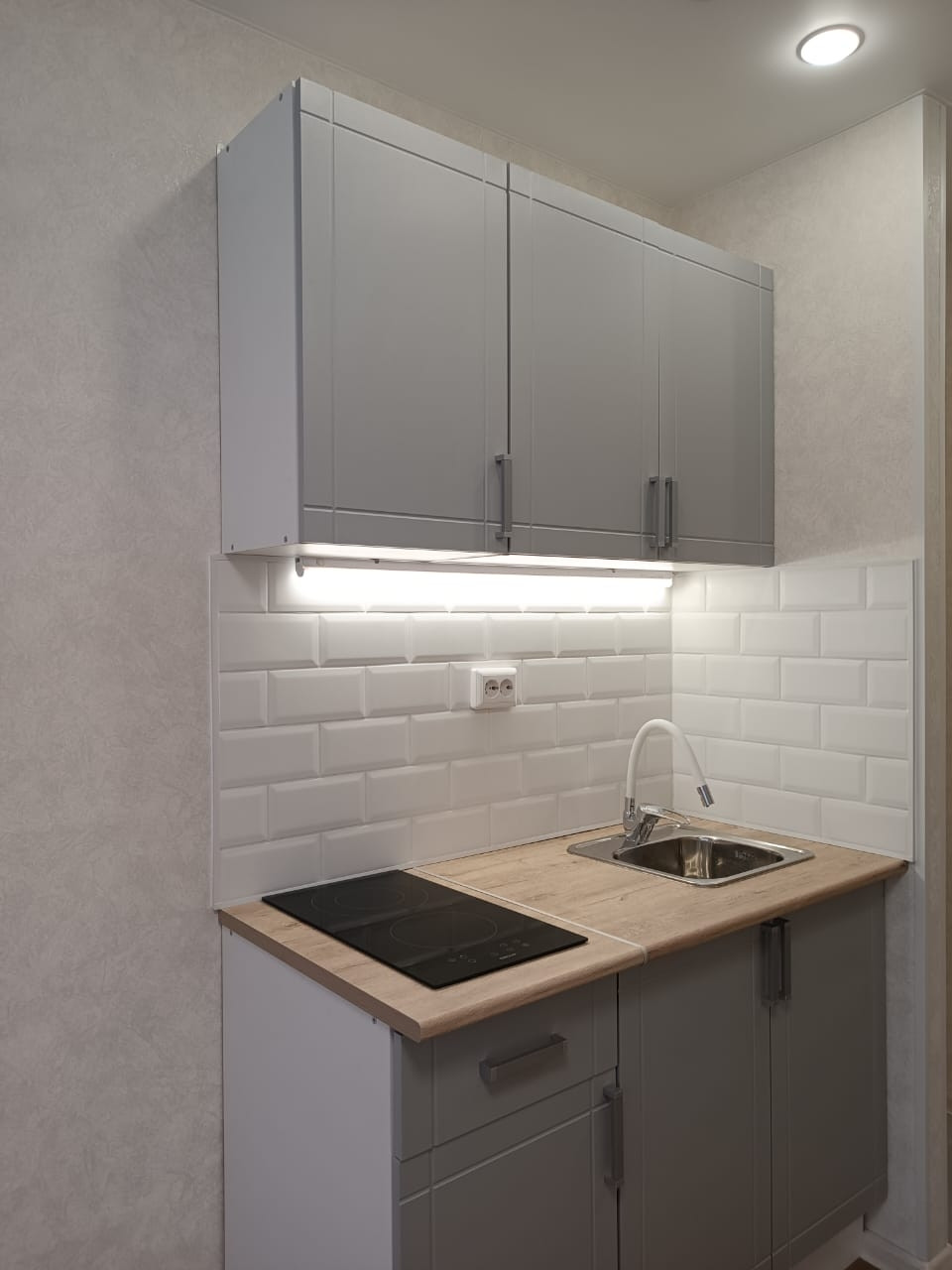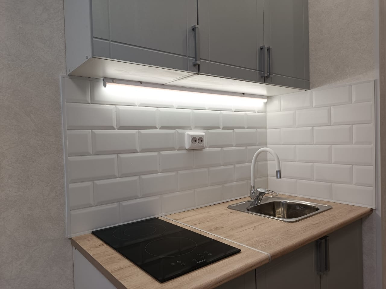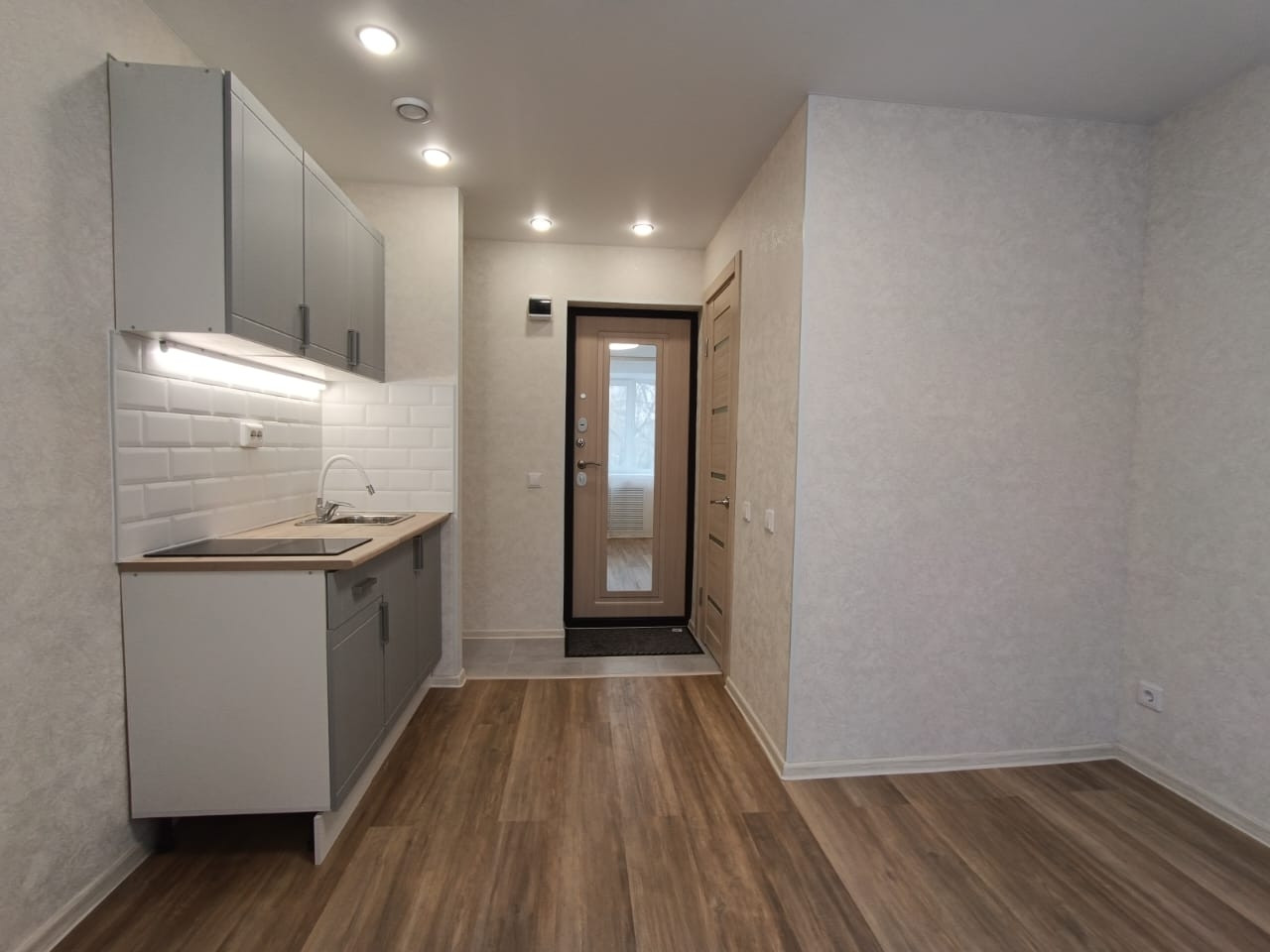 Выделена кухонная зона, куда установлен новый, встроенный кухонный гарнитур с варочной поверхностью и подстветкой.