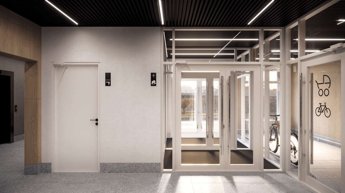 В ЖК выполнен дизайнерский ремонт в местах общего пользования. Сквозные подъезды, вы можете попасть в дом с улицы или пройти через закрытую дворовую территорию. Благоустроенный двор без машин. Без барьерные панорамные входные группы.