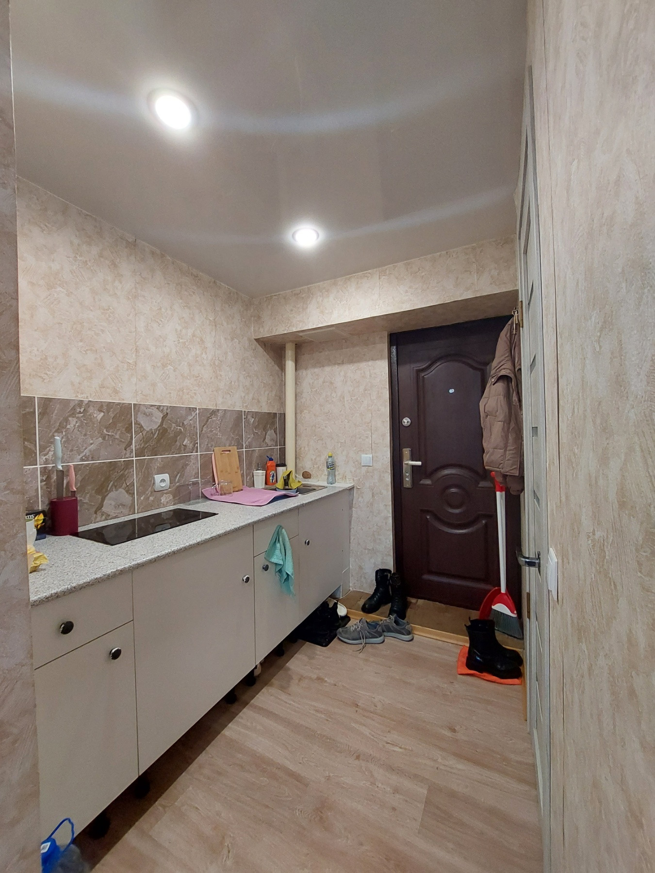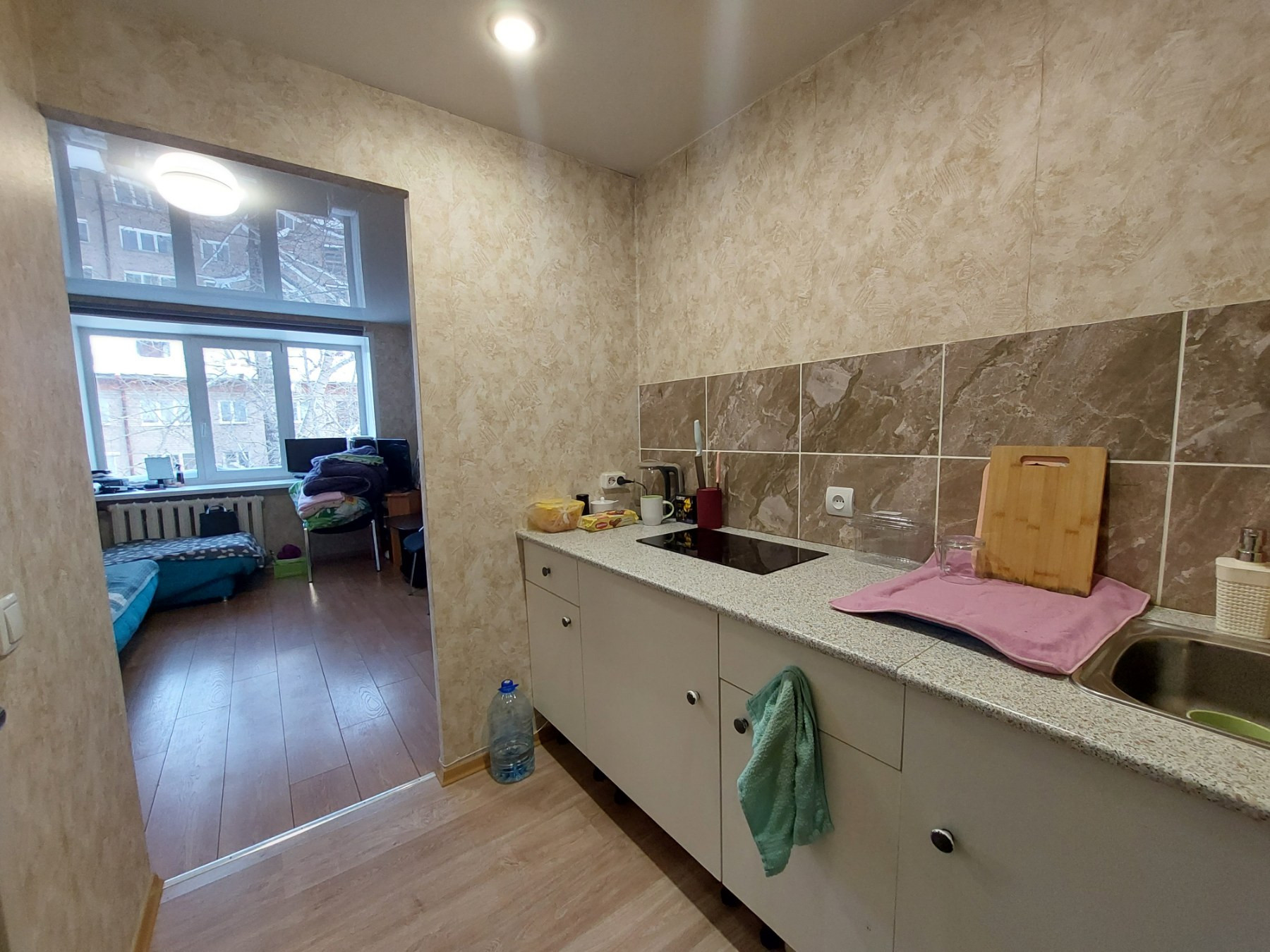 Свежий ремонт, кухонная зона с гарнитуром, санузел в кафеле.
