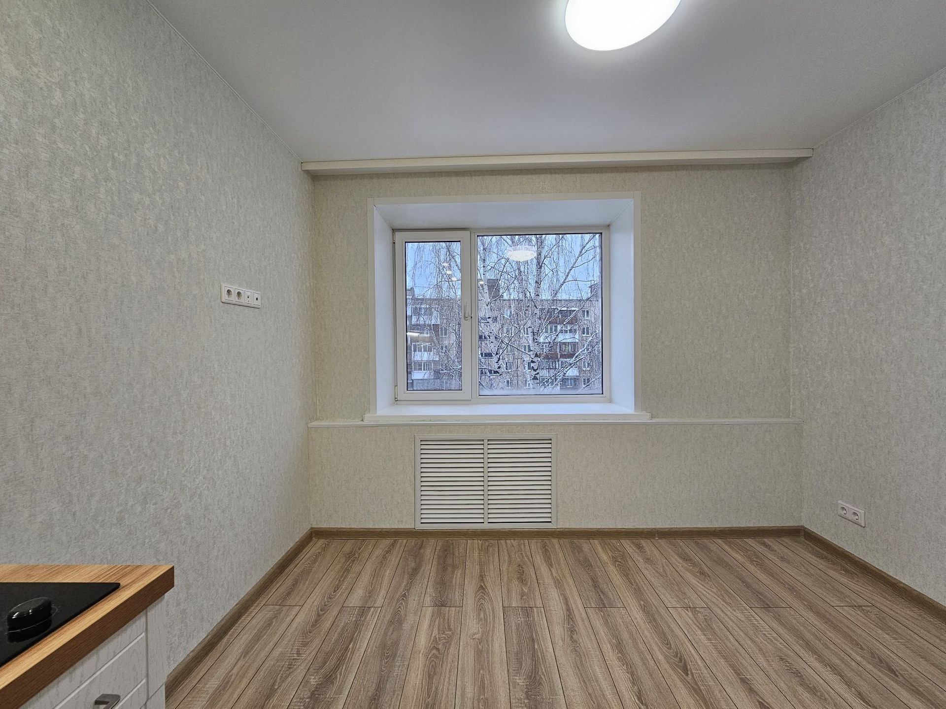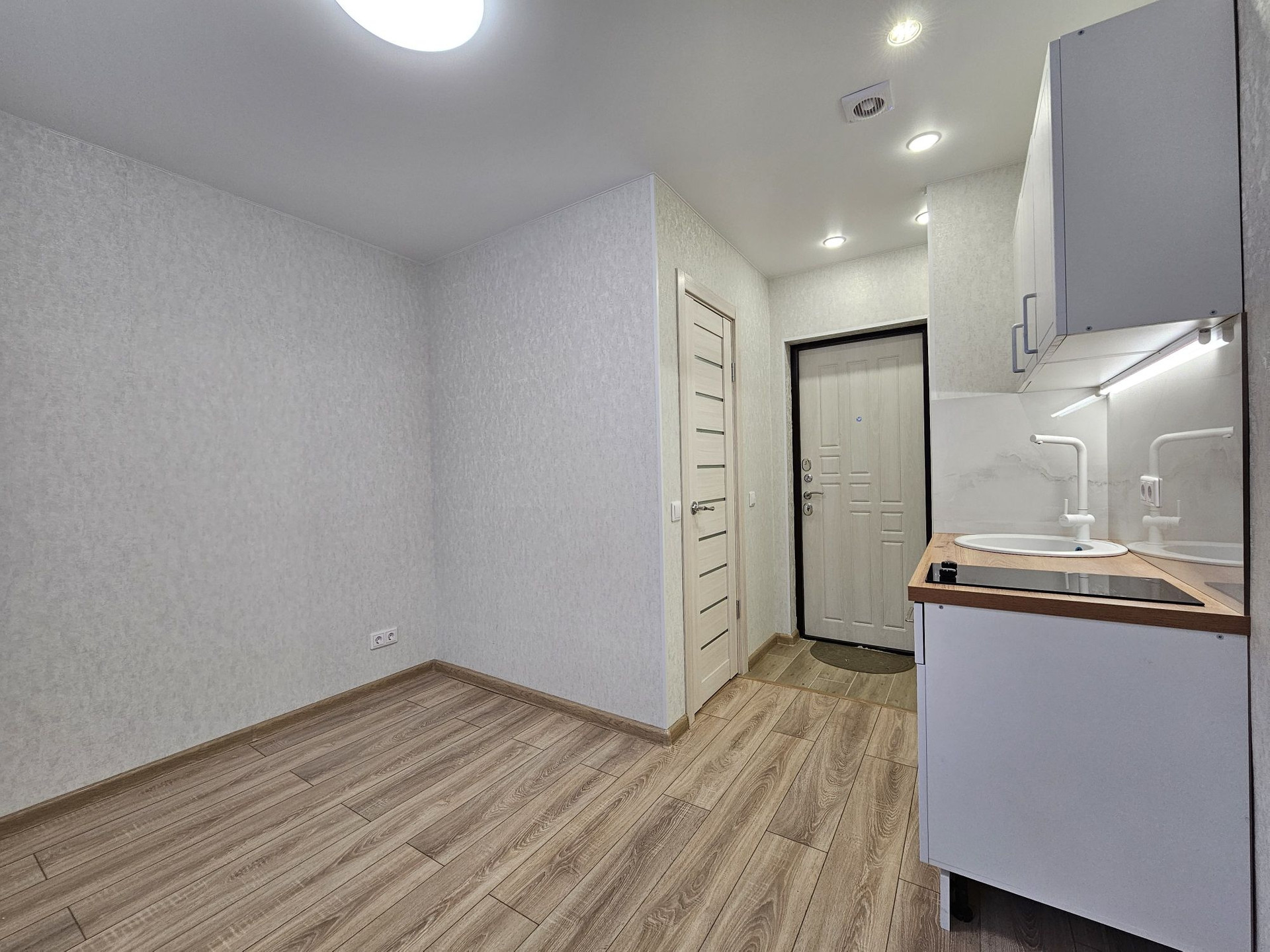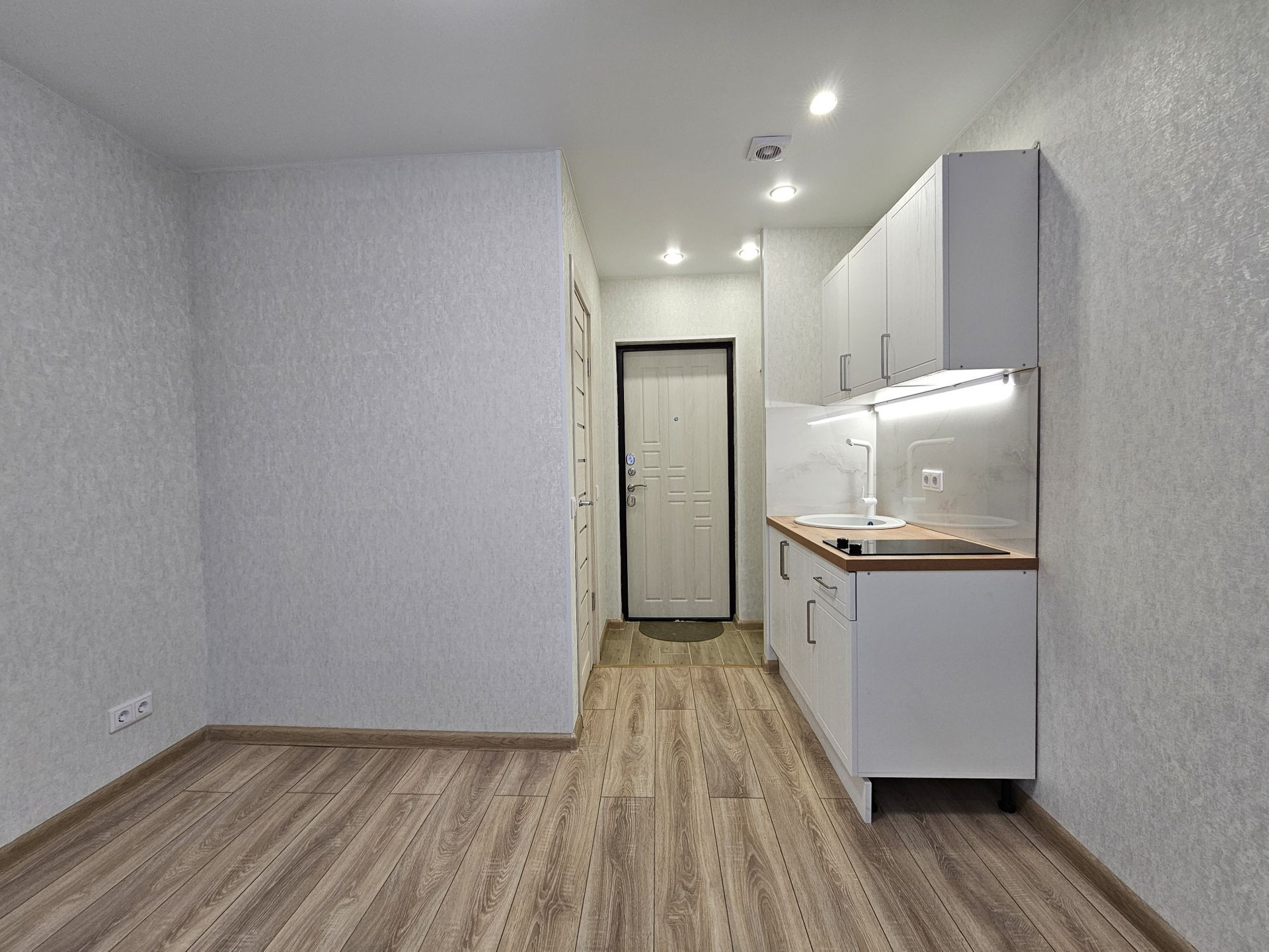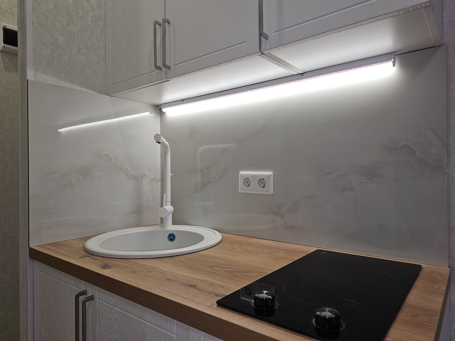 Выделена кухонная зона, куда установлен новый, встроенный кухонный гарнитур с варочной поверхностью и подсветкой.