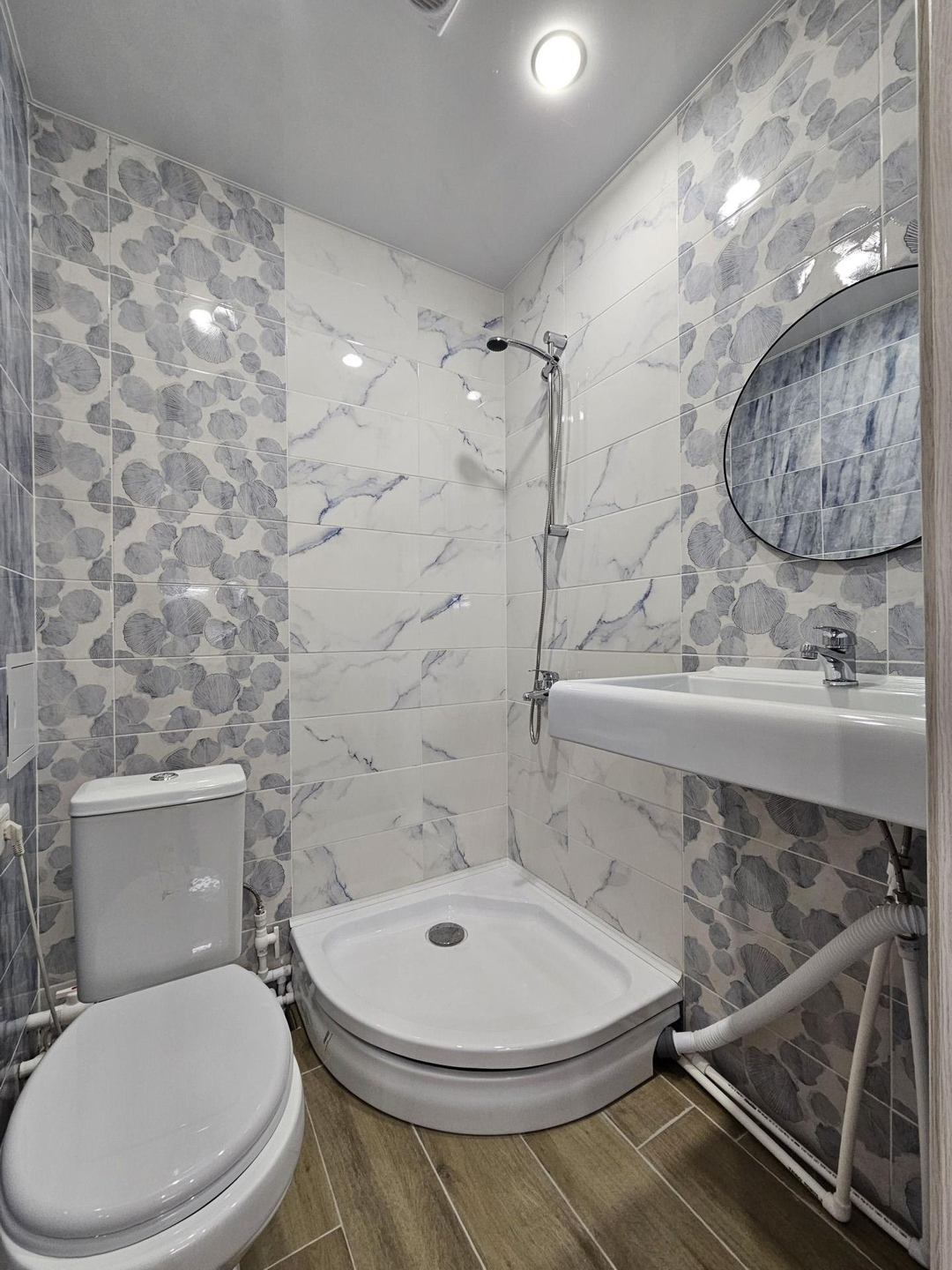 Санузел отделан кафелем, под раковиной оборудовано место под стиральную машину.