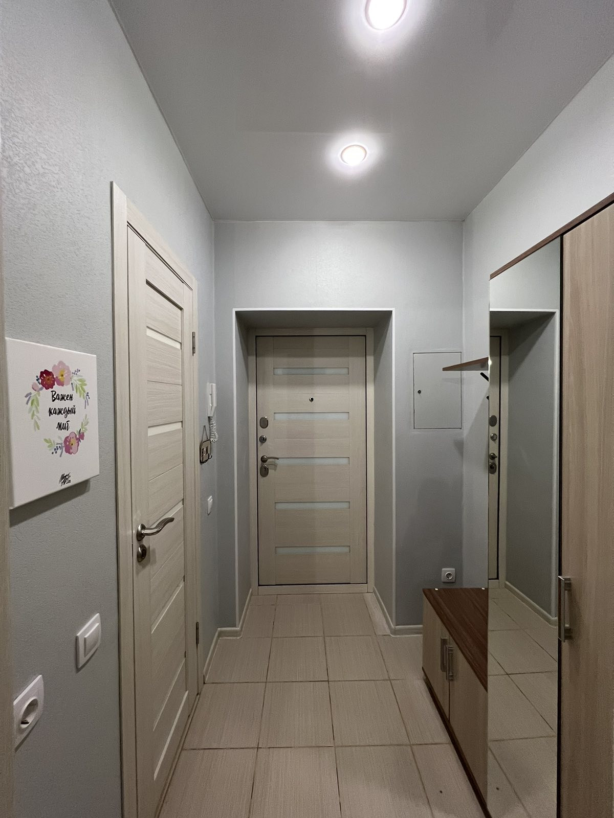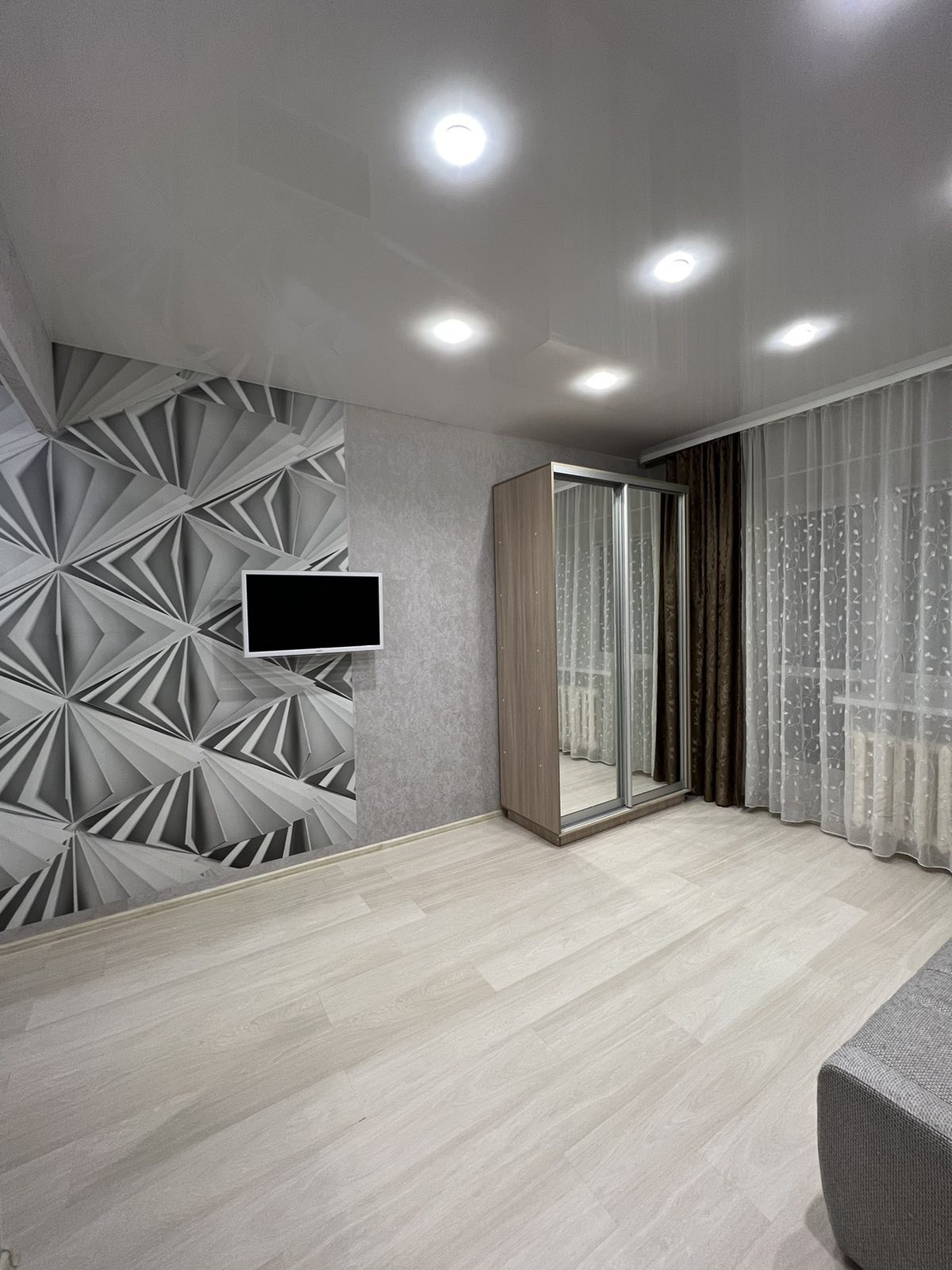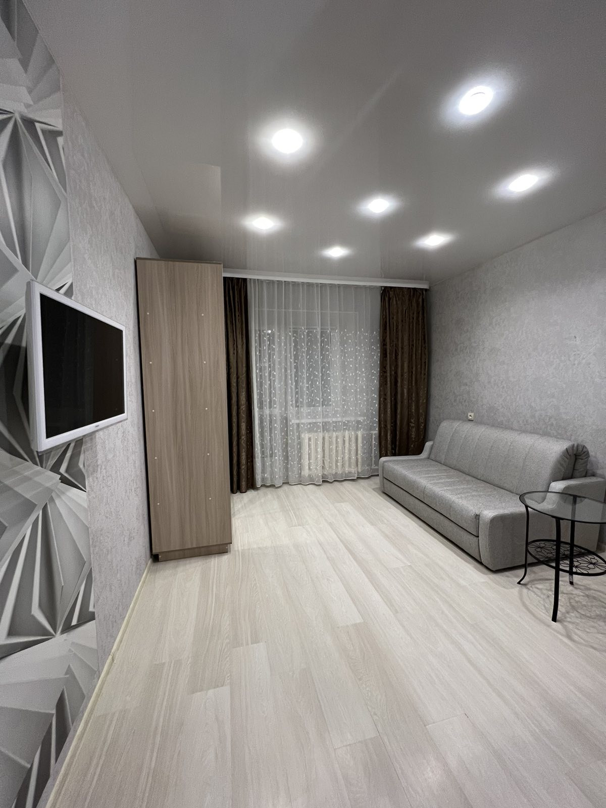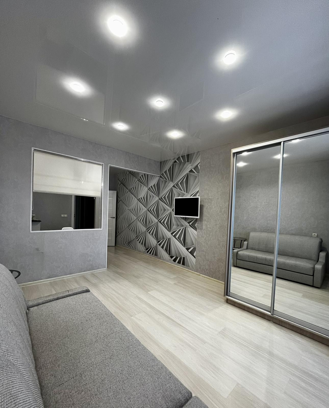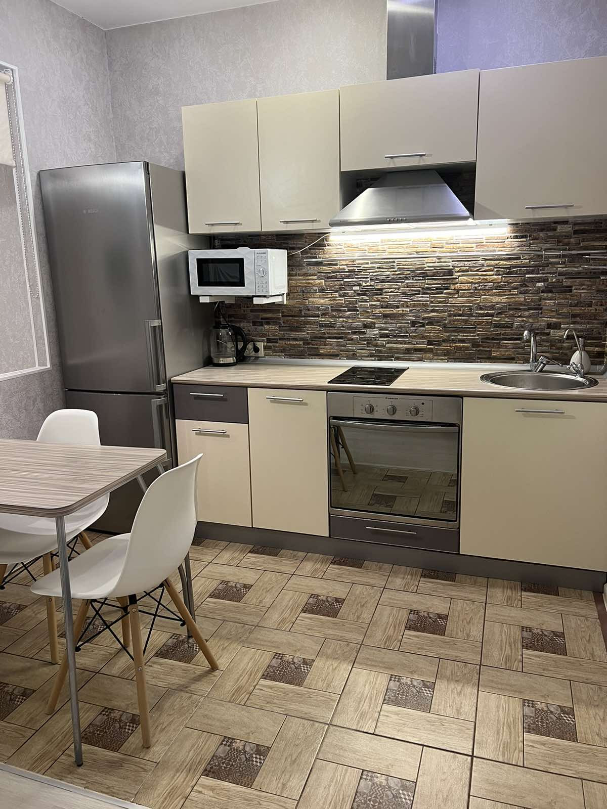 Квартира-студия находиться на 16м этаже с панорамным балконом, но есть технический этаж (17 этаж). Сделан качественный ремонт: в комнате на полу ламинат, плитка на кухне и в коридоре, ванная комната с душевой кабиной, отделка: плитка. Установлены новые межкомнатные двери и новая входная прочная дверь с надежной замковой системой. Везде натяжные потолки и светодиодное освещение. На кухне встроенный гарнитур, индукционная плита, духовка, вытяжка, холодильник, микроволновка - все оставляем новым хозяевам!