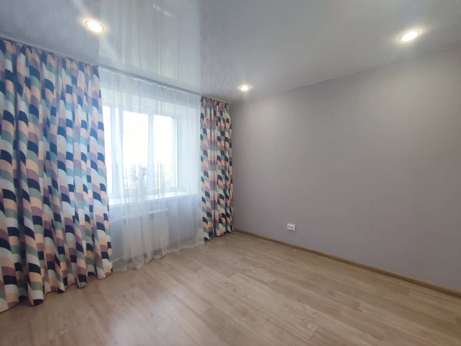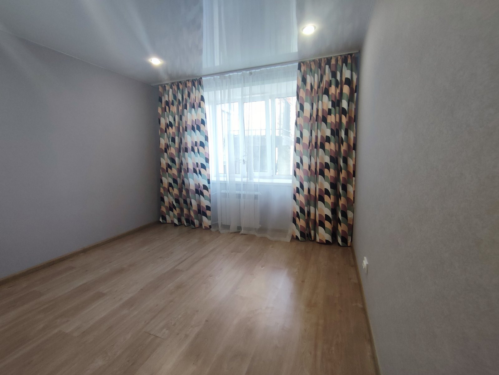 По всей квартире натяжные потолки, со встроенными светильниками, на полу выложен ламинат.