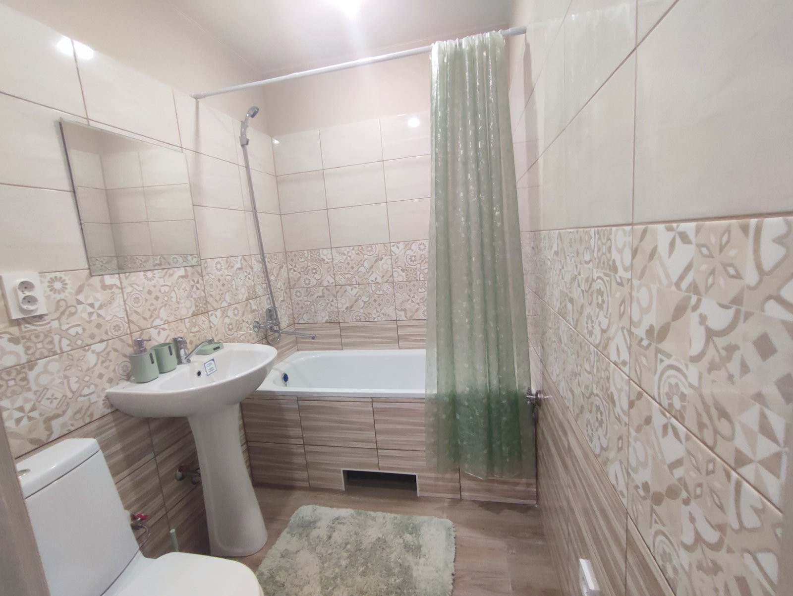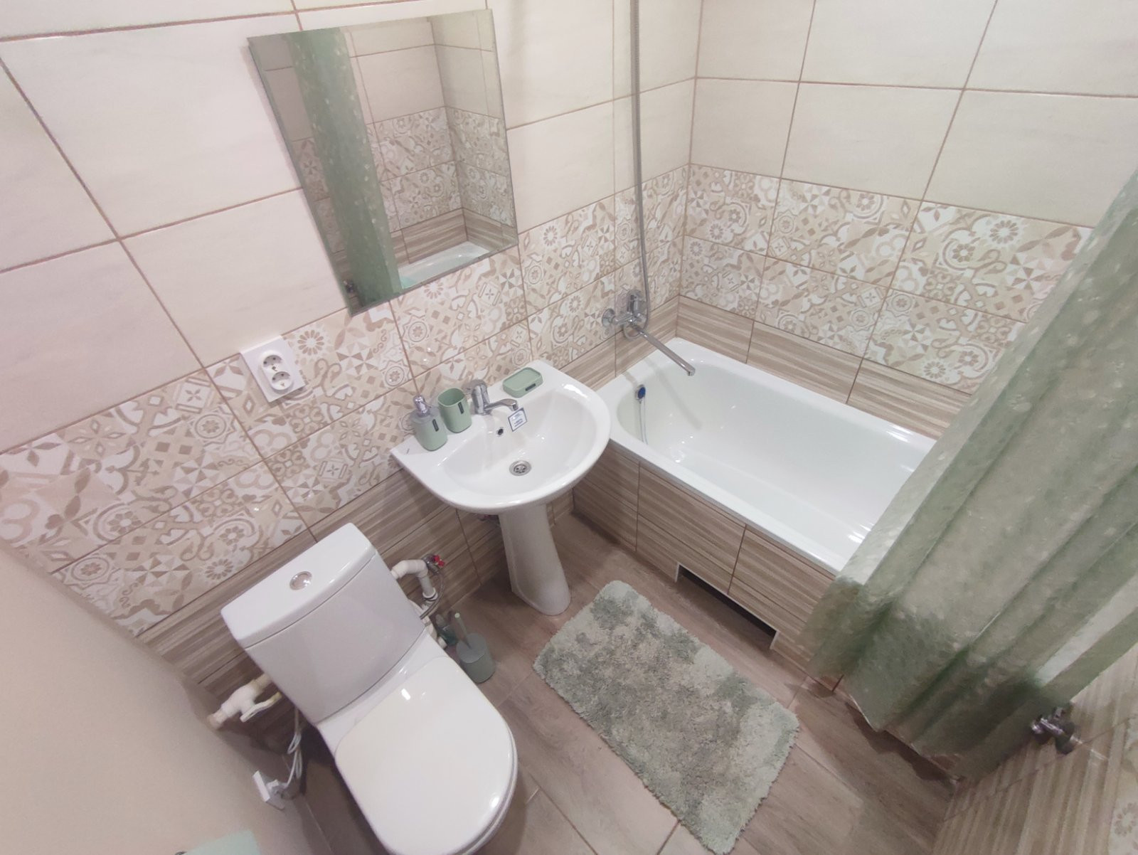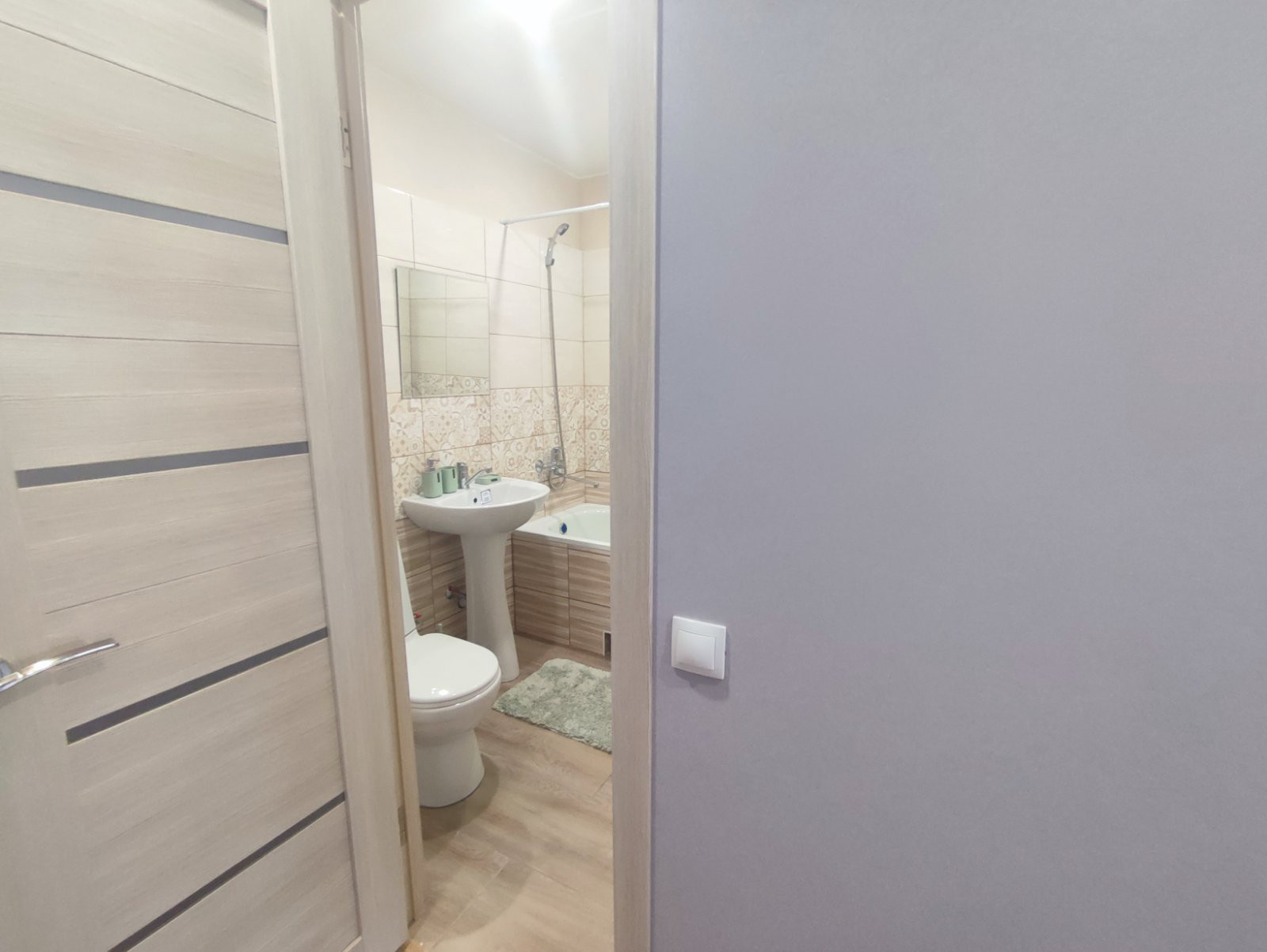 В совмещенном сан.узле установлена новая сантехника, на полу и на стенах в мокрых зонах – кафель, одна стена окрашена устойчивой краской.