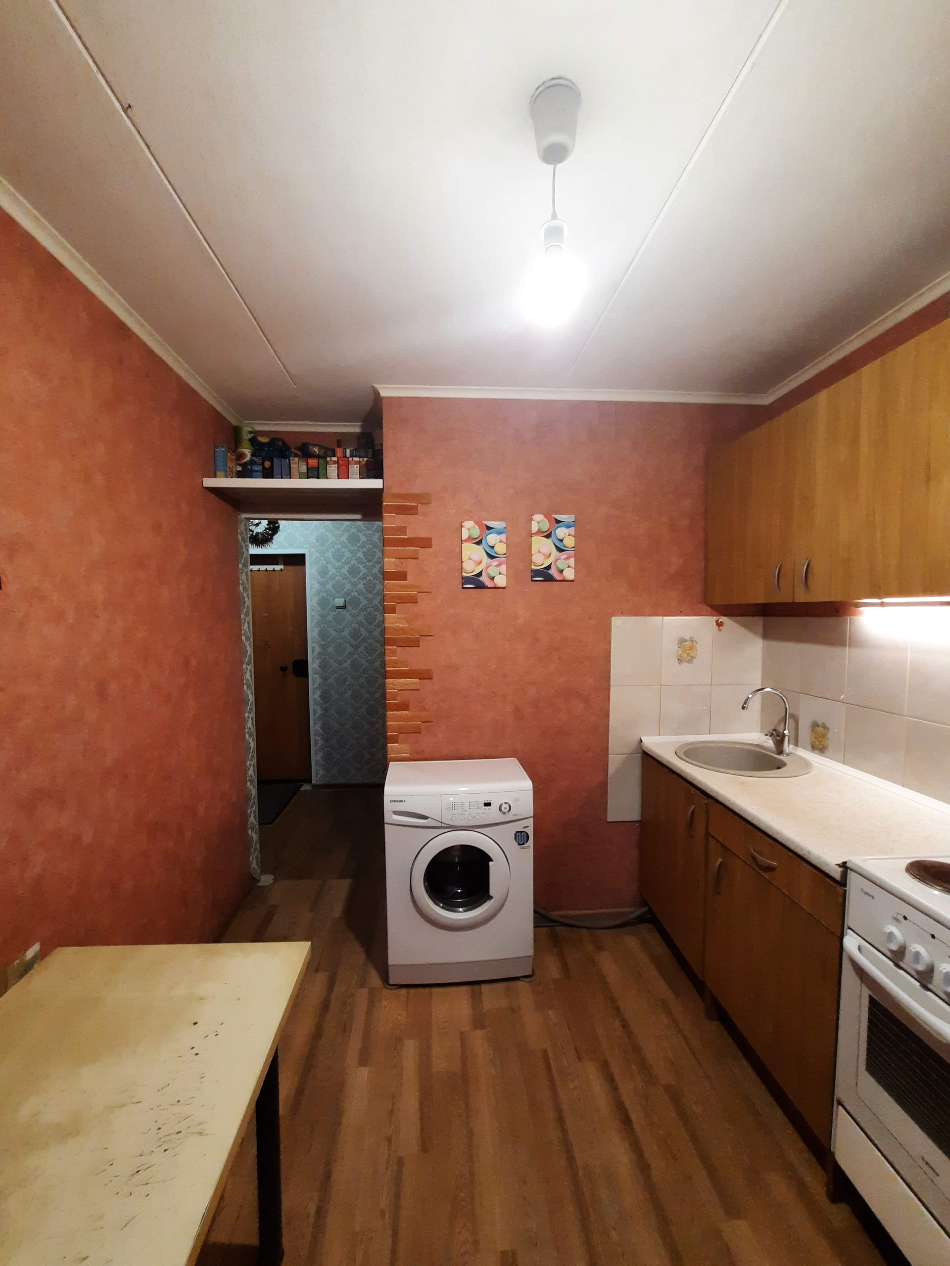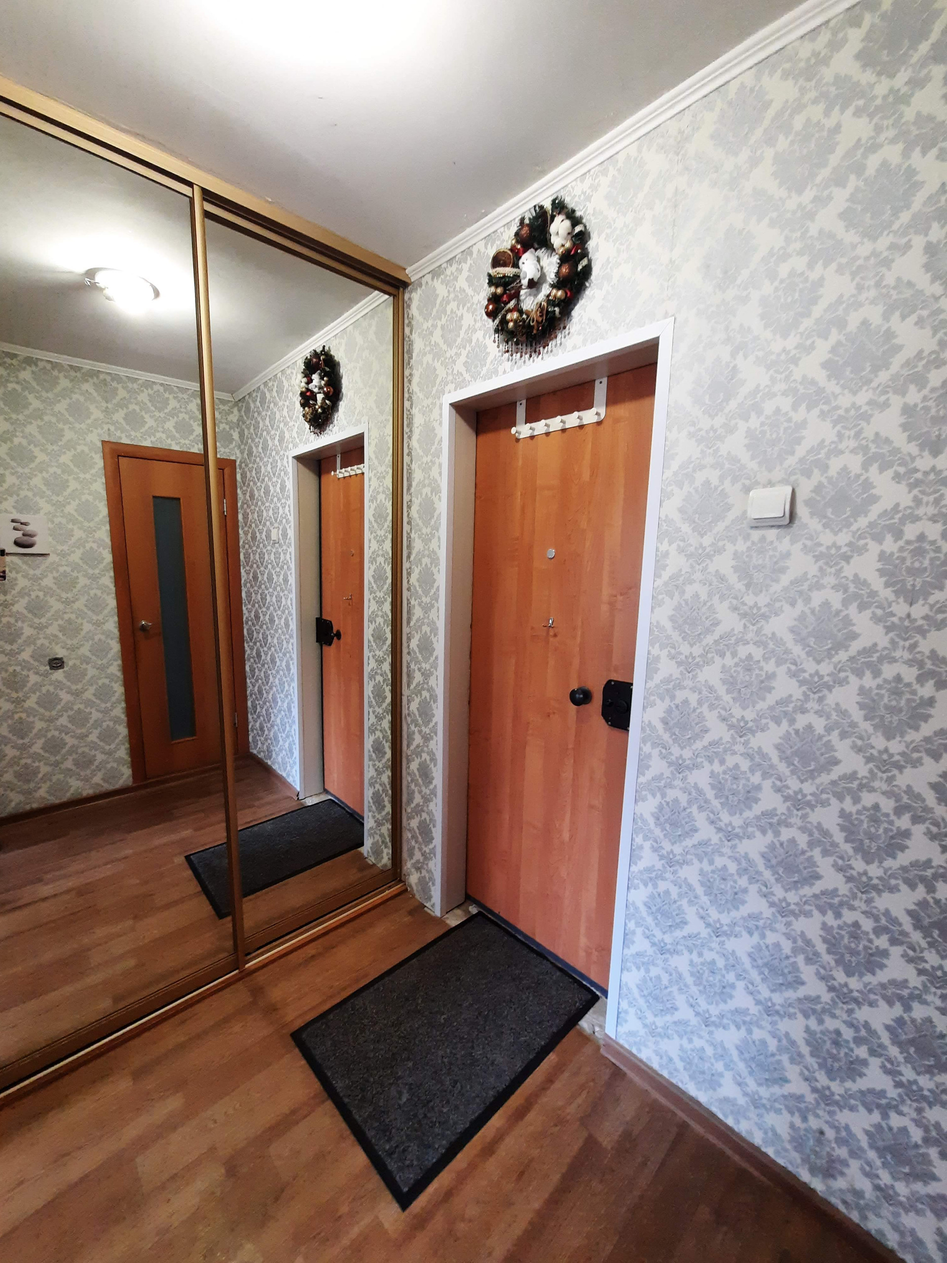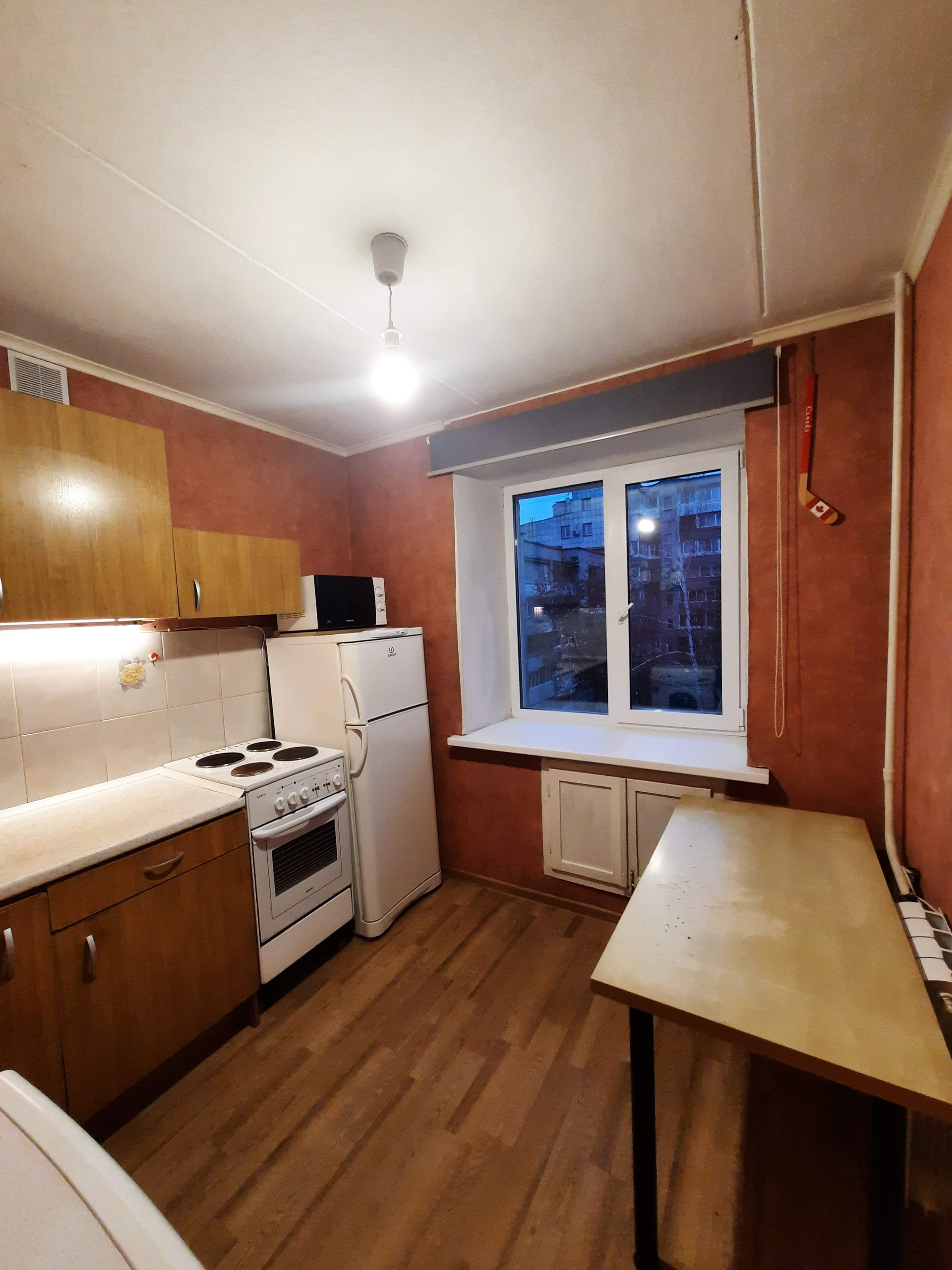 Окна квартиры выxодят во двоp. Остается кухонный гарнитур и шкаф-купе.