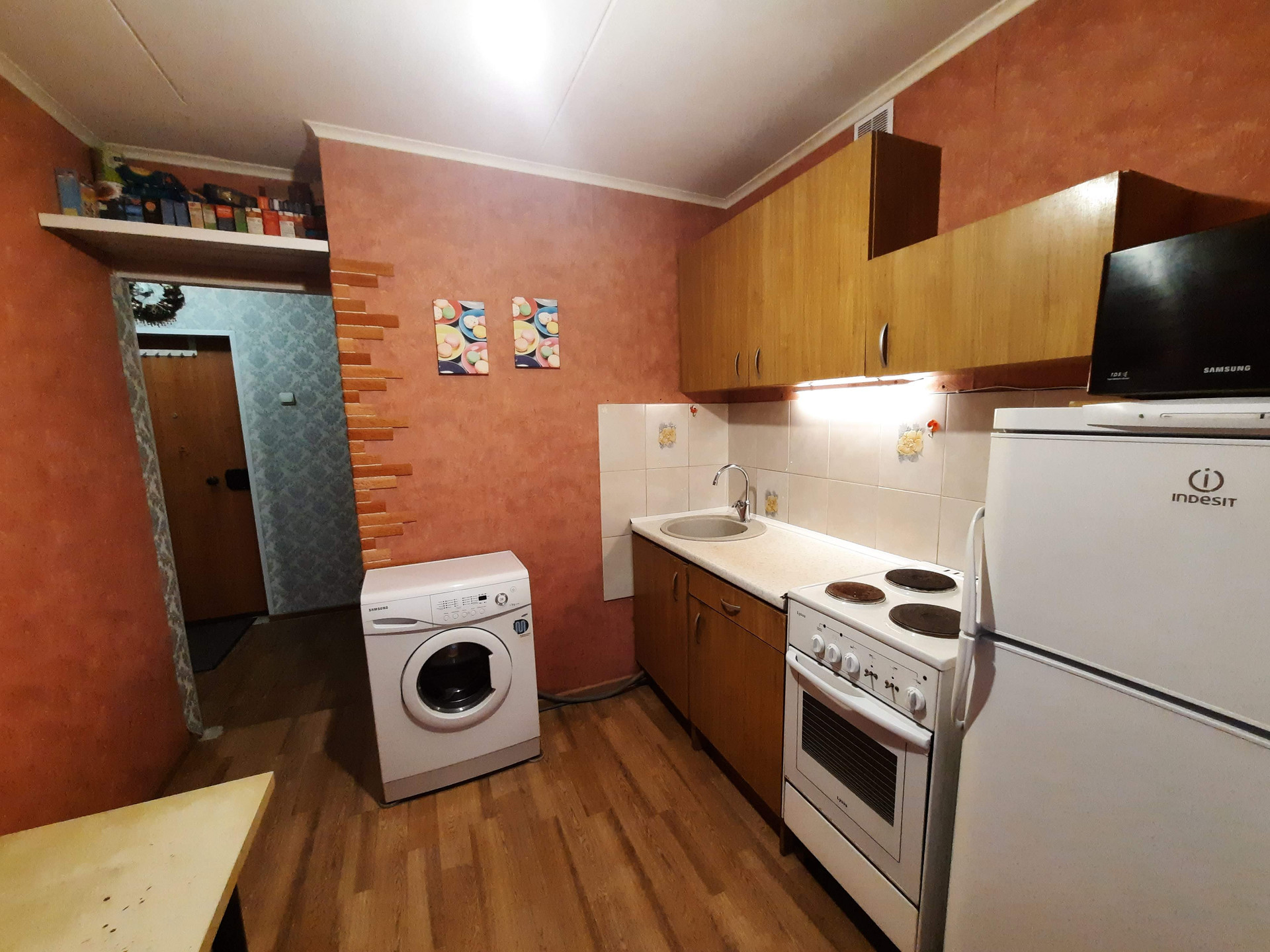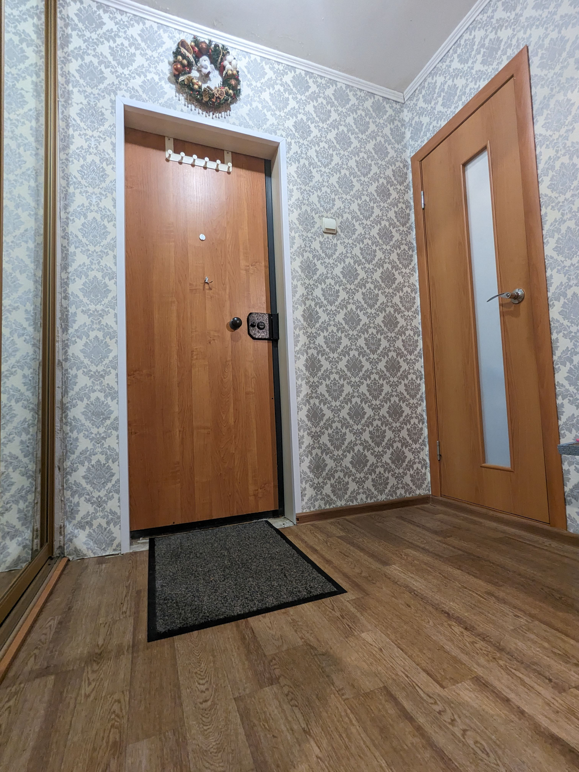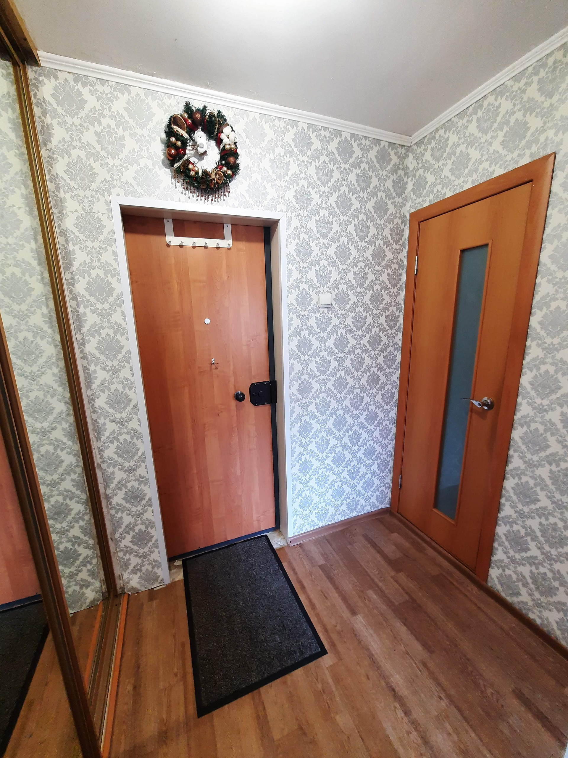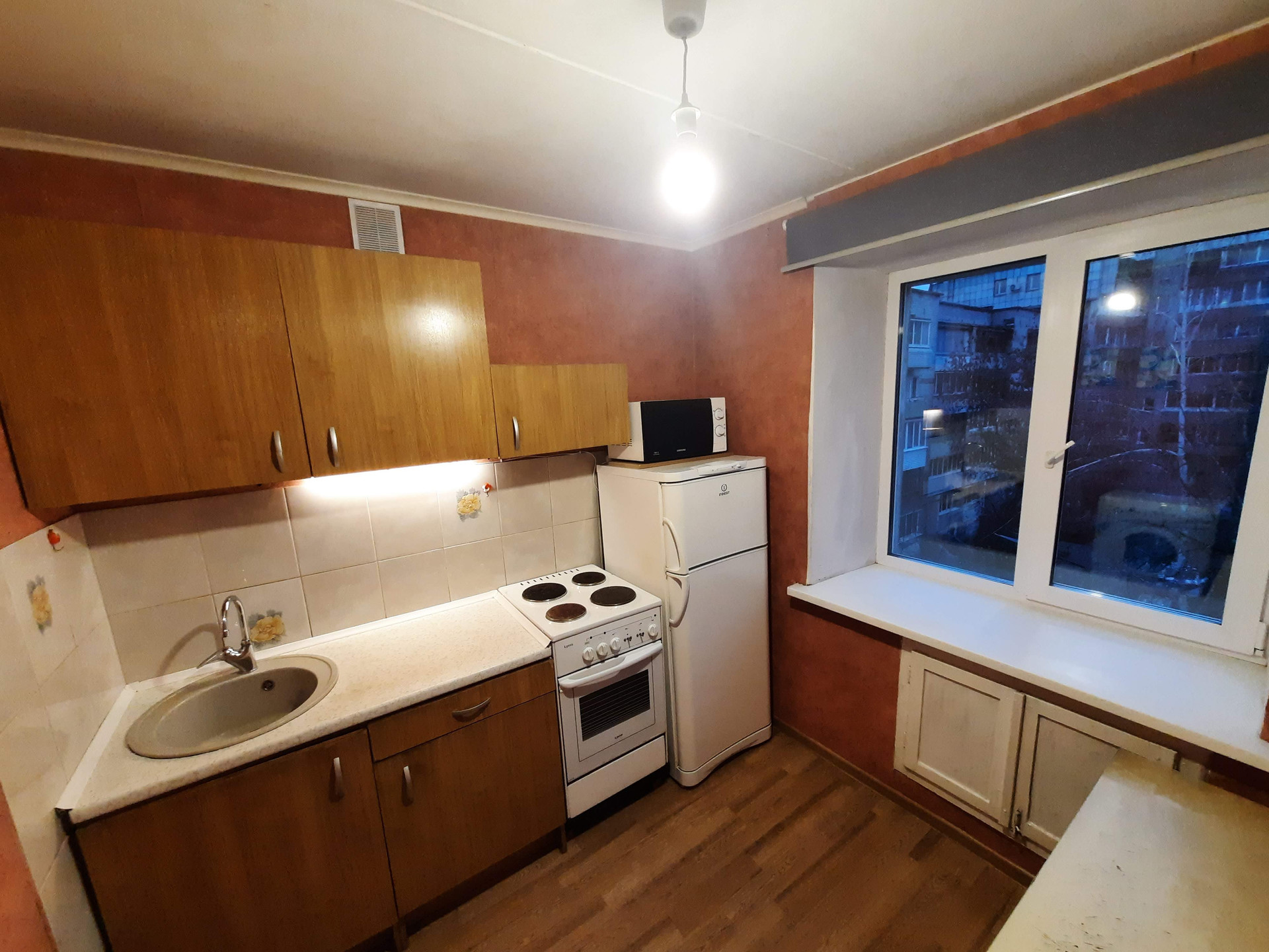 Окна квартиры выxодят во двоp. Остается кухонный гарнитур и шкаф-купе.