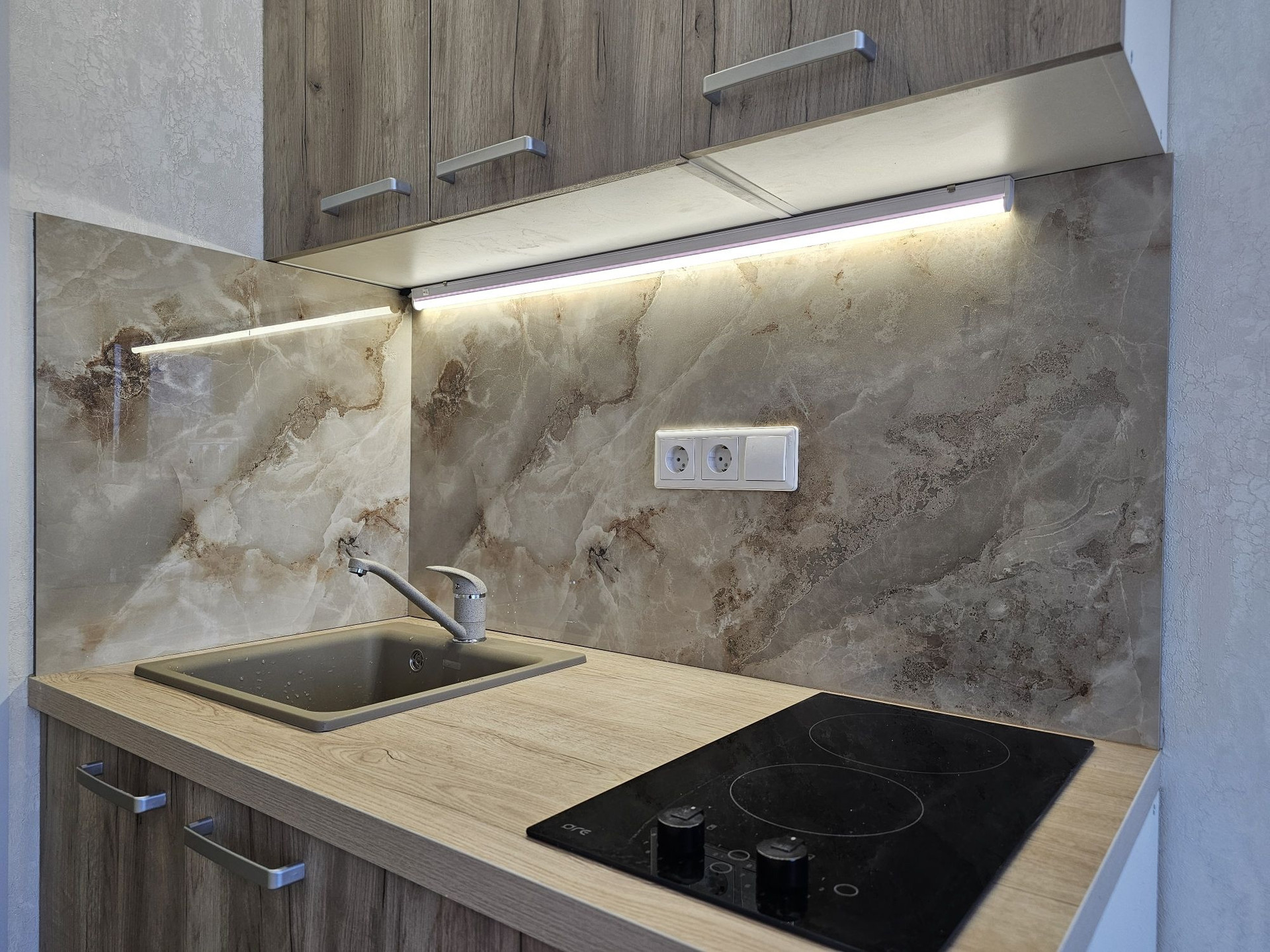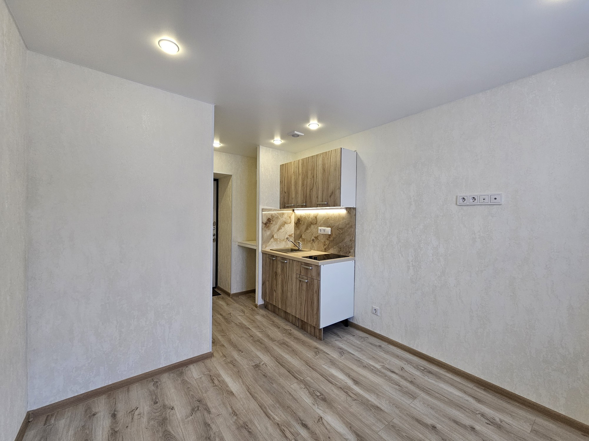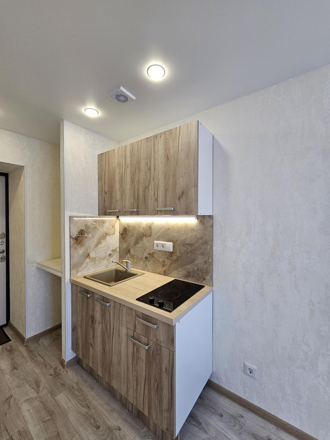 Выделена кухонная зона, куда установлен новый, встроенный кухонный гарнитур с варочной поверхностью и подстветкой.